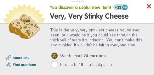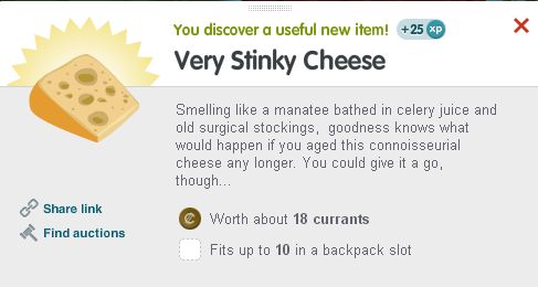 Man kann (vielleicht erst ab dann?) normalen Käse anklicken und weiter altern lassen...einen Stinky Cheese hatte ich noch angedrückt oder so, dann kam ein "Useless Shiny Thing" raus, welches laut Info so gar keinen Nutzen hat. :gruebel