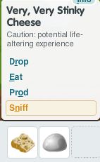 Da ich auch einen Very, Very Stinky Cheese bei mir im Haus an der Eingangstür hingestellt habe, ein wichtiger Hinweis: An dem Teil nur rumspielen, wenn man über 100 Energy und Mood hat.