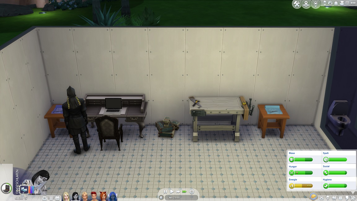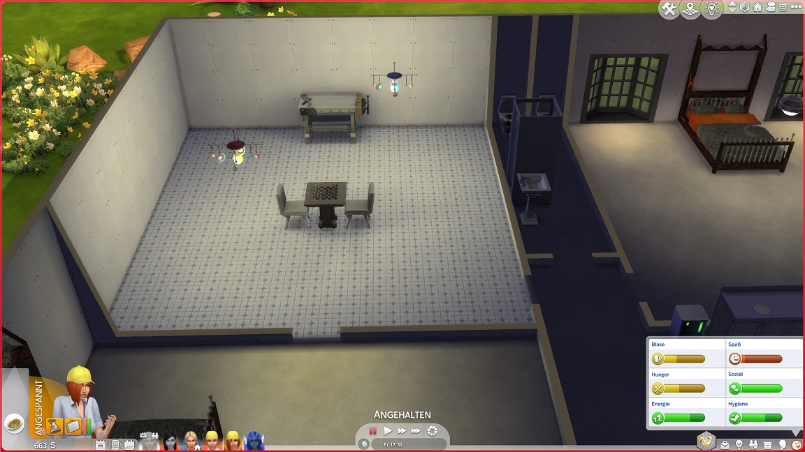 Der erste nimmt dabei erste Formen an. Der "Maschinenraum" (lies: für alles mit Konzentration) erhält einen schicken, angenehmen Boden und die von Telys benötigte Werkbank. Schließlich wandert auch das Schachbrett dorthin. (Der Trophäenschrank (ohne Wertbonus) erhält einen Platz an der Theke an der Gegenseite des Mülleimers und verschwindet direkt auf unerklärliche Weise.)
