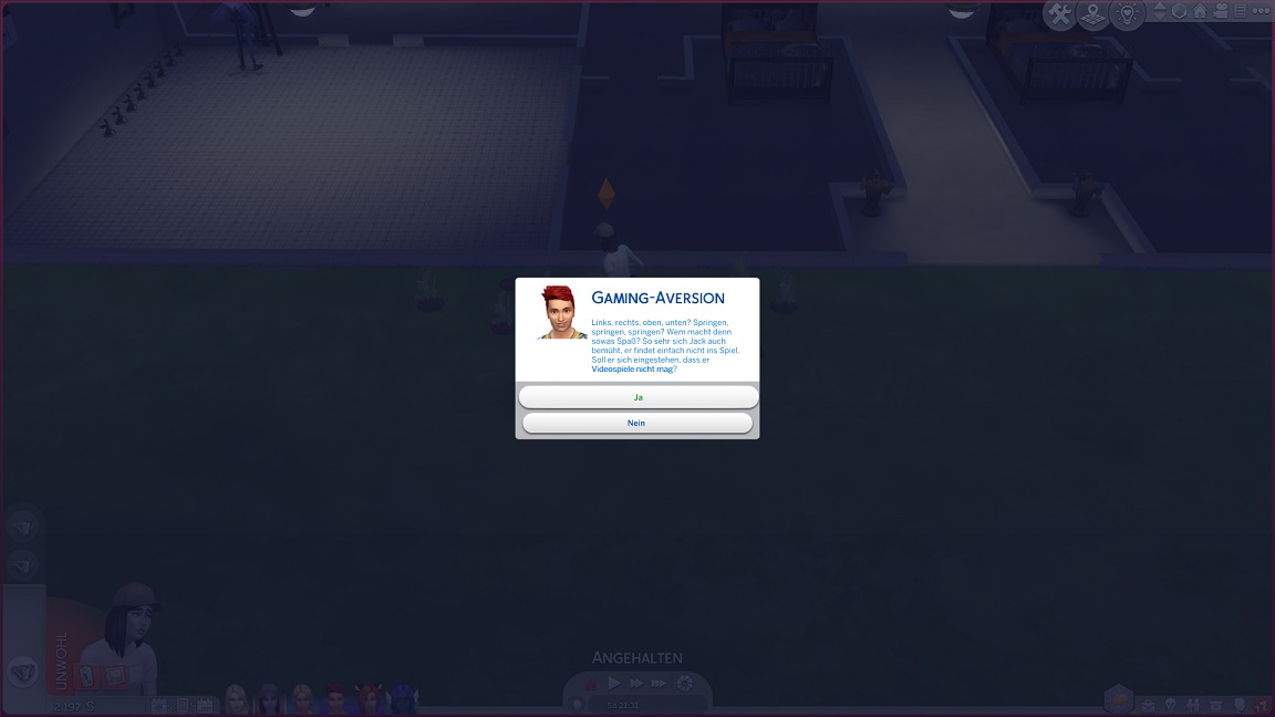 (Das Spiel täuscht auf diese Art Bewegung in der Restwelt vor, ohne diese direkt zu simulieren; die andere häufige Frage behandelt Berufswechsel.)