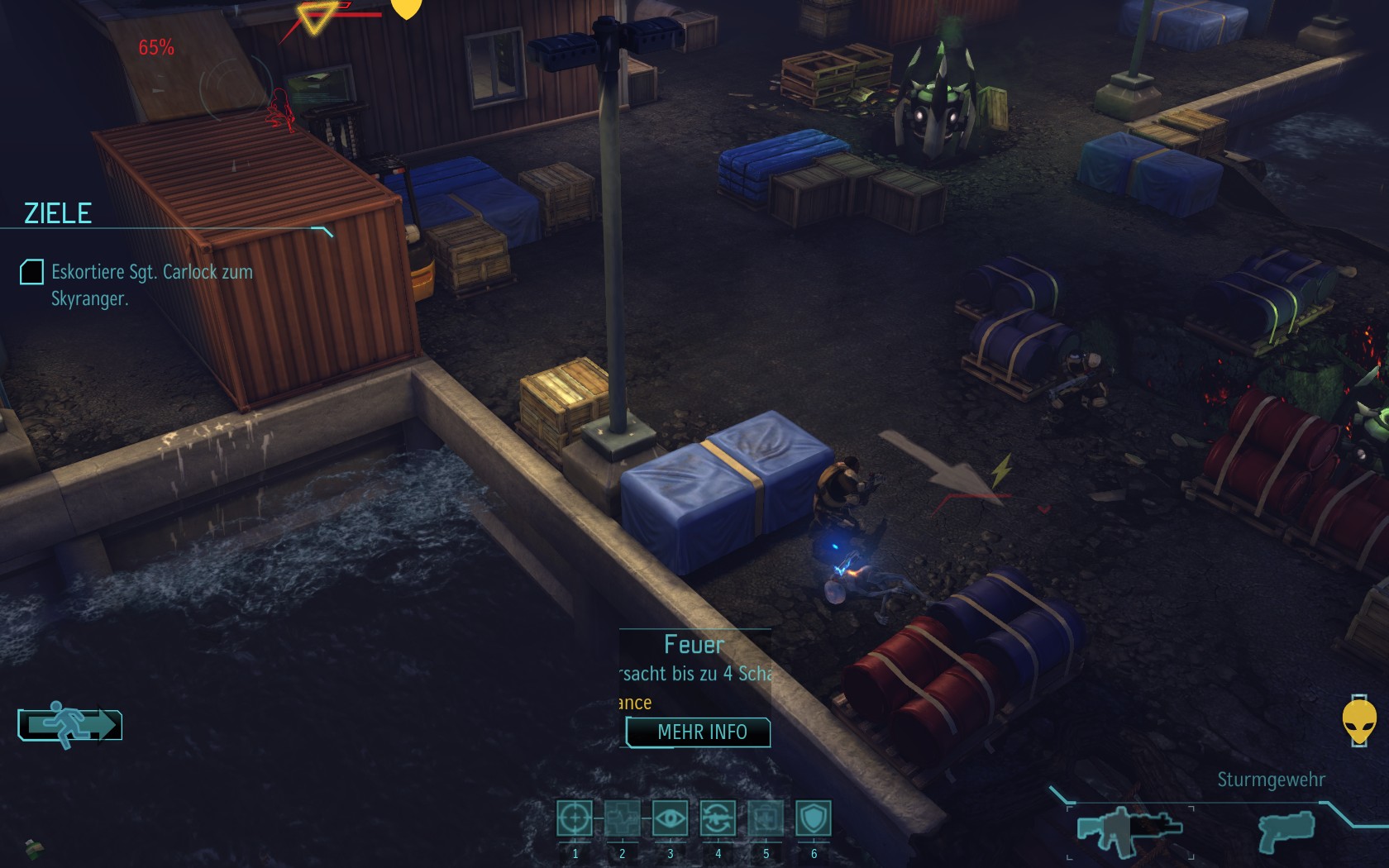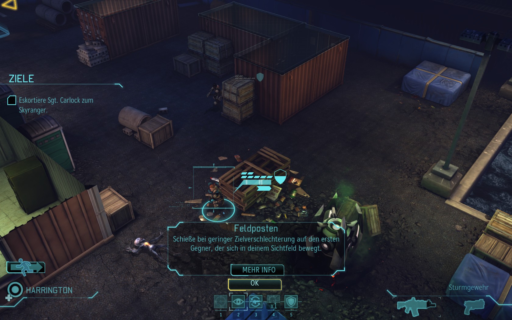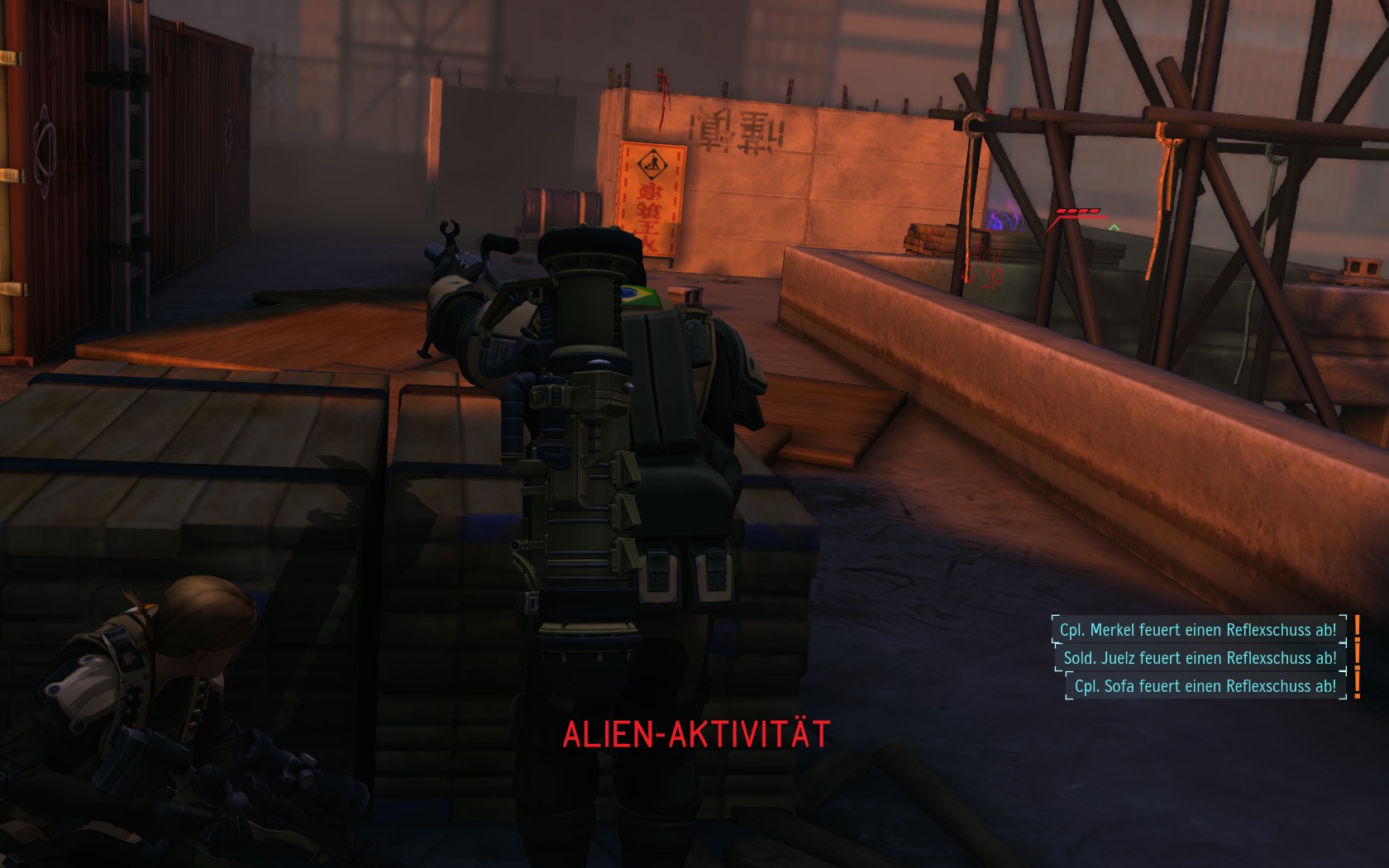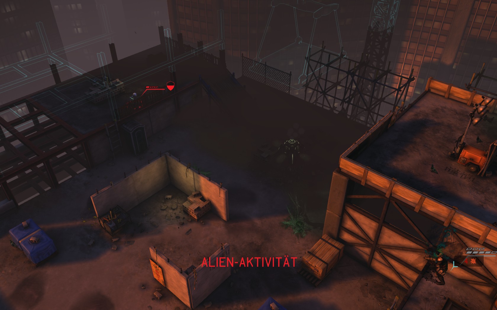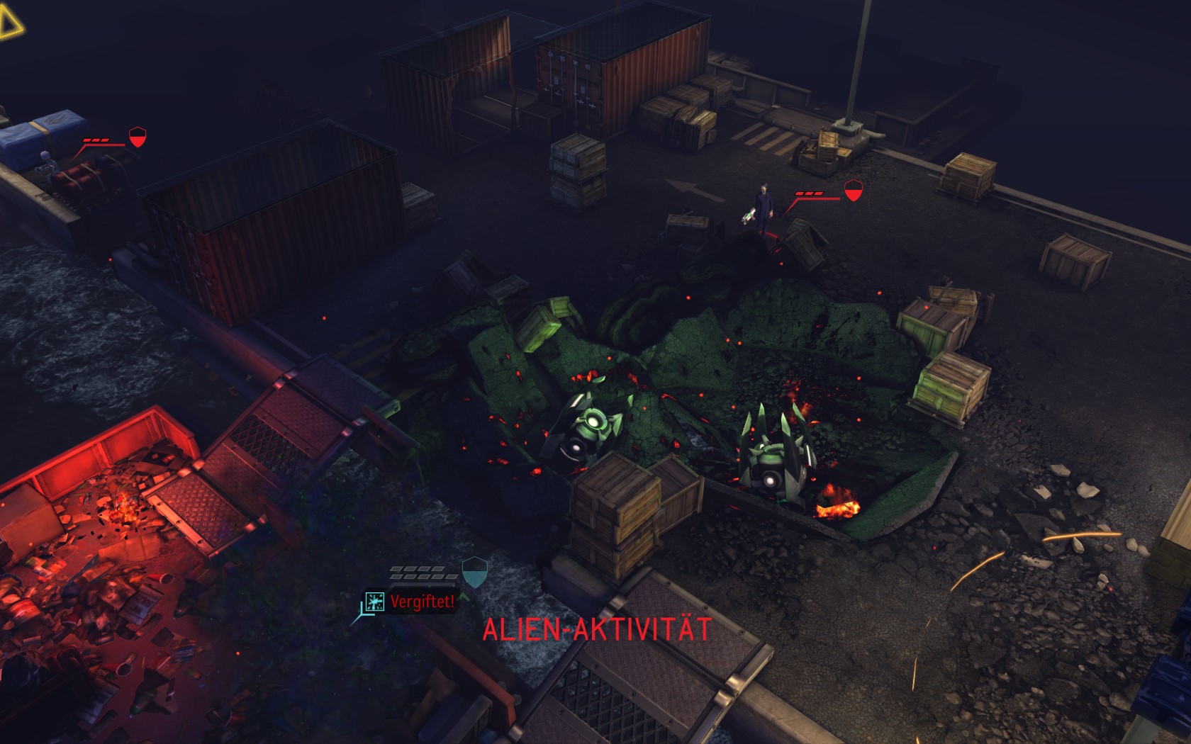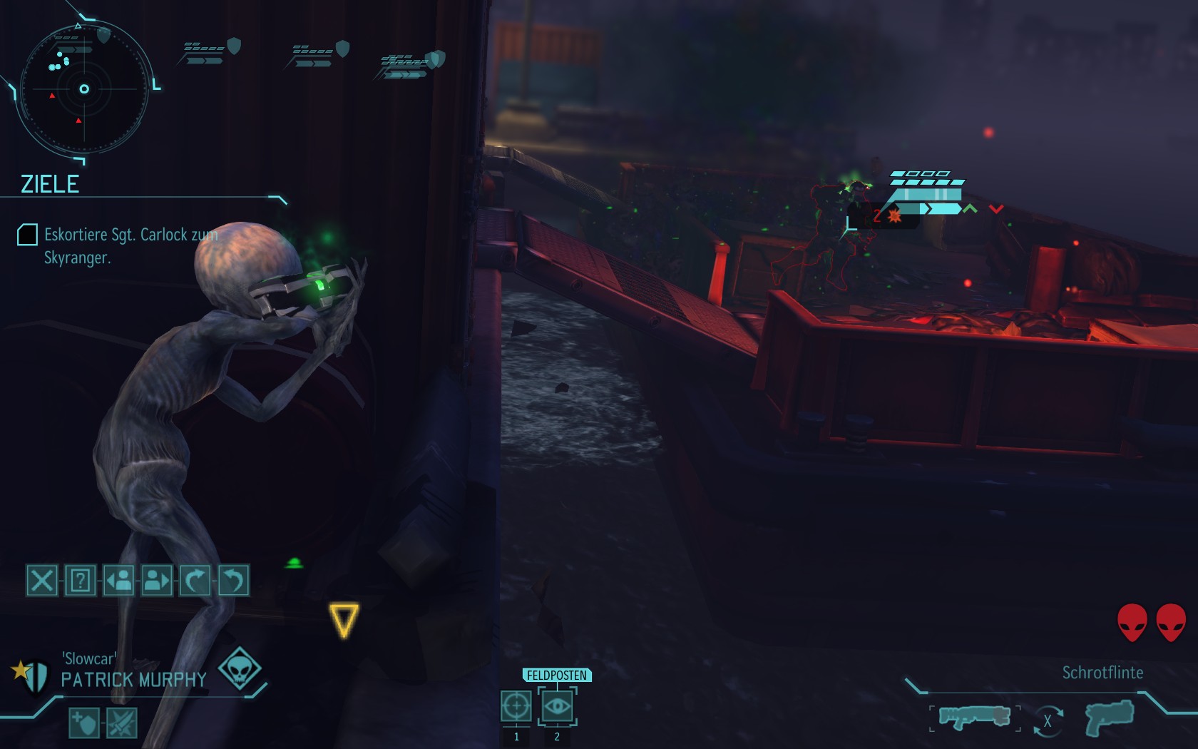 Die Aliens schicken neue Truppen. Einer landet direkt vor uns auf dem Container: