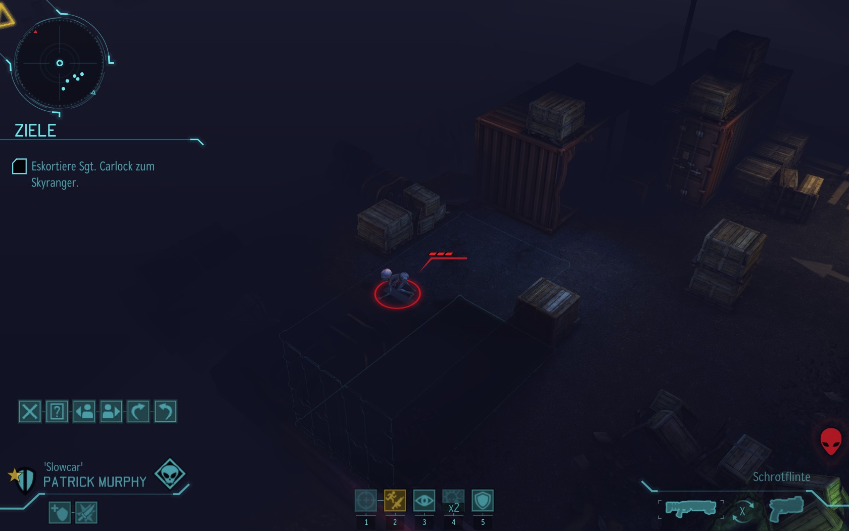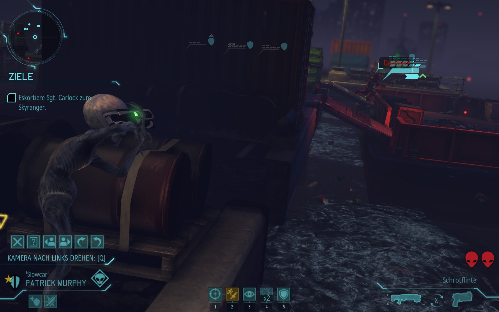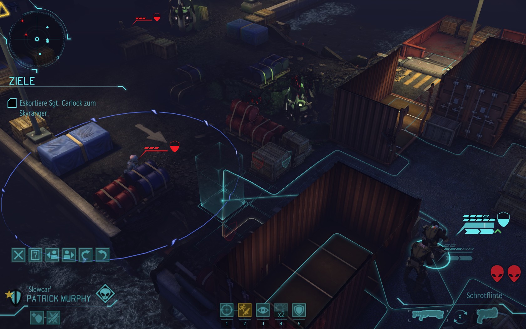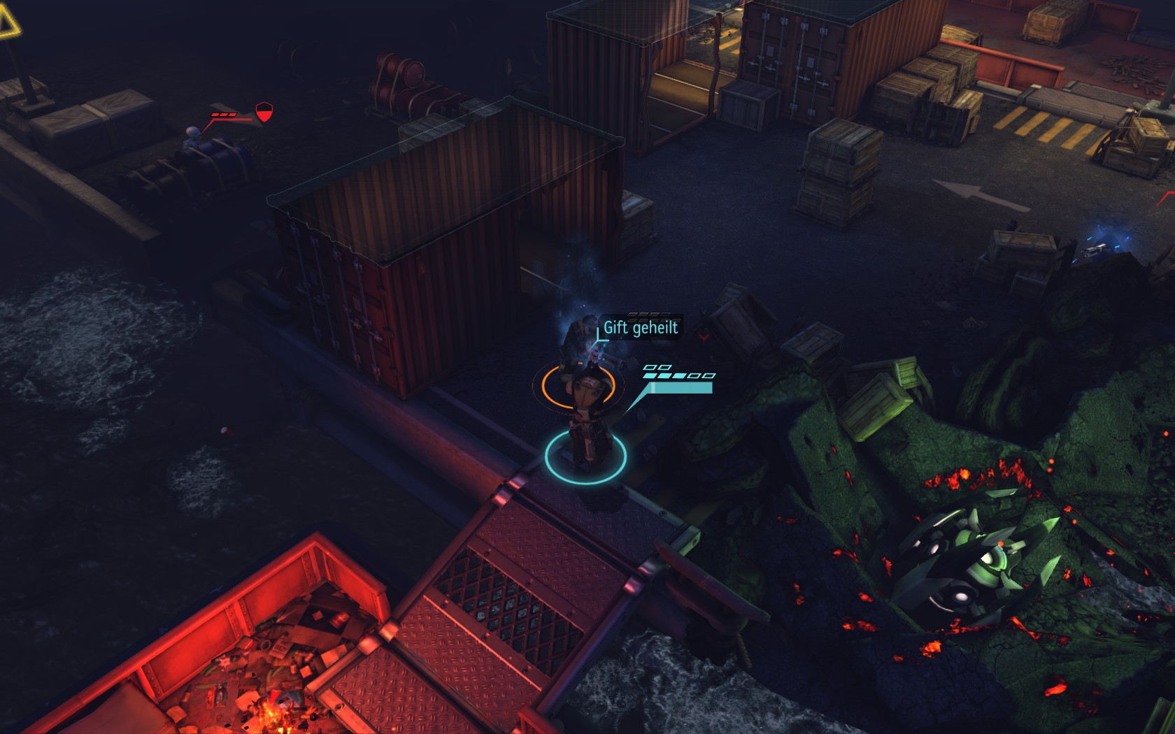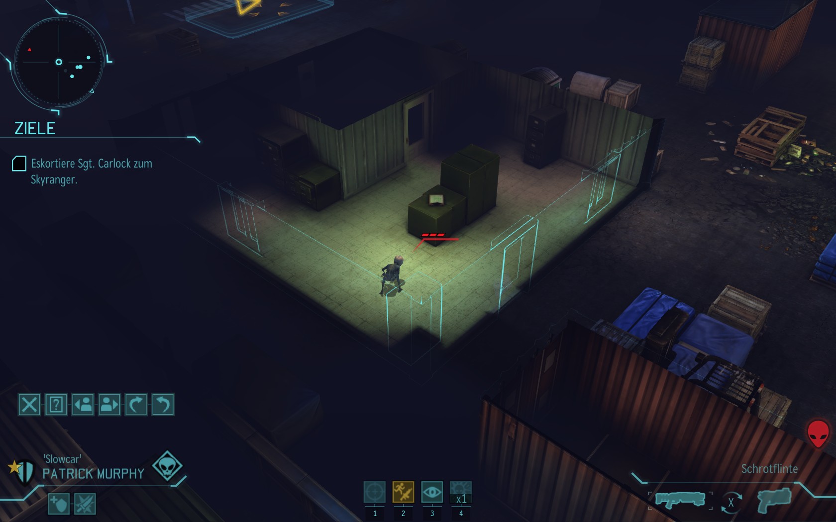 Die Aliens schicken neue Truppen. Einer landet direkt vor uns auf dem Container: