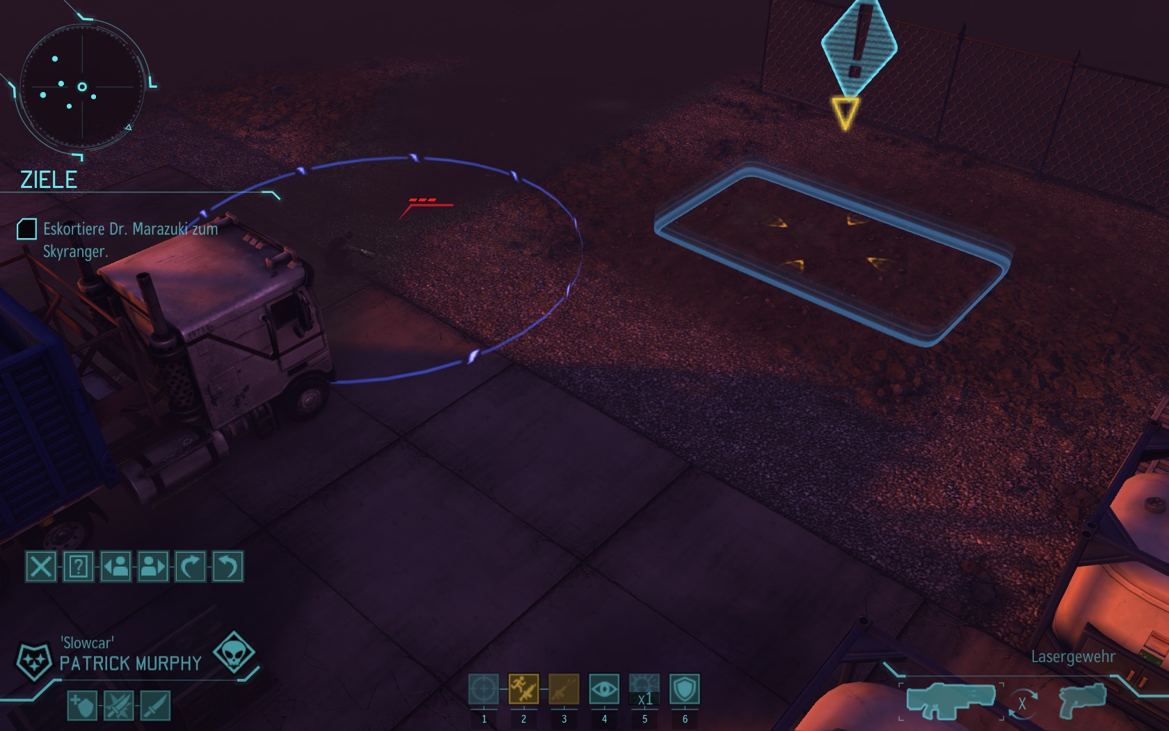 Slowcar bewegt sich auf einer Linie parallel zu Sare und sieht vor dem LKW das: