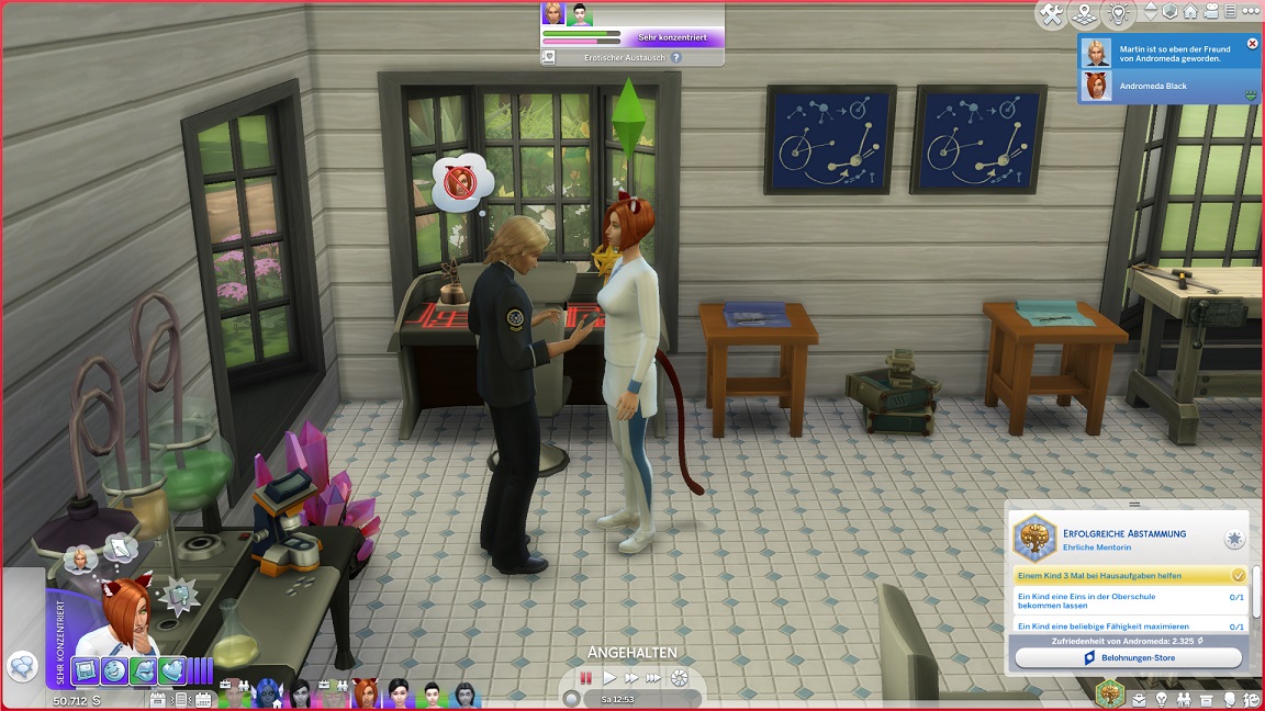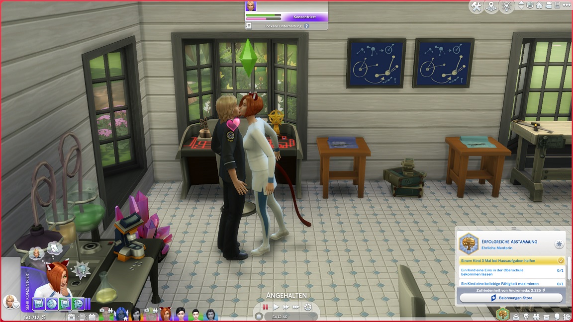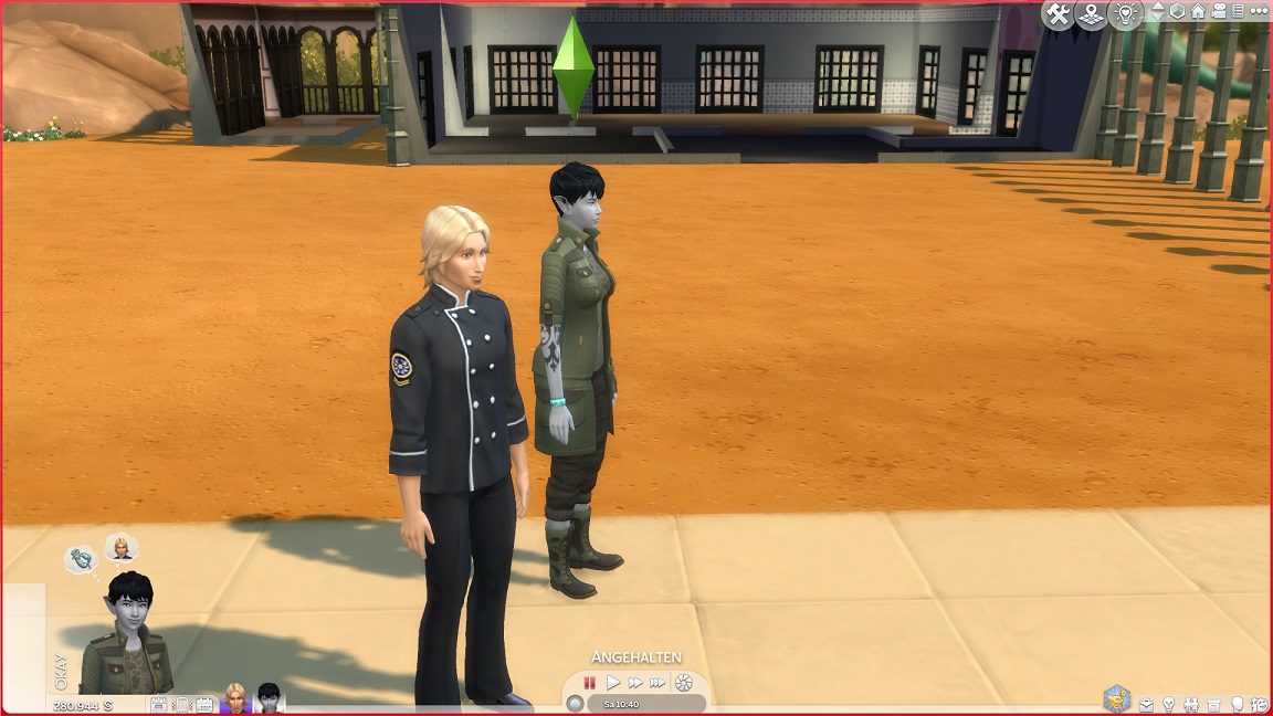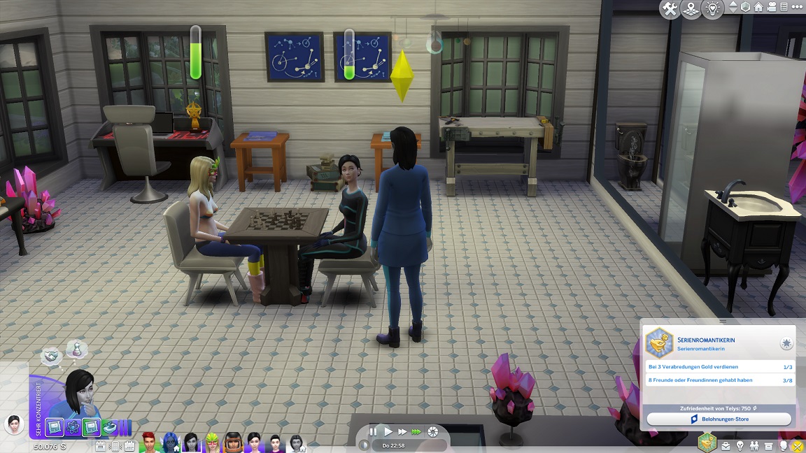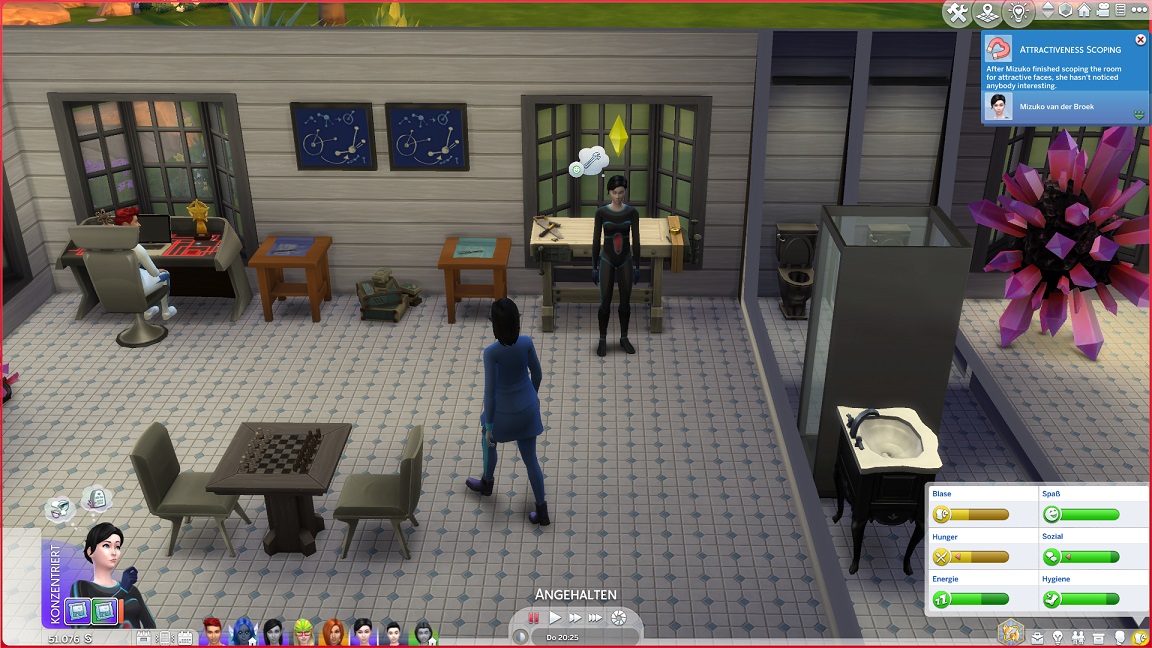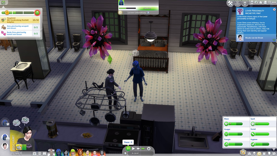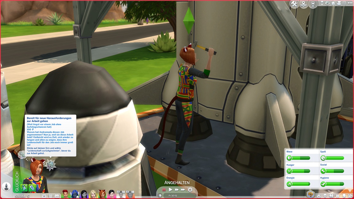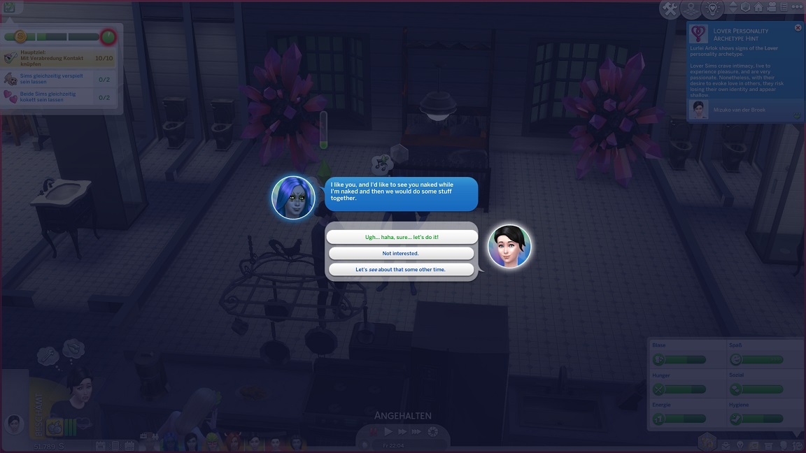 Ich nutze deswegen einsam/chaotisch/ehrgeizig - auch um weitere Eigenschaften zu verwenden - und lasse sie nach möglichst vielen erotischen Kontakten streben, da sie dies erst aus der Verborgenheit ihres Raumschiffs hinein in das Videospiel bzw. in die Sims-Öffentlichkeit führte.