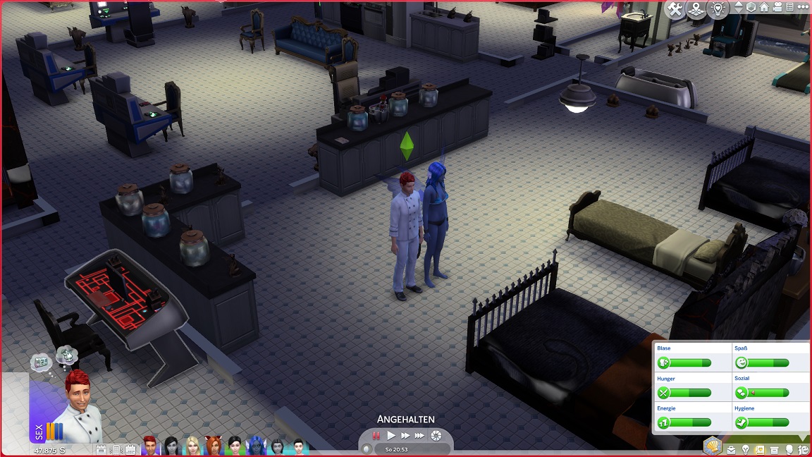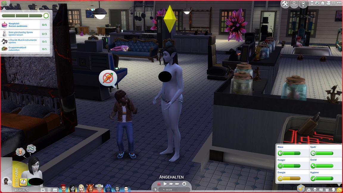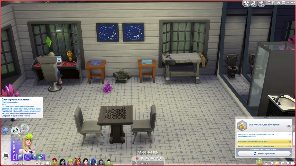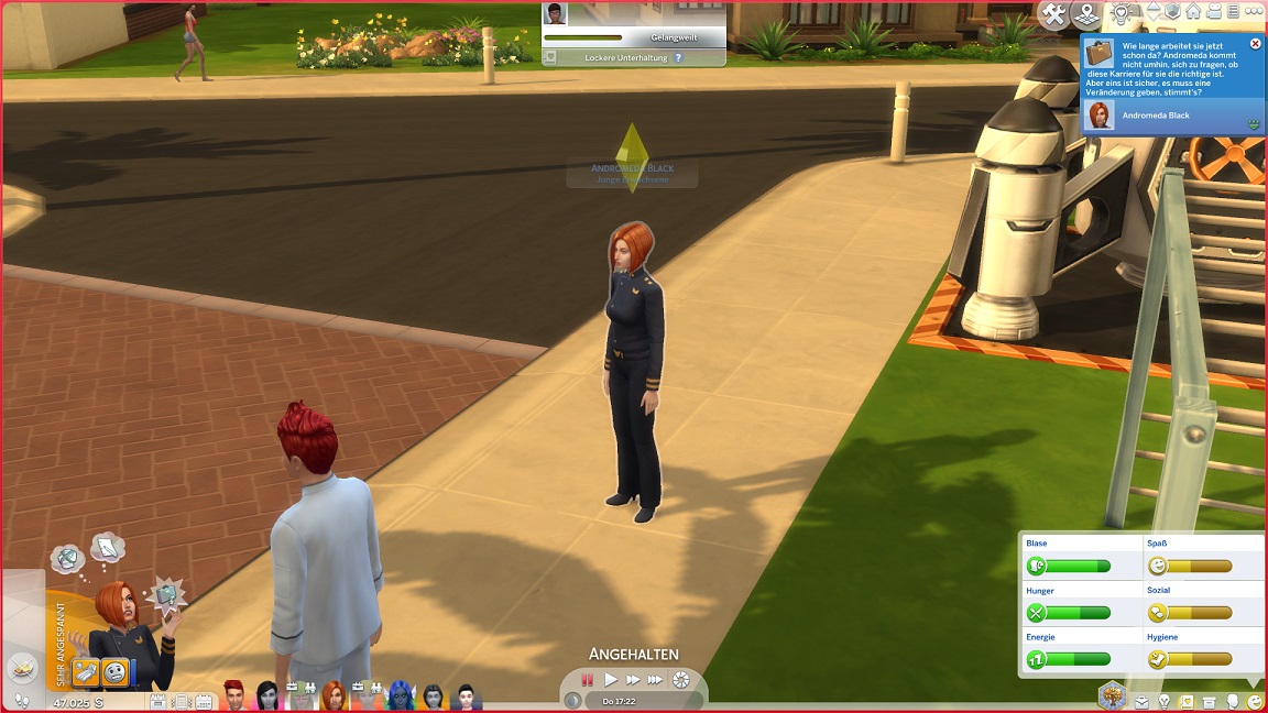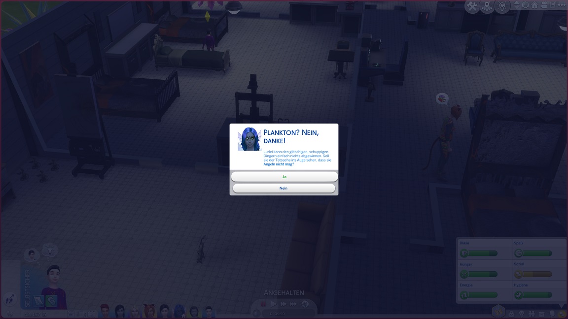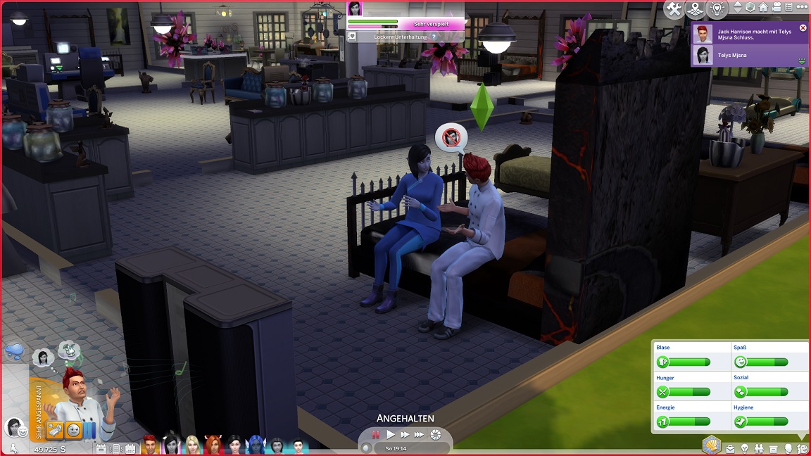 Lurlei hadert an ihrem Job. Artjom und James lernen einander und eine Schulfreundin mit leuchtenden Augen besser kennen. (Ja, ein Nebeneffekt meiner Kostümmods: Indem ich mir für die Mannschaft Flügel, Öhrchen und dergleichen suchte, stellte ich sie auch den zufällig erstellten Normal-Sims zur Verfügung und ließ die gesamte Welt bunter werden.)