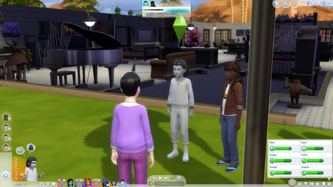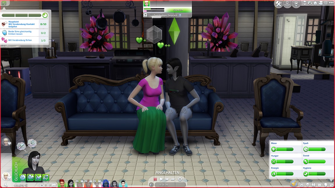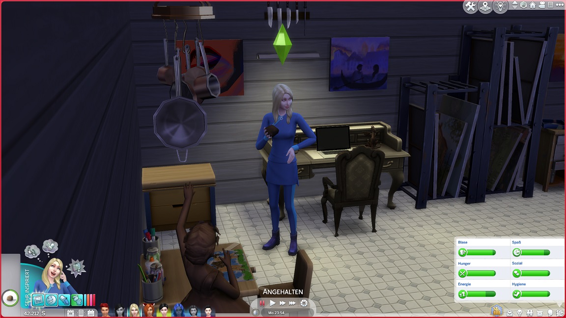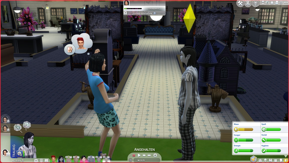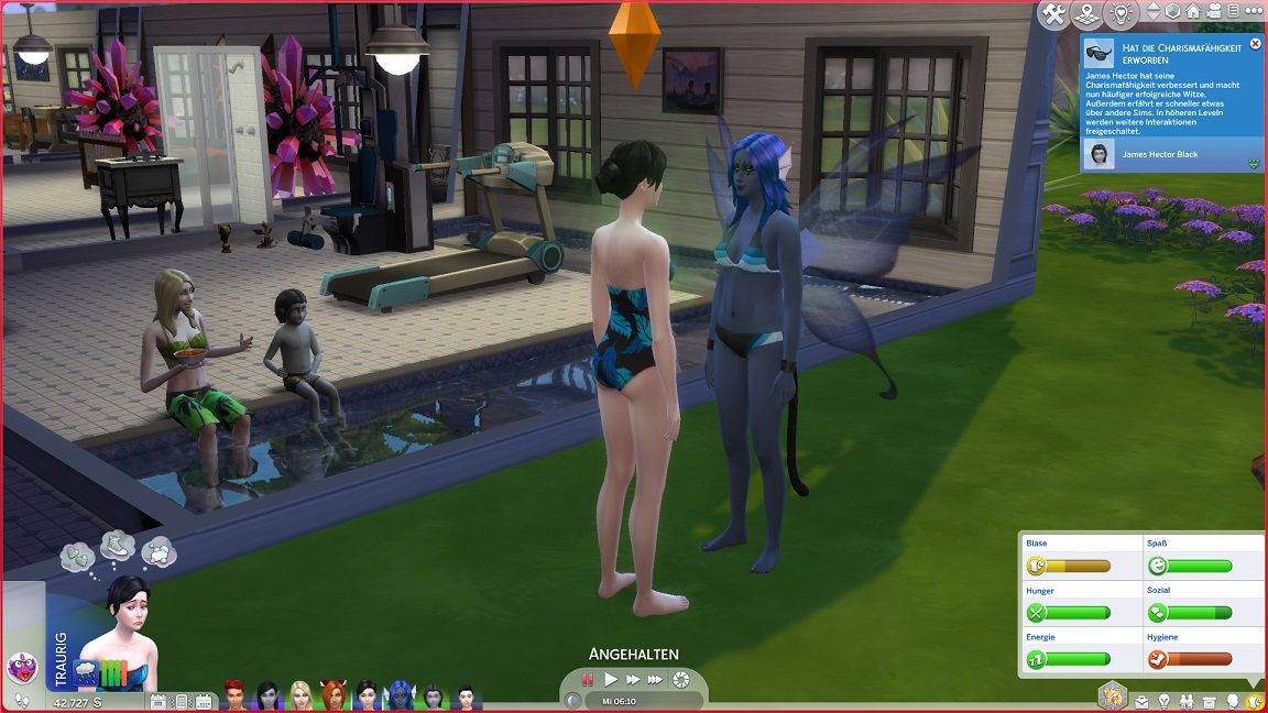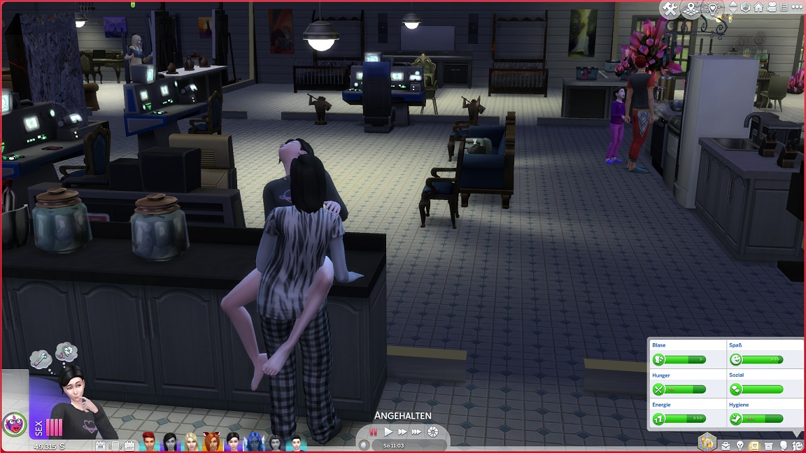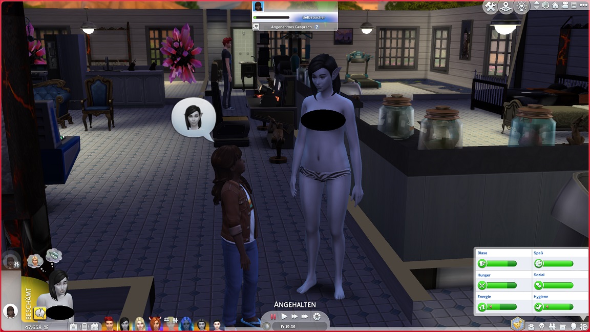 Lurlei hadert an ihrem Job. Artjom und James lernen einander und eine Schulfreundin mit leuchtenden Augen besser kennen. (Ja, ein Nebeneffekt meiner Kostümmods: Indem ich mir für die Mannschaft Flügel, Öhrchen und dergleichen suchte, stellte ich sie auch den zufällig erstellten Normal-Sims zur Verfügung und ließ die gesamte Welt bunter werden.)