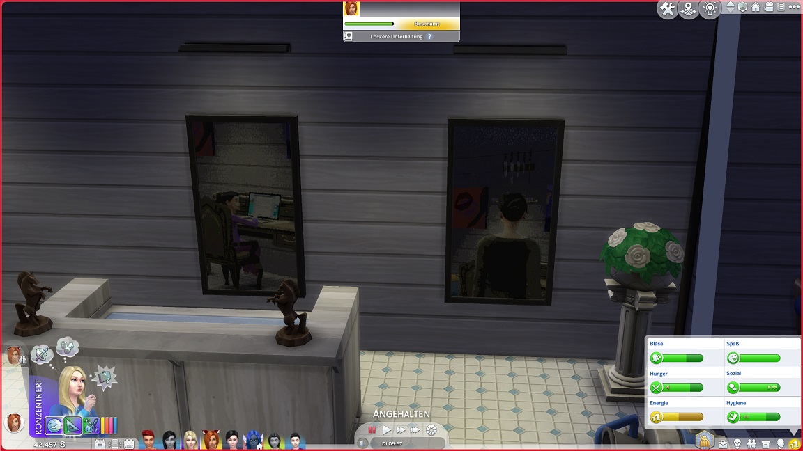 Meiner Meinung nach merkt man den Denkblasen (a.k.a. "Wünschen und Befürchtungen") an, dass es sich um ein recht frisches Gratis-Feature handelt. Sie hadert schon wieder mit ihrem Job. Gefühlt hatte das schon die gesamte Mannschaft, mindestens einmal. (Die Reaktion besteht übrigens aus der Selbst-Aktion "Leidenschaft zurückgewinnen", die einen längeren Cooldown aufweist und so oft angewendet werden muss, bis das Spiel sich zufriedengibt.)