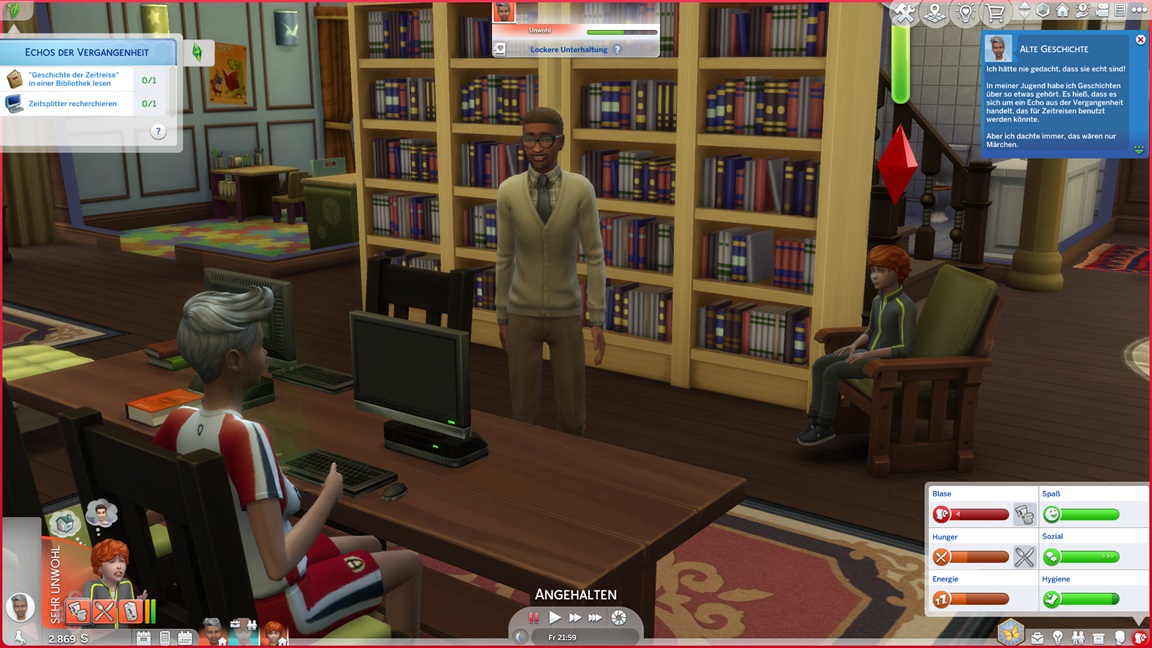 Das Buch klemmt hingegen und lässt sich erst lesen, nachdem er die Bibliothek verließ. Das Buch stellt die These auf, dass Bücher, Filme und Videospiele ein Tor in die Vergangenheit darstellen oder gar selbst Zeitreisen ermöglichen würden. Neil muss spielen... aber zunächst wartet der Kuchen.