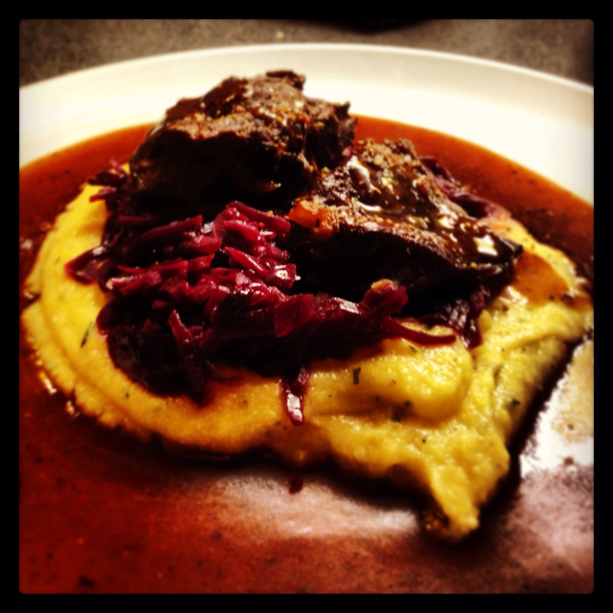 Geschmortes Kalbsbäckchen mit Rotkohl und Polenta.