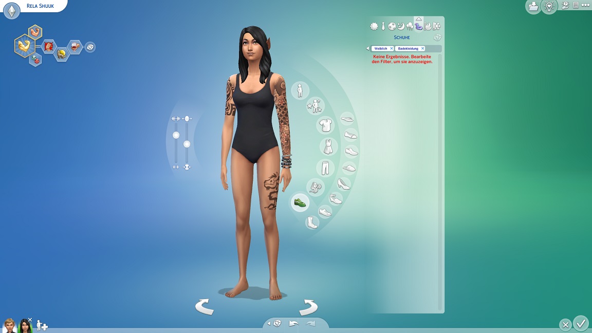 Ich passe ihr Konzept nur dahingehend an, dass ich sie für stark tätowiert erkläre - mit eben der Umkehrung, dass hier die "dunklere", betintetere Schwester als die "gute" der beiden gelten kann. Gegenüber Mr Johnson in der Space Needle entschließt sie sich dafür, diese Seite von ihr nur anzudeuten, statt sie ganz zu öffnen oder zu verbergen.
