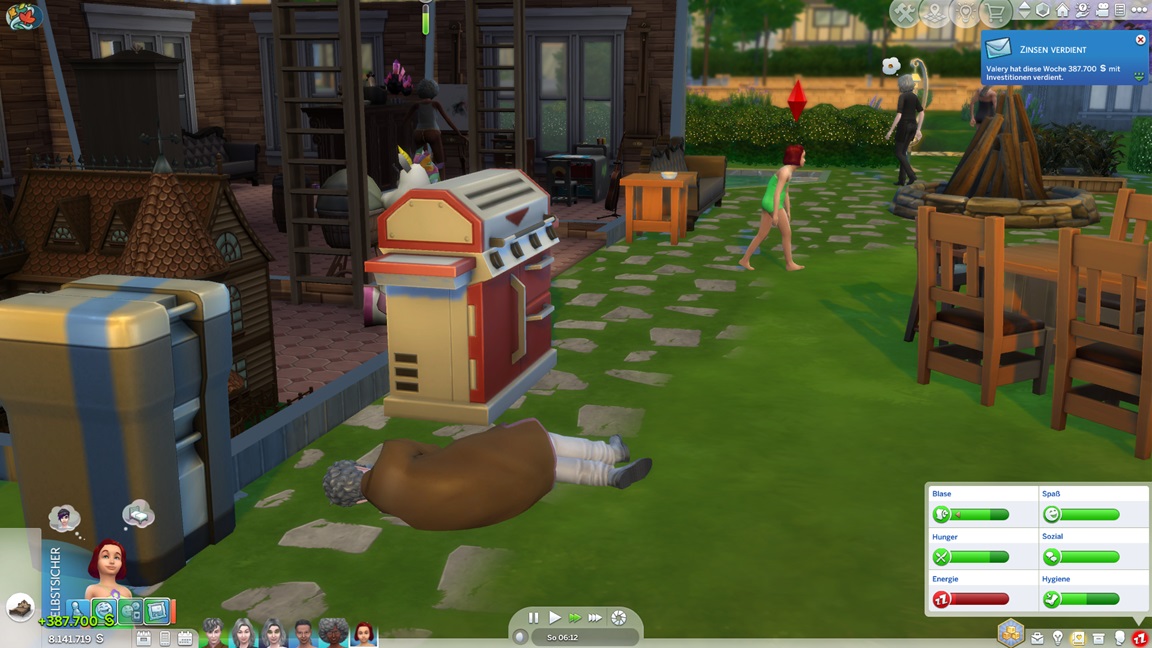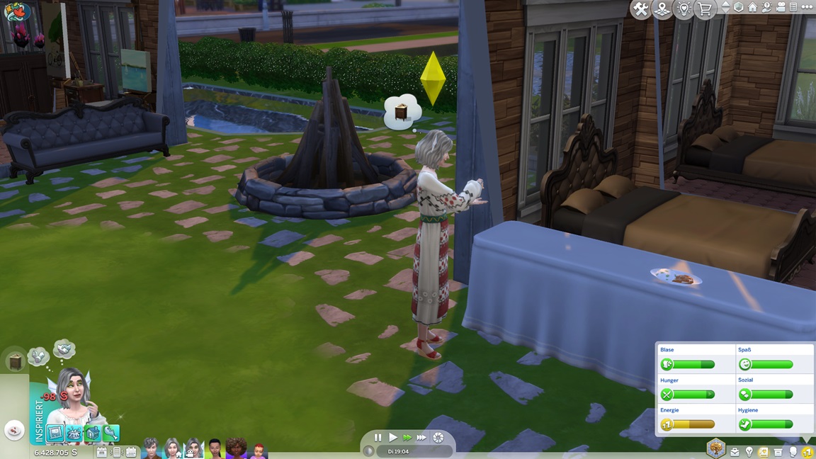 Helga stellt fest, dass sie Gartenarbeit mag. Es gibt einen Banketttisch, auf dem sich (gegen Geld) Gerichte herbeizaubern lassen. Leider befindet sich kein Kuchen unter der Auswahl.