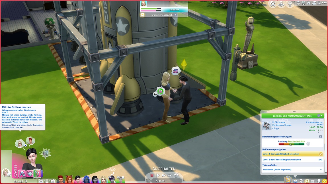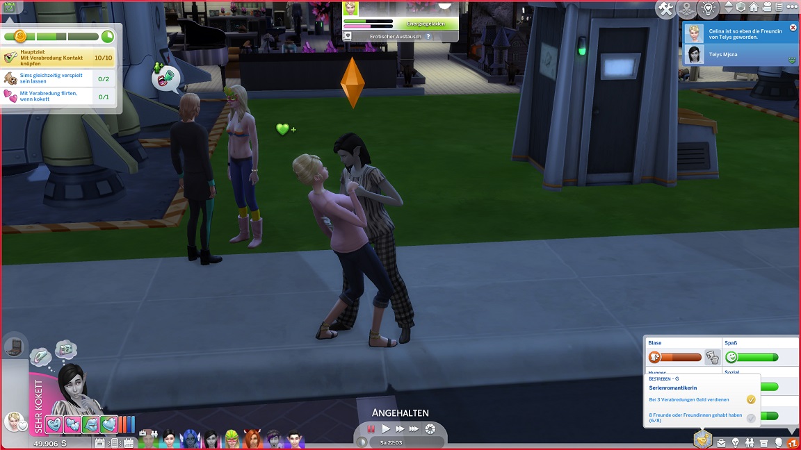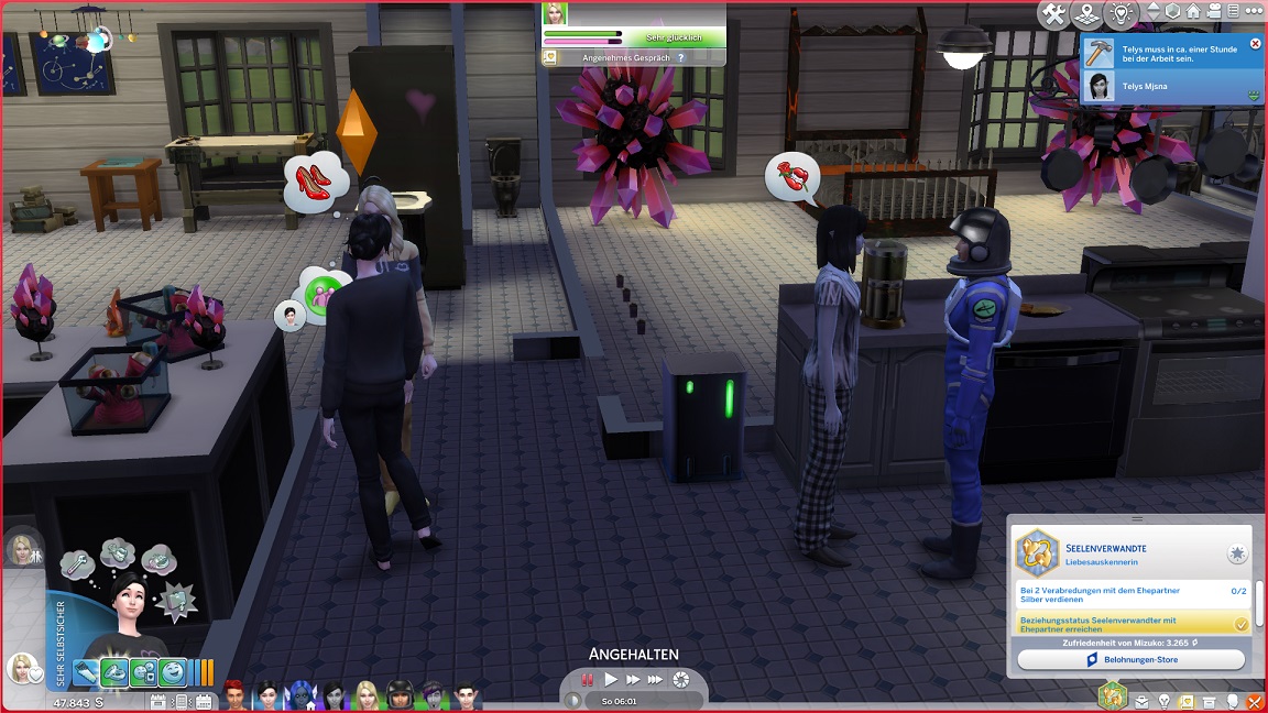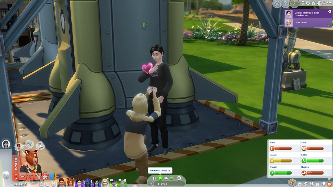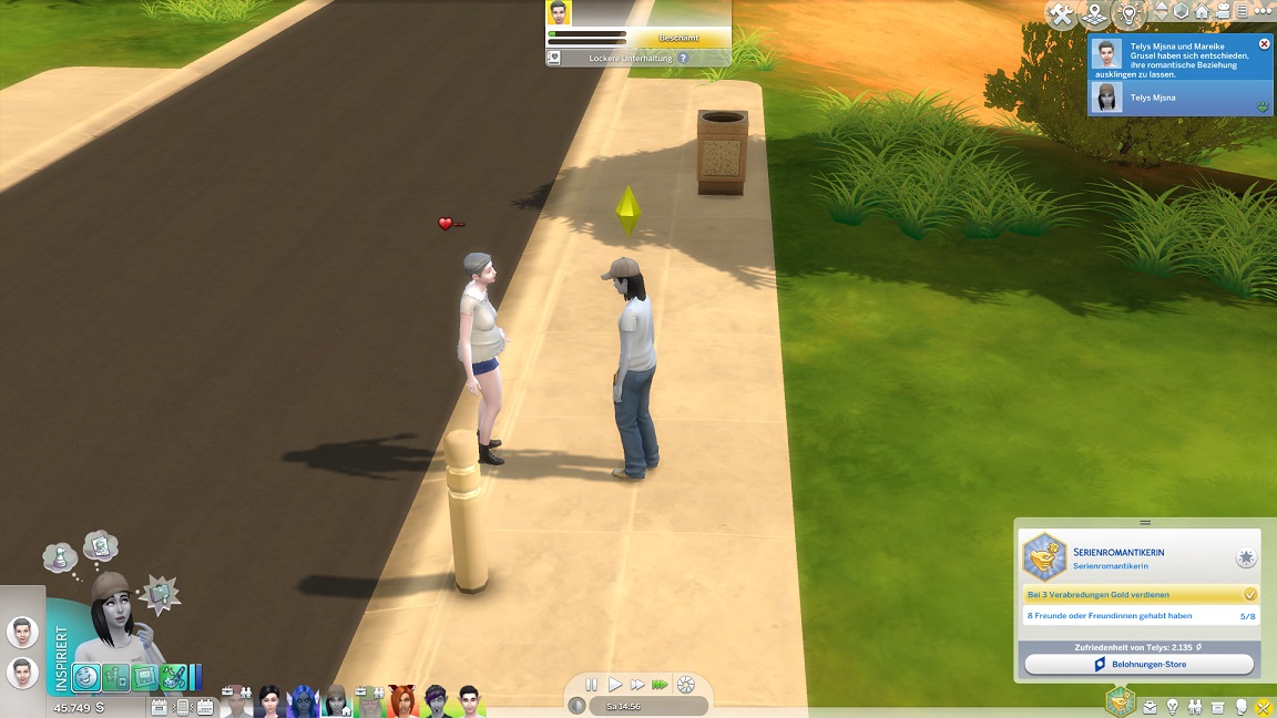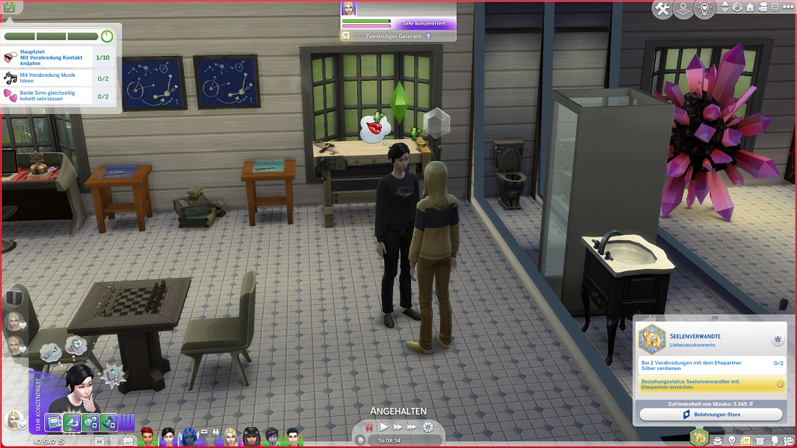 Mizuko muss ja für ihr Bestreben heiraten. Ich hätte sie gerne mit Miral verkuppelt, um deren Auftritt einen Sinn zu geben, doch sie kam einfach nie am Haus vorbei und ich wollte Mizuko keine Ausflüge unternehmen lassen, die auf Spieler- statt Charakterwissen fußen. Bei Lisa handelt es sich um ihre zweitlogischste Wahl (sie möchte aber Telys auch nicht in die Scheidung treiben) und auch wenn ich Sims- und Axanar-Pläne gerne getrennt hätte, tut sie auch nicht weh.