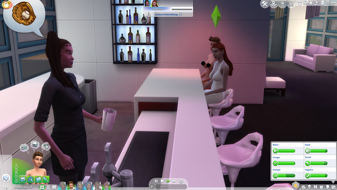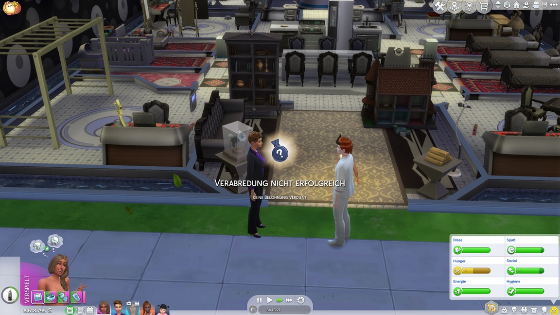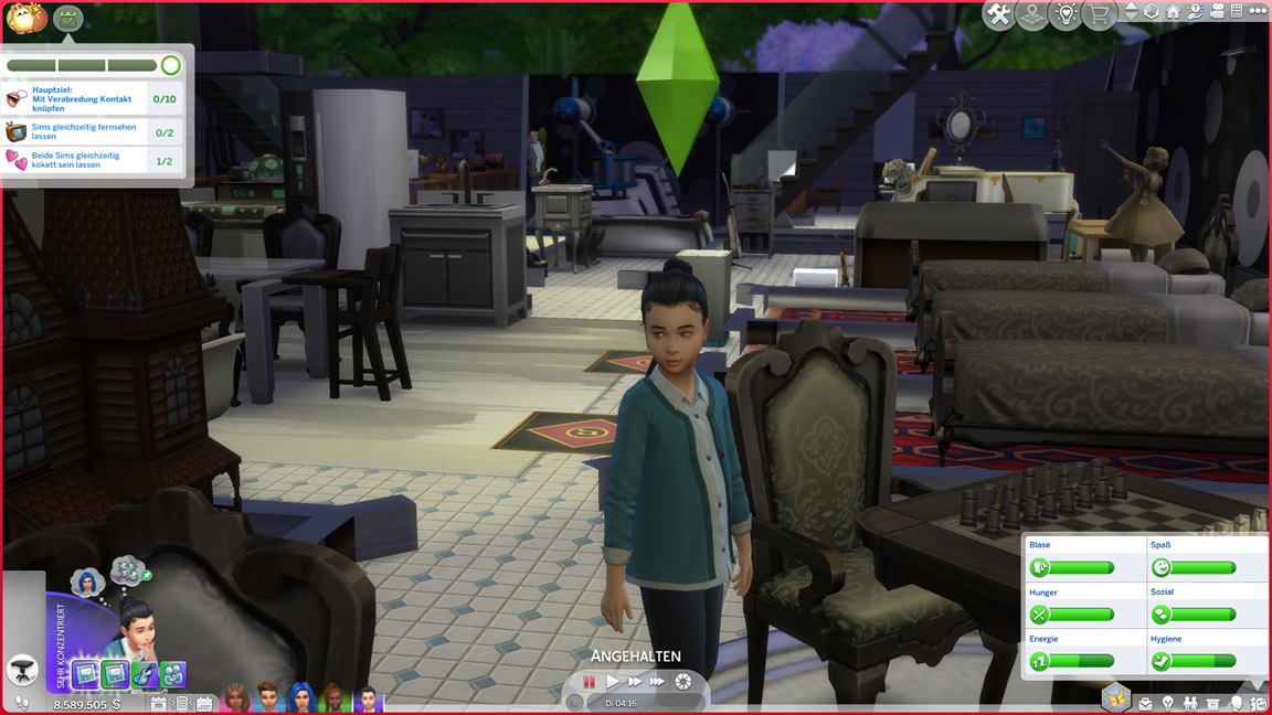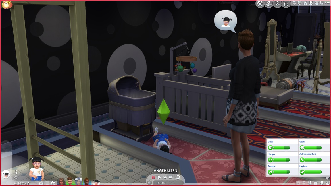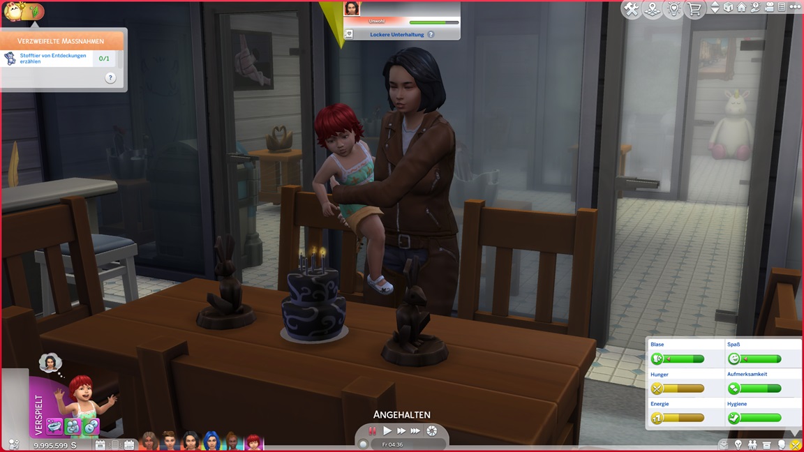 Als mir das Spiel beim Umgang mit Frederike zu viele Steine in den Weg läuft, jage ich sie vorschnell durch den Kuchen und füge den vollen Bonus per Konsole hinzu. Dann wiederhole ich es, als es mit Kleinkind direkt so weitergeht. Während nach dem Leon-Fehlschlag nun doch Betty und Daniela zu einem Date aufbrechen, präsentiert sich Frederike - bildhübsch, aber noch mit dem Schmutz der Säuglingsfütterungen, die mit dem nächsten Laden verschwinden wird.