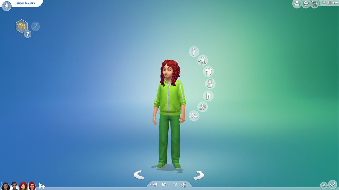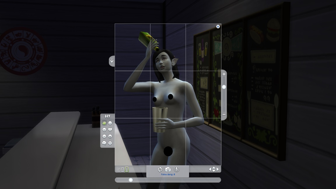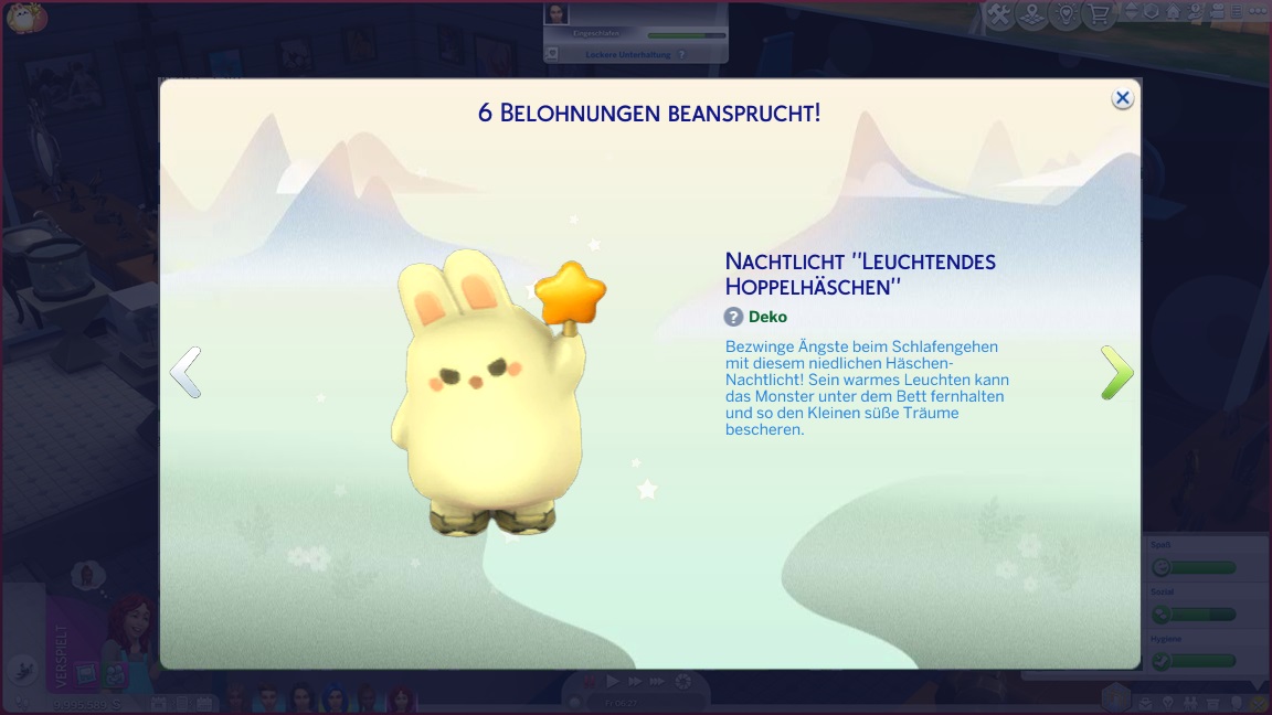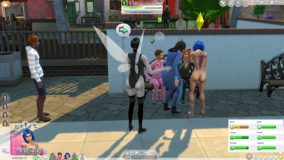 Während damit Frederike in den Hort wechselt, ziehen Nadja und Jelena weiter. Letztere zieht sich um, um sich auf die Aufgabe als ewiges Kind zum Anfreunden vorzubereiten. Eines ihrer Kostüme enthüllte Flügel, doch da ich schon genug Feen habe, ließ ich den Würfel entscheiden, der sie ihr abnahm.