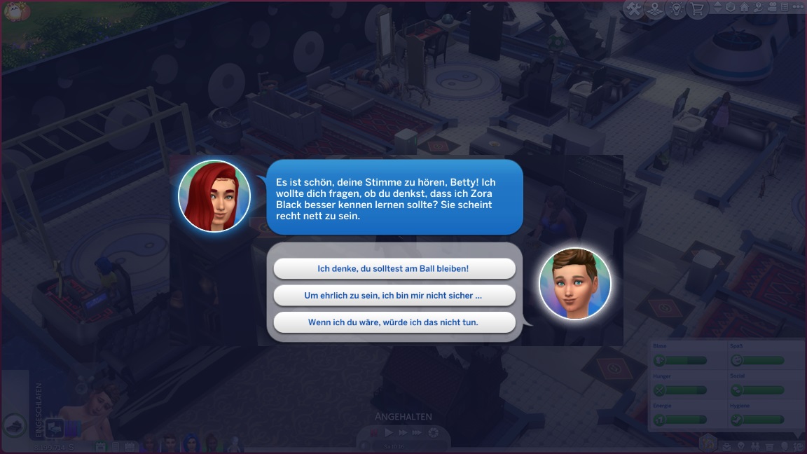 Betty besitzt sonderbare Einstellungen: Sie ist romantisch ausschließlich an Frauen und sexuell ausschließlich an Männern existiert. Ich gehe zu den Einstellungen, lasse nun den Würfel für sie sprechen, ignoriere die Ergebnisse und mache sie beide bisexuell. Außerdem verkürte ich Danielas Namen auf Dani.
