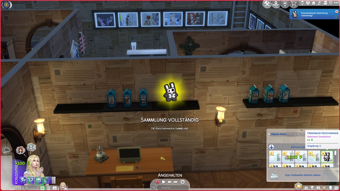 Ihre Weltraumausflüge dauerten nicht lange genug, um eine Sammlung abzuschließen. Sie legt eine Leiste mit Knochenhasen und Milchkartons an.