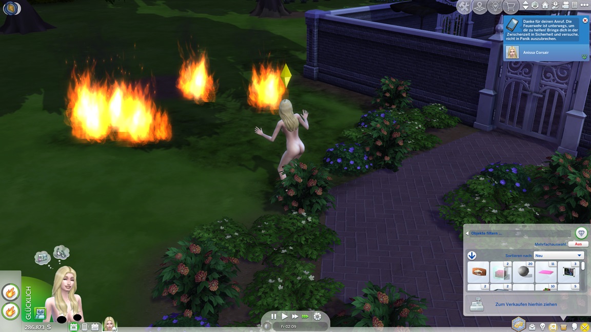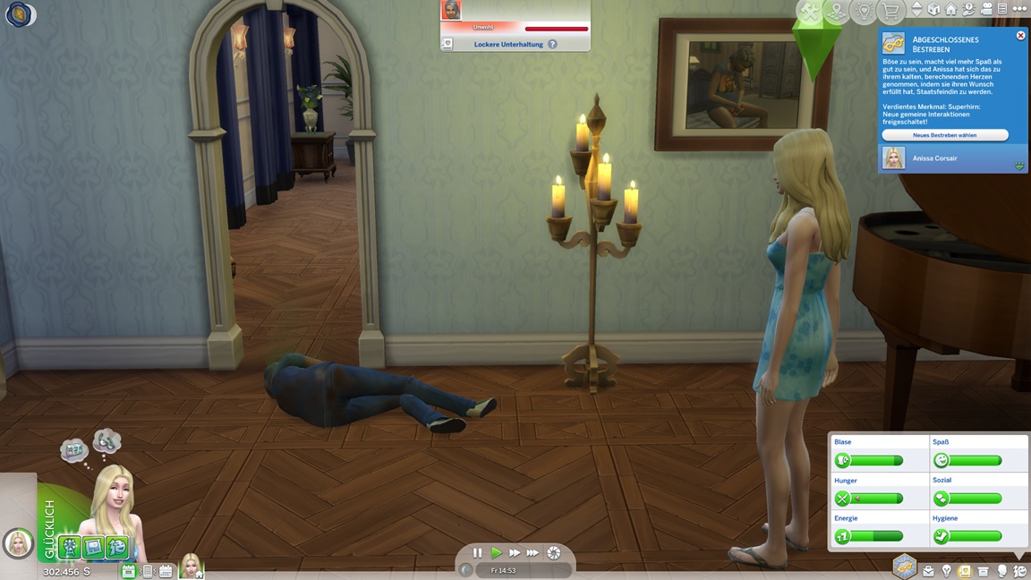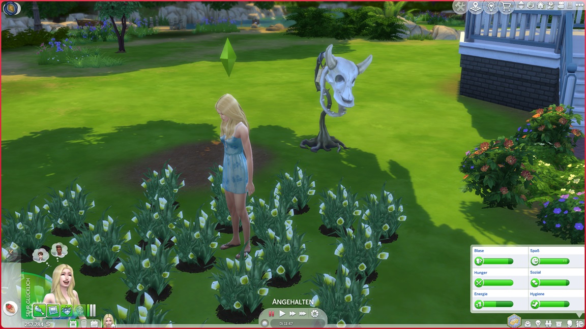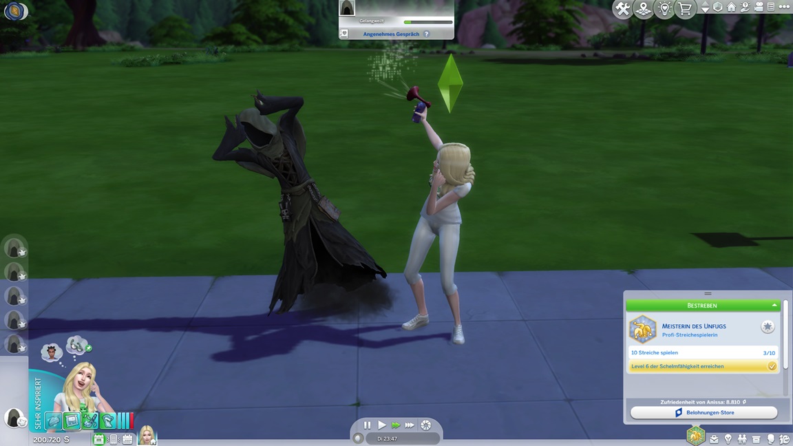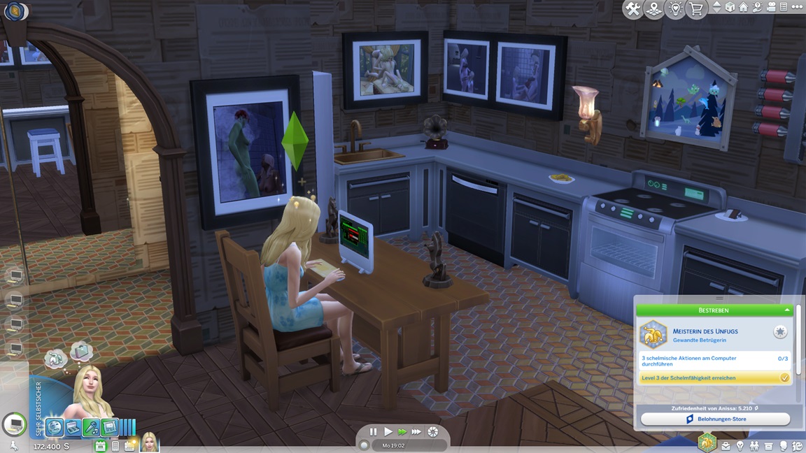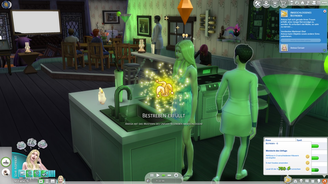 Die eine der beiden Unheil-Bestrebungen verlangt von Anissa, an drei fremden Orten Abflüsse zu verstopfen, was sich leicht mitnehmen lässt. Die andere fällt schwerer: Sie muss miterleben, wie ein Sim stirbt. Da das Spiel seine NPCs schützt, sieht Alissa nur einen Weg: Sie quartiert sich bei einer alleinstehenden Rentnerin ein und hofft auf das Ende ihrer Lebensuhr. Dies ist Sabine Schmidt, und sie lebt in einer Villa.