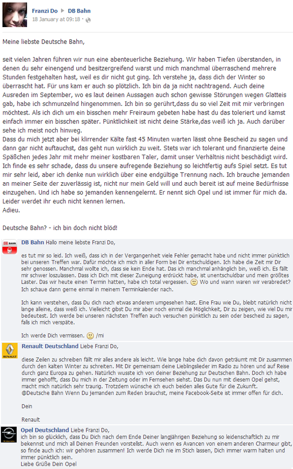 Mittlerweile ist Sie aber wieder bei der deutschen Bahn und hat zwei Stellenangebote als Texterin bekommen. :D