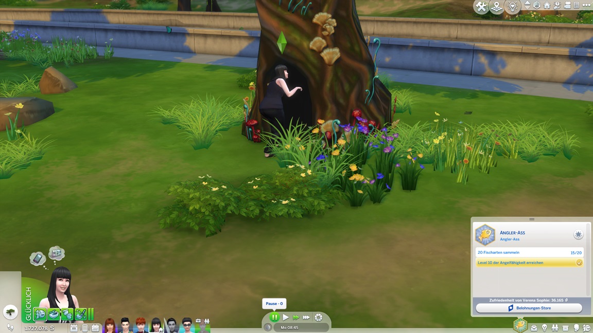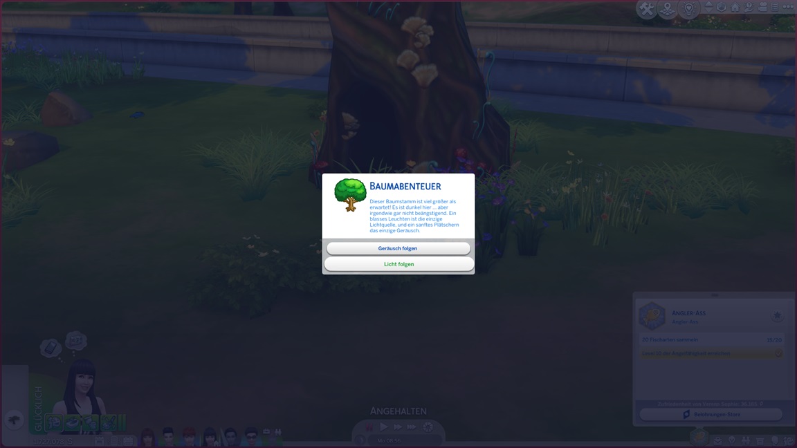 Nachdem Verena alles außer die Fischsammlung abhakte, wendet sie sich dem Feenbaum zu. Der Tor wusste sie schon vor einer Weile zu öffnen: Zunächst lässt sich der Baum ansehen, dann gießen, dann (einseitig) mit ihm sprechen und schließlich davon überzeugen, das Tor zu öffnen.