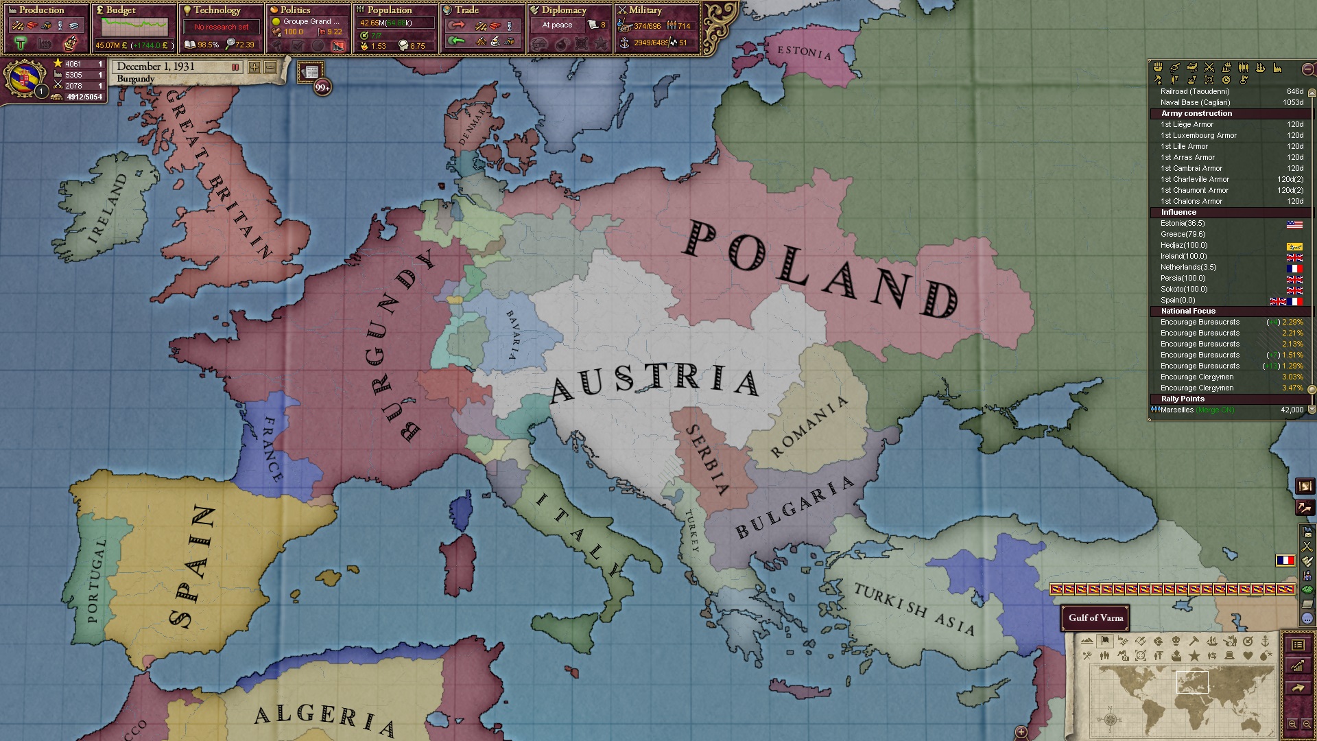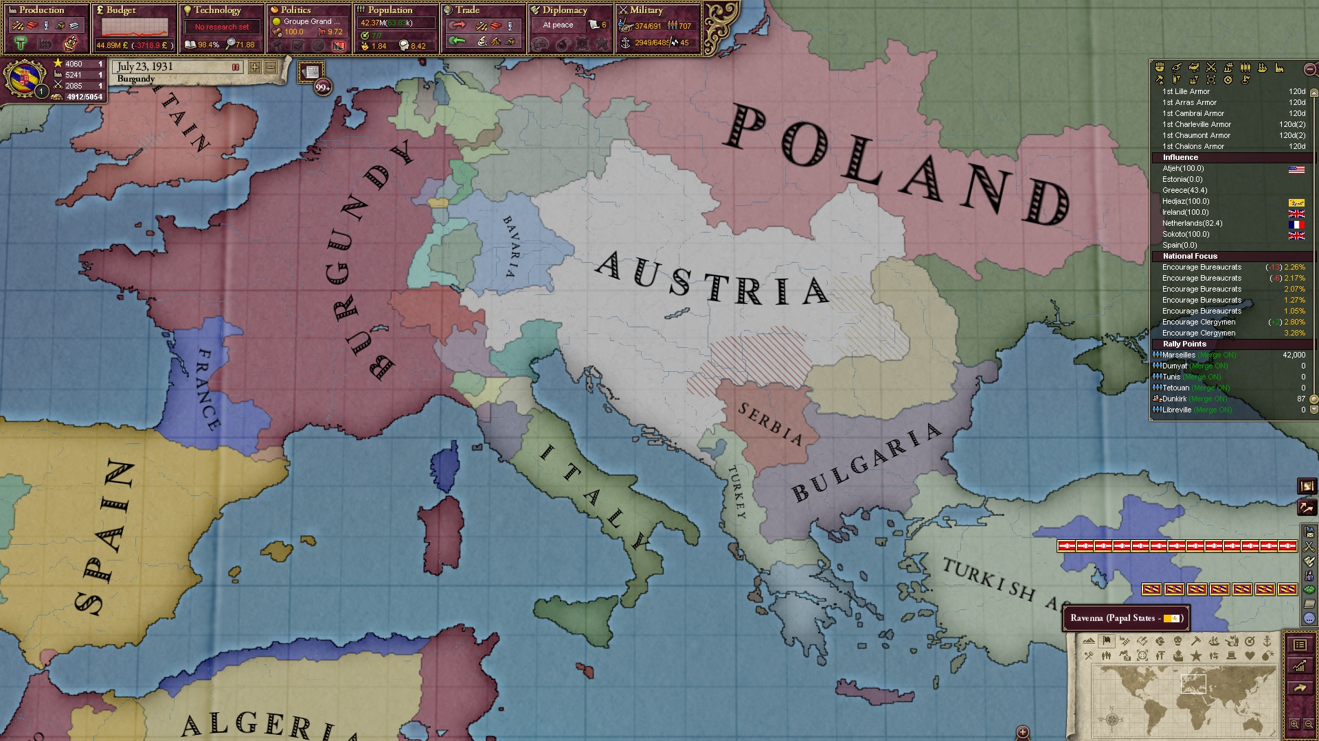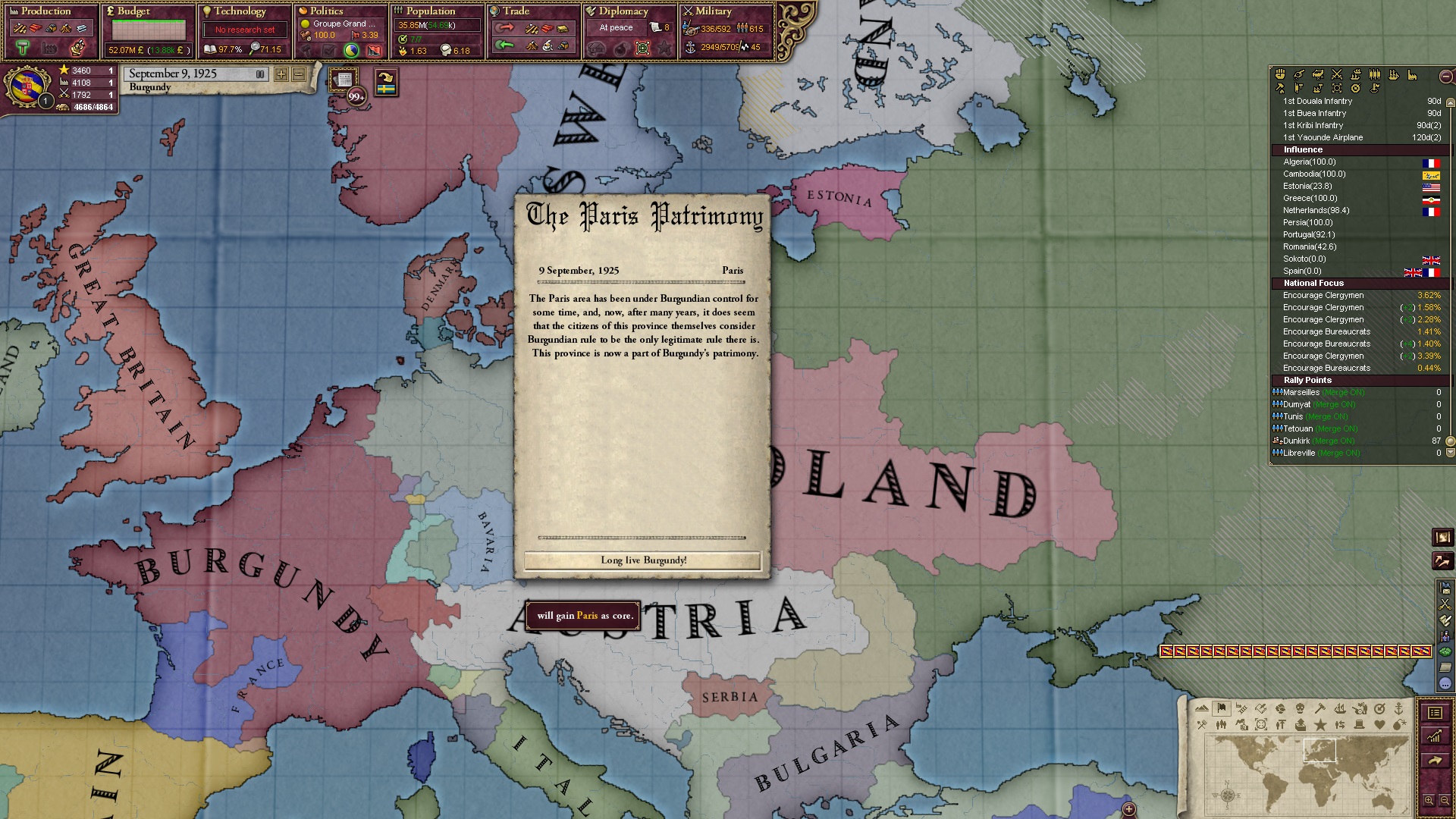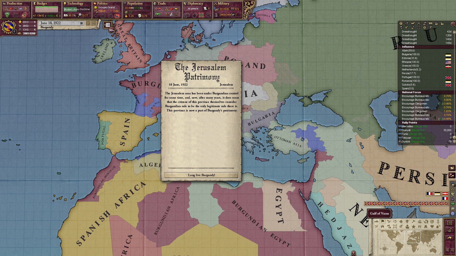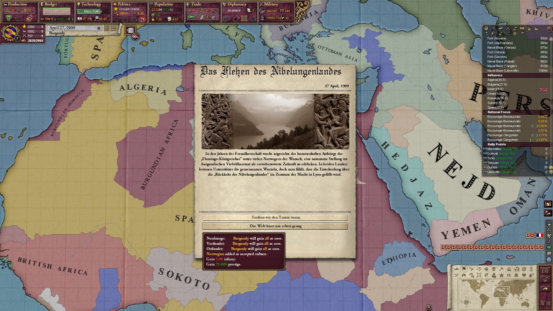 Derweil dachte ich darüber nach, ob ich nicht doch noch in letzter Minute ein Entscheidung einfügen sollte, die gegen Italien und in Richtung Kaiserkrone zielt, so a la: "Wenn Burgund ganz Italien unter seine direkte Kontrolle und/oder Sphäre bringt, dann kann es sich zum Kaiser sowie italienischen König krönen, erhält Kernprovinzen auf ganz Italien und stellt alle einheimischen Reiche vor die Wahl, sich entweder zu unterwerfen oder zu kämpfen." Diese Entscheidung würde alt-burgundische und napoleon-französische Linien aufgreifen, komplett dem Trend der italienischen nationaler Vereinigung zuwiderlaufen und faktisch die Transformation Burgunds in ein Lotharingien bedeuten...