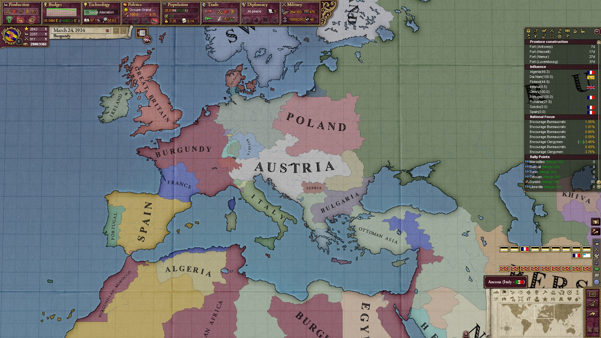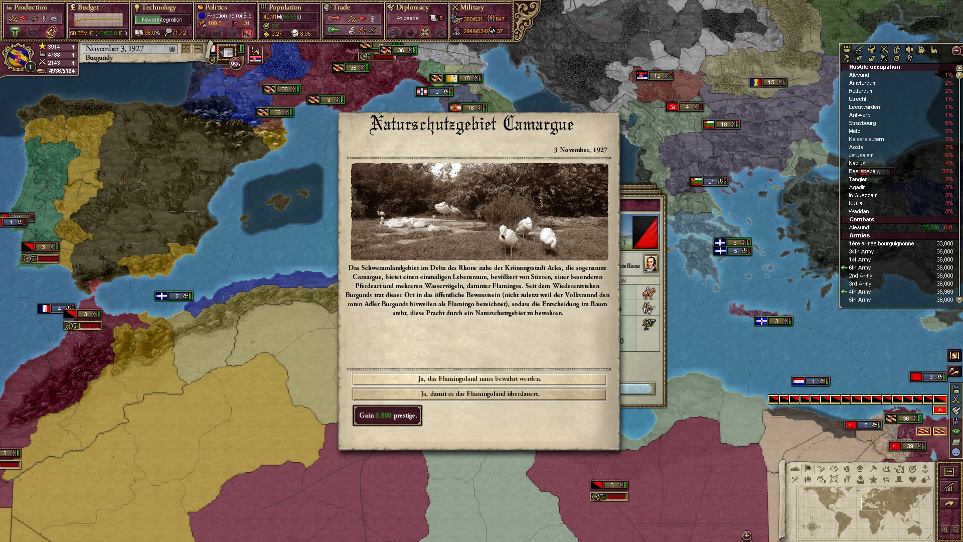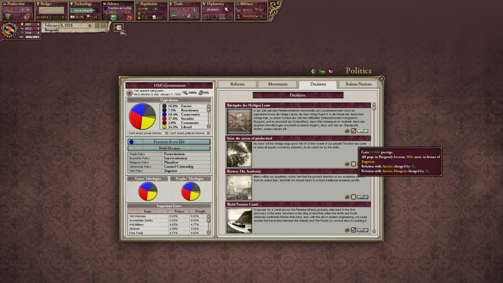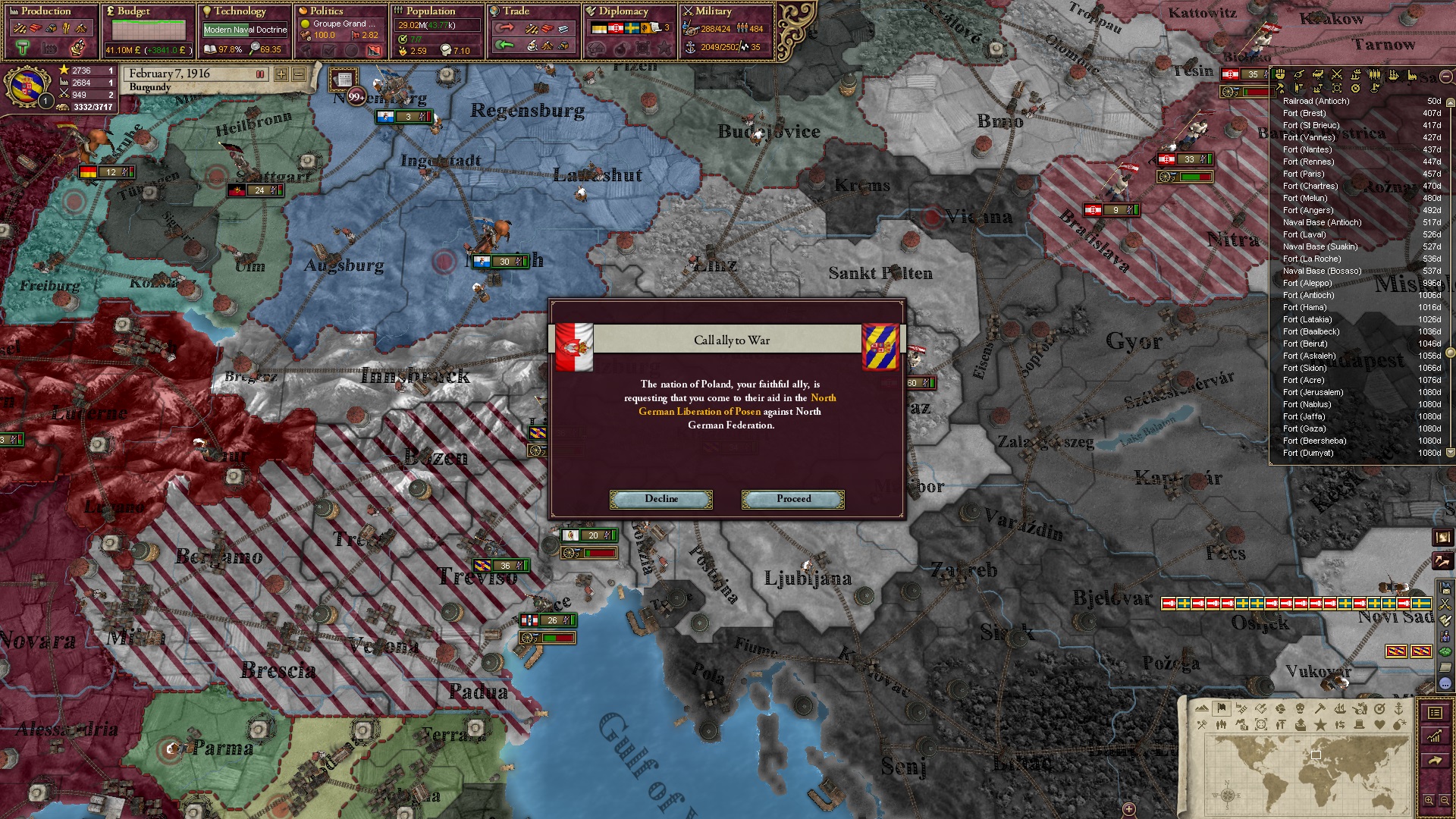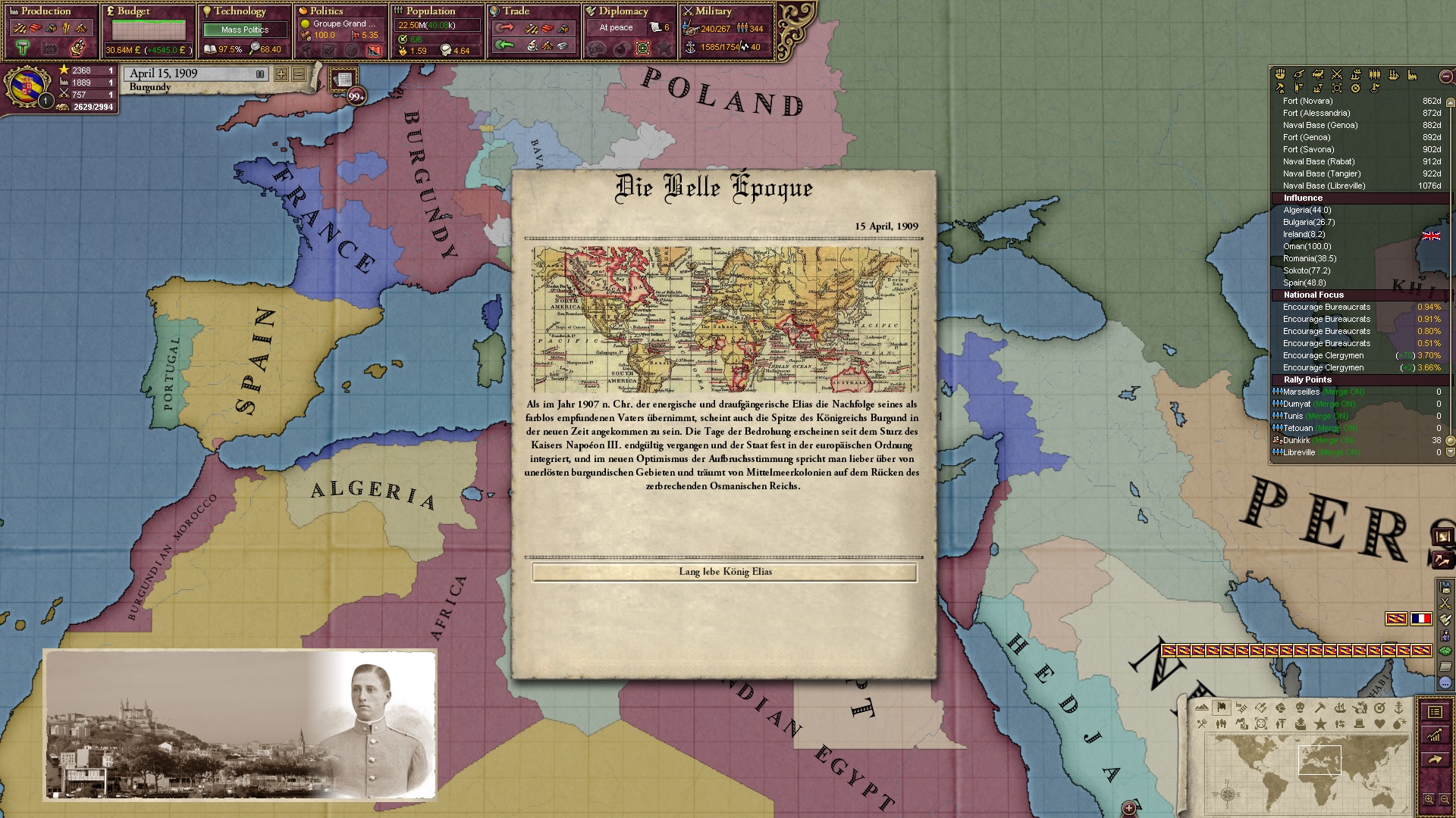 Derweil dachte ich darüber nach, ob ich nicht doch noch in letzter Minute ein Entscheidung einfügen sollte, die gegen Italien und in Richtung Kaiserkrone zielt, so a la: "Wenn Burgund ganz Italien unter seine direkte Kontrolle und/oder Sphäre bringt, dann kann es sich zum Kaiser sowie italienischen König krönen, erhält Kernprovinzen auf ganz Italien und stellt alle einheimischen Reiche vor die Wahl, sich entweder zu unterwerfen oder zu kämpfen." Diese Entscheidung würde alt-burgundische und napoleon-französische Linien aufgreifen, komplett dem Trend der italienischen nationaler Vereinigung zuwiderlaufen und faktisch die Transformation Burgunds in ein Lotharingien bedeuten...