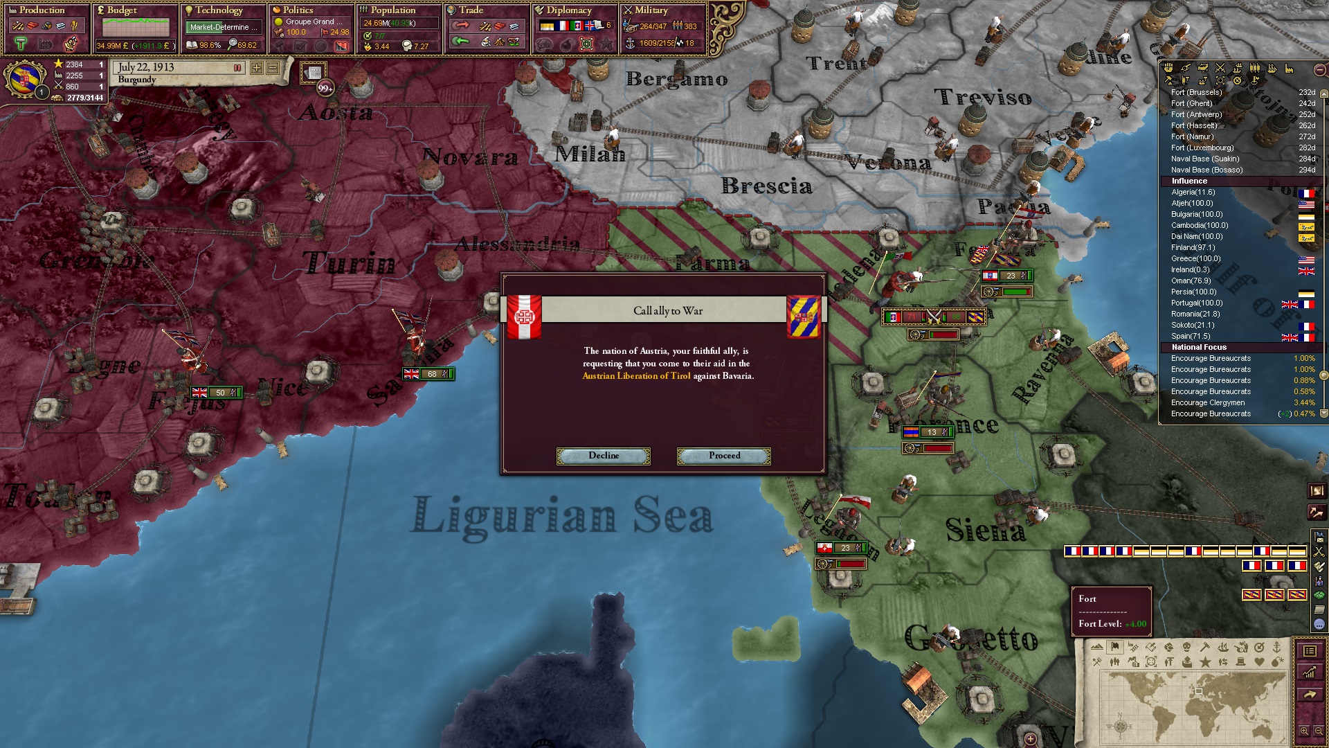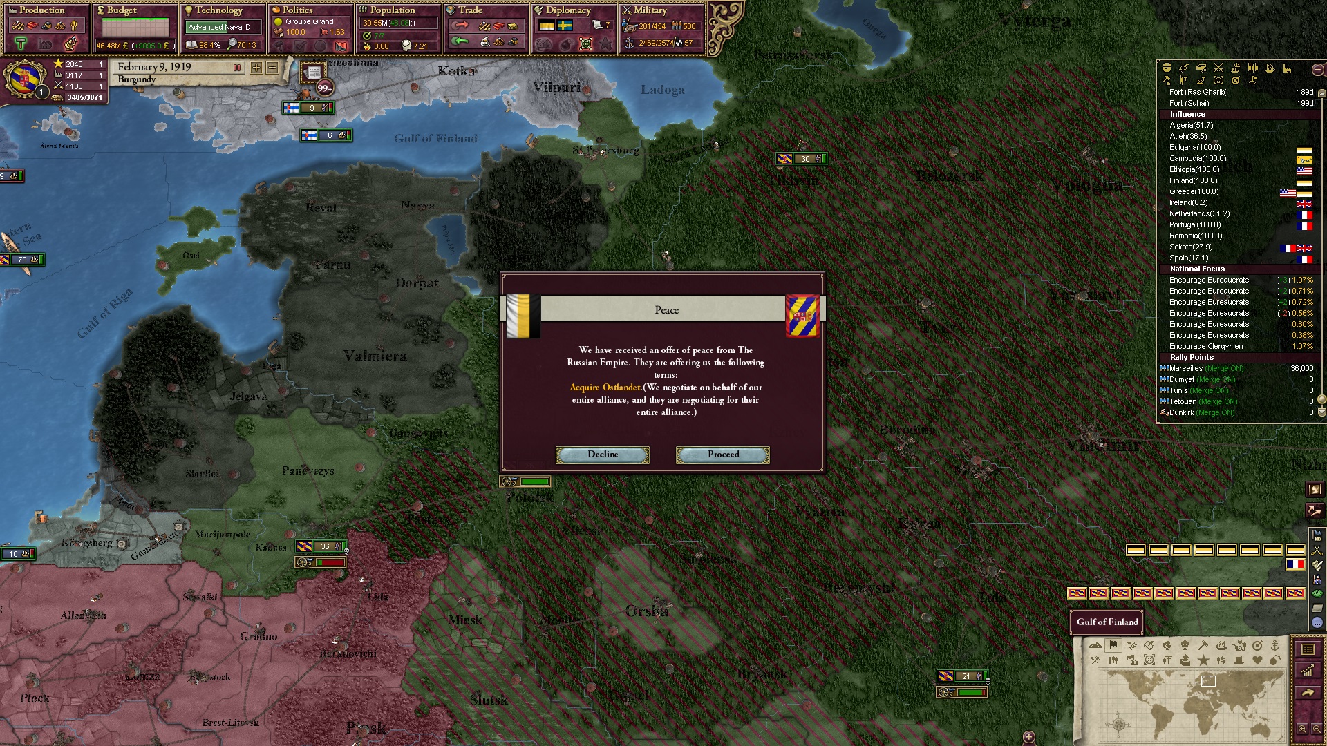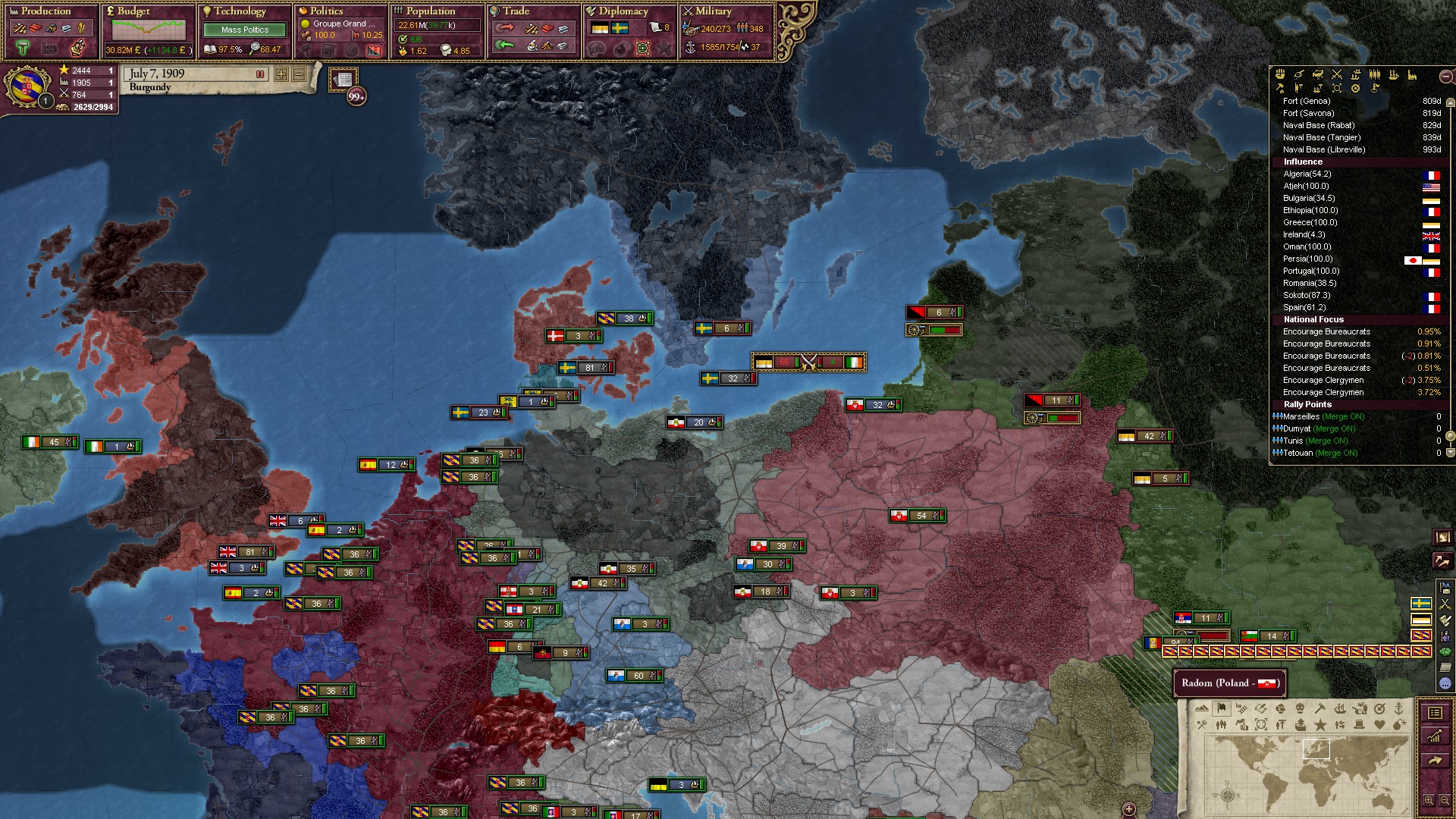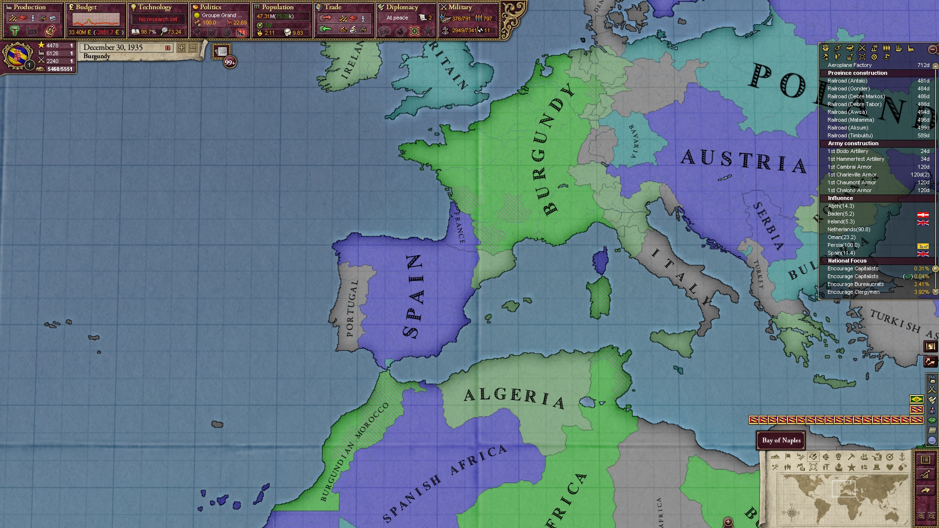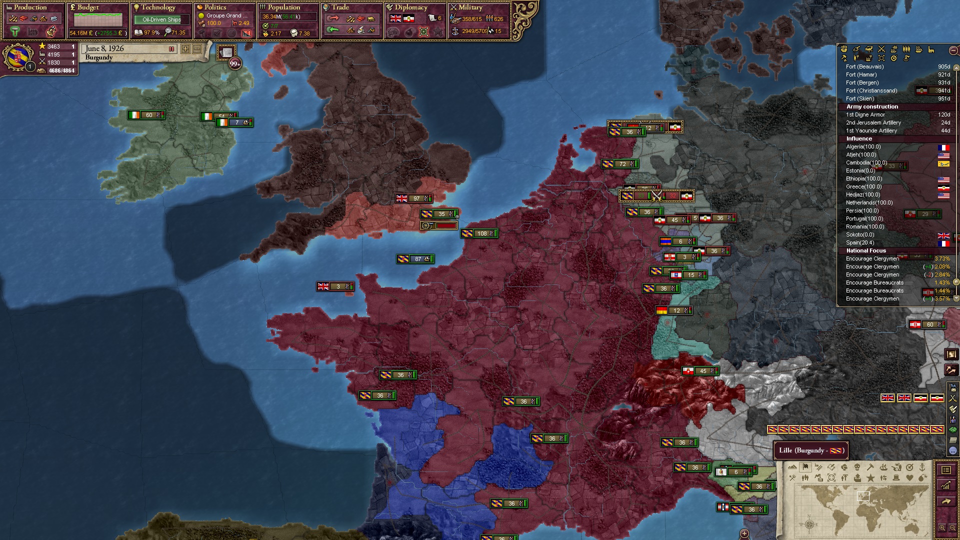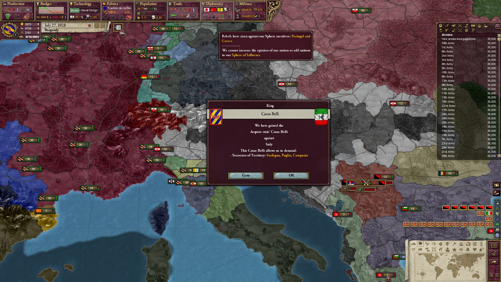 Derweil dachte ich darüber nach, ob ich nicht doch noch in letzter Minute ein Entscheidung einfügen sollte, die gegen Italien und in Richtung Kaiserkrone zielt, so a la: "Wenn Burgund ganz Italien unter seine direkte Kontrolle und/oder Sphäre bringt, dann kann es sich zum Kaiser sowie italienischen König krönen, erhält Kernprovinzen auf ganz Italien und stellt alle einheimischen Reiche vor die Wahl, sich entweder zu unterwerfen oder zu kämpfen." Diese Entscheidung würde alt-burgundische und napoleon-französische Linien aufgreifen, komplett dem Trend der italienischen nationaler Vereinigung zuwiderlaufen und faktisch die Transformation Burgunds in ein Lotharingien bedeuten...