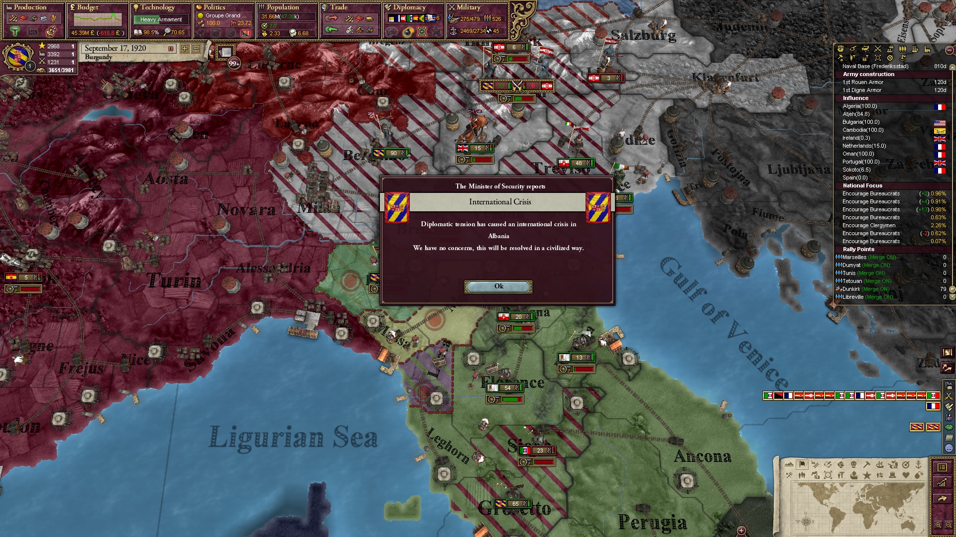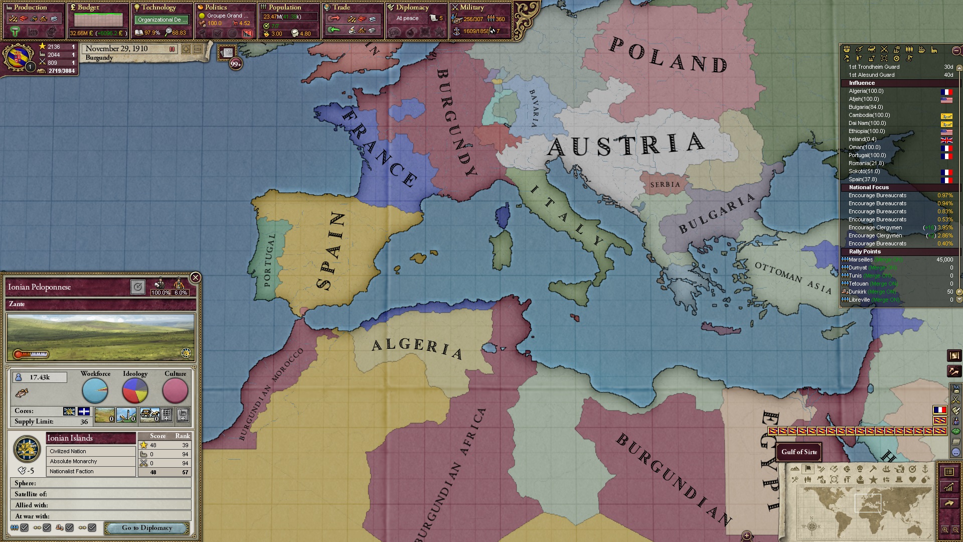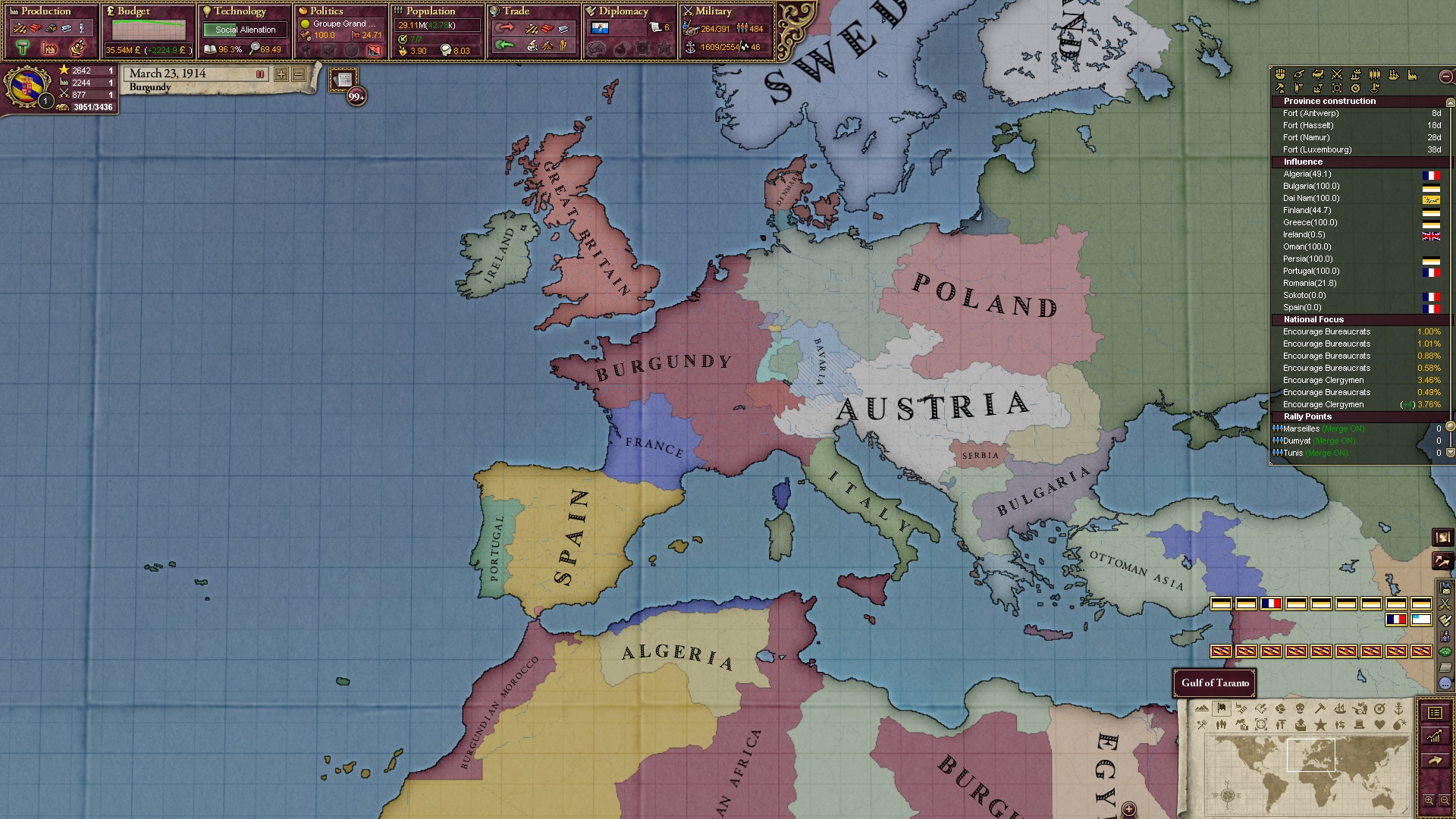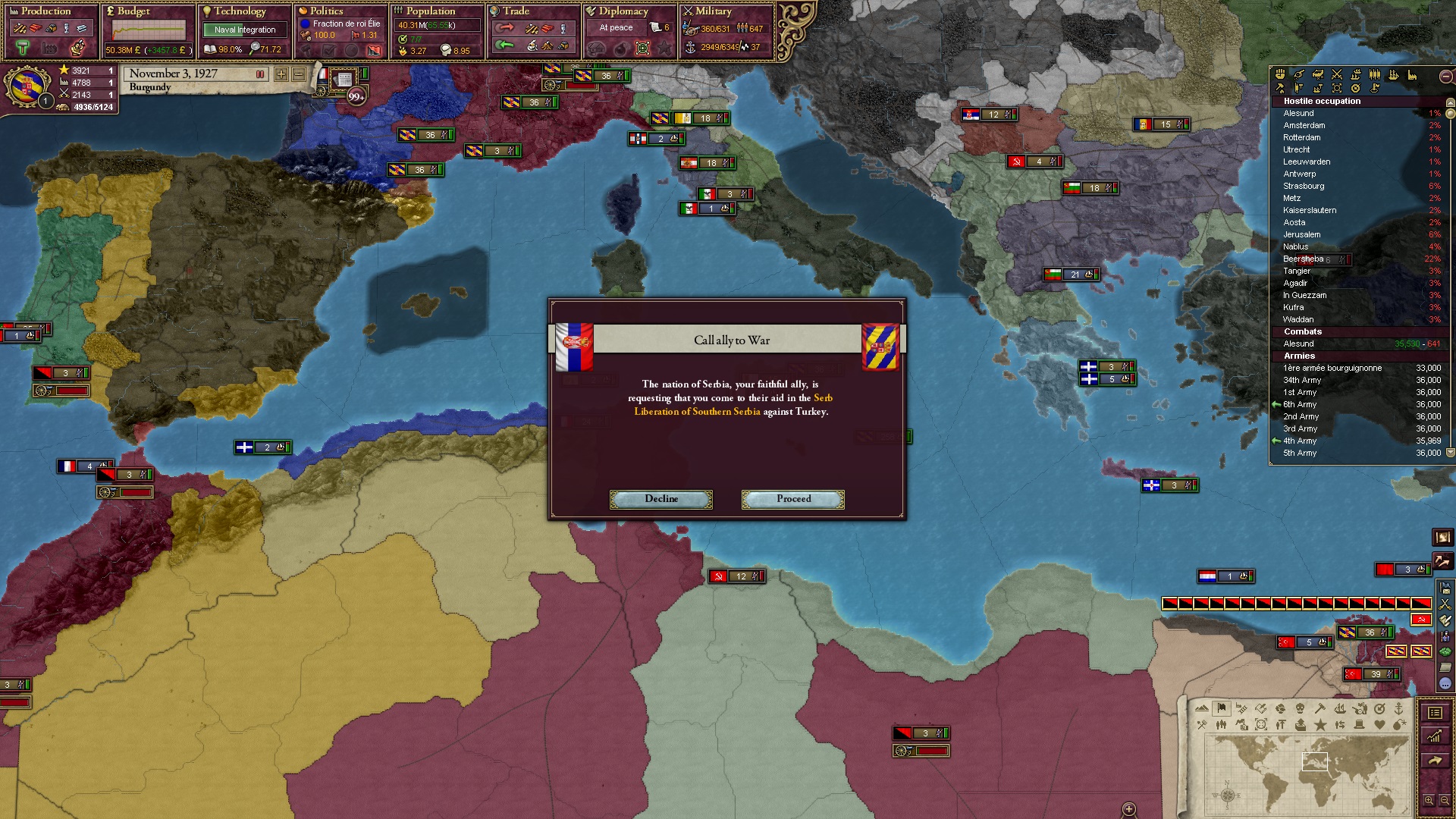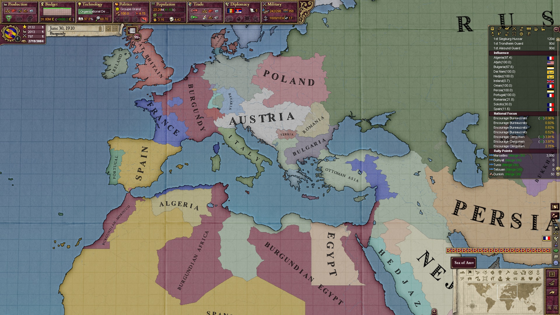 Derweil dachte ich darüber nach, ob ich nicht doch noch in letzter Minute ein Entscheidung einfügen sollte, die gegen Italien und in Richtung Kaiserkrone zielt, so a la: "Wenn Burgund ganz Italien unter seine direkte Kontrolle und/oder Sphäre bringt, dann kann es sich zum Kaiser sowie italienischen König krönen, erhält Kernprovinzen auf ganz Italien und stellt alle einheimischen Reiche vor die Wahl, sich entweder zu unterwerfen oder zu kämpfen." Diese Entscheidung würde alt-burgundische und napoleon-französische Linien aufgreifen, komplett dem Trend der italienischen nationaler Vereinigung zuwiderlaufen und faktisch die Transformation Burgunds in ein Lotharingien bedeuten...