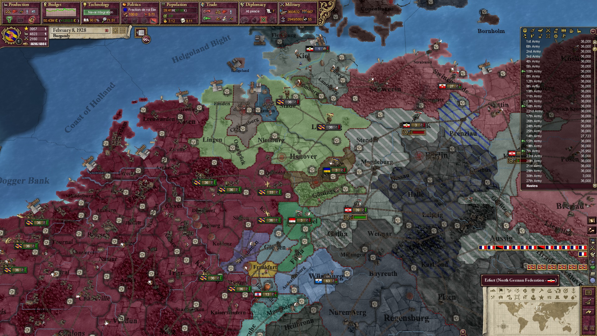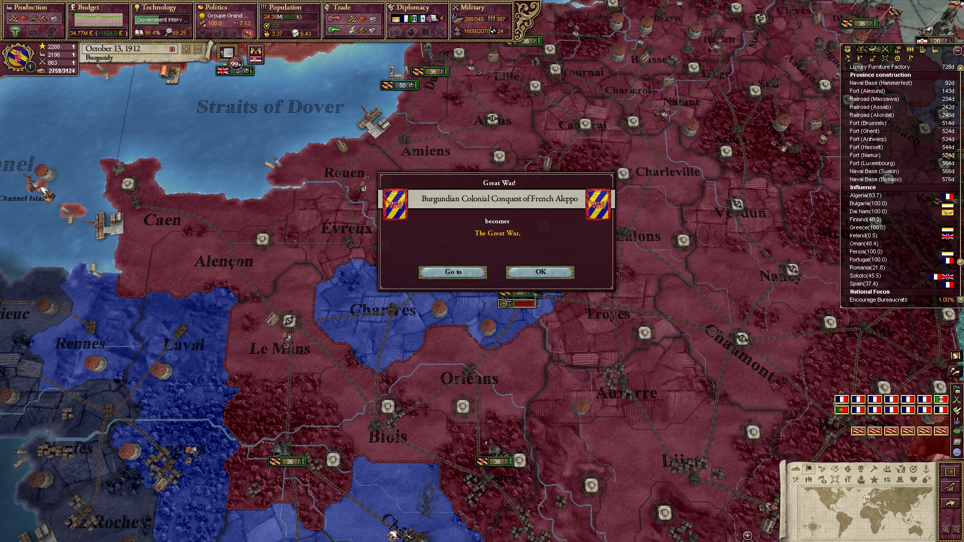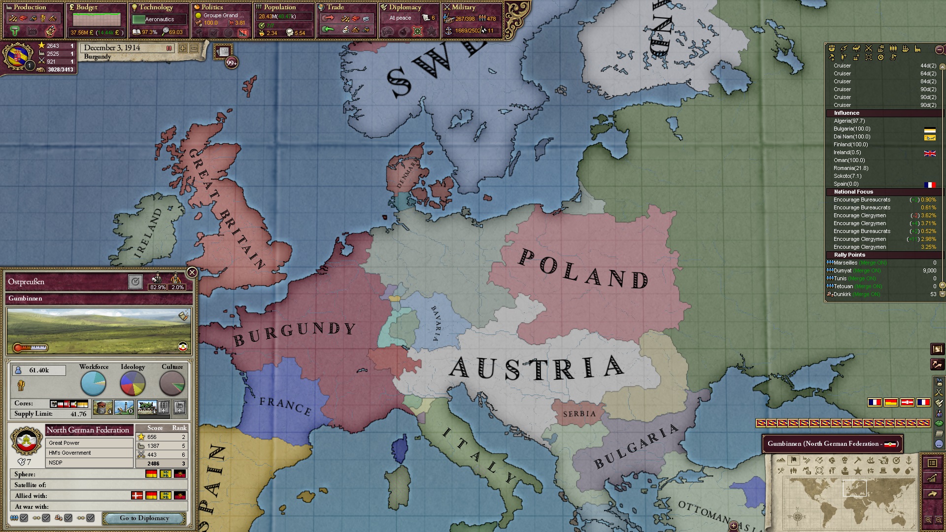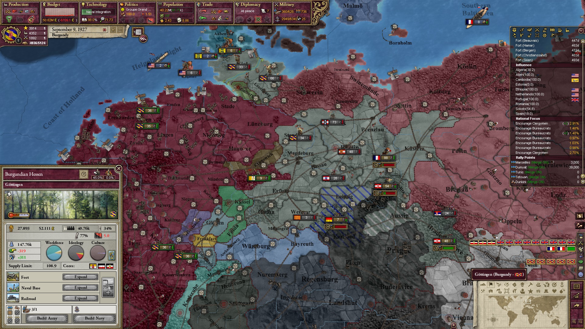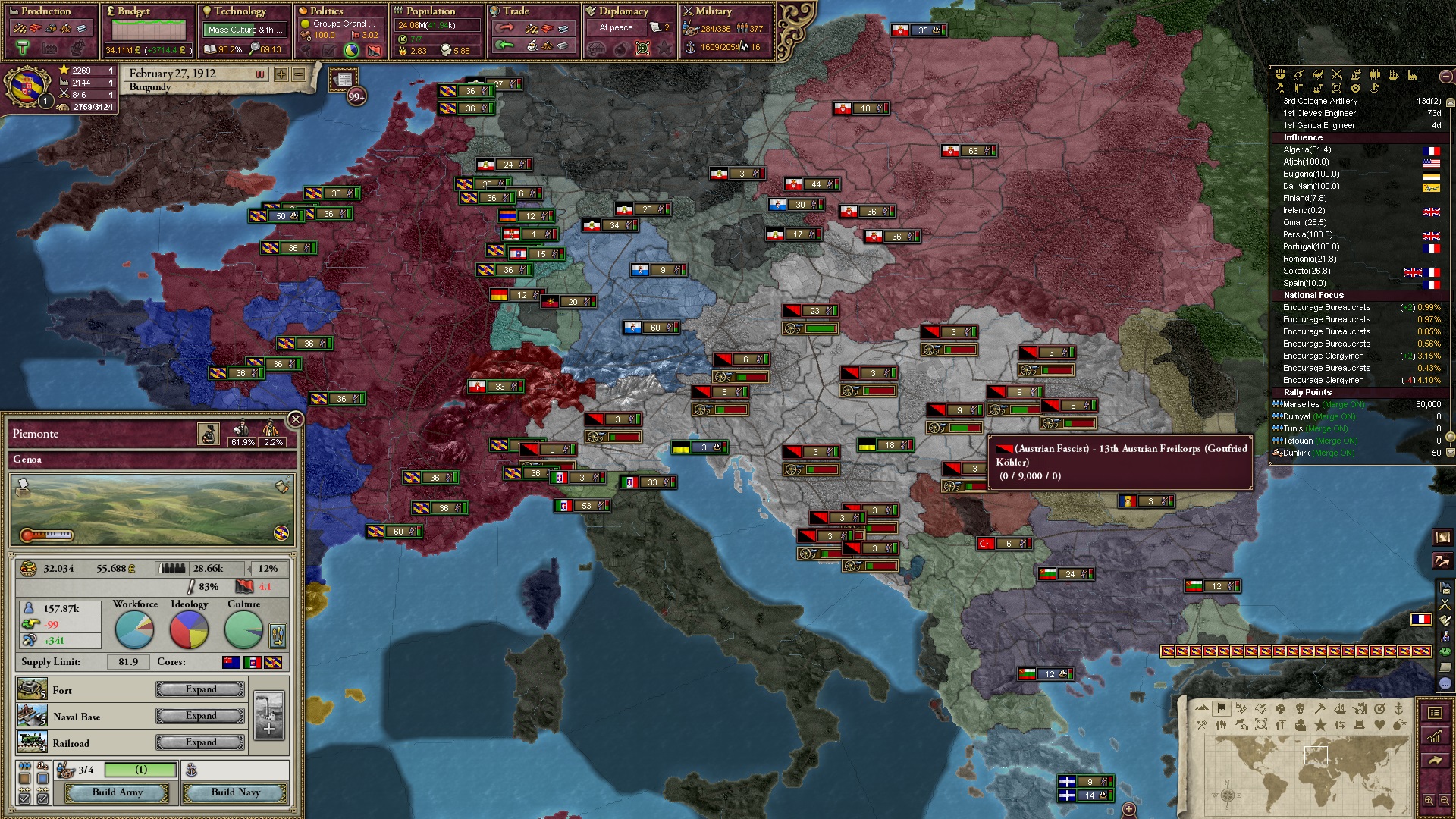Derweil dachte ich darüber nach, ob ich nicht doch noch in letzter Minute ein Entscheidung einfügen sollte, die gegen Italien und in Richtung Kaiserkrone zielt, so a la: "Wenn Burgund ganz Italien unter seine direkte Kontrolle und/oder Sphäre bringt, dann kann es sich zum Kaiser sowie italienischen König krönen, erhält Kernprovinzen auf ganz Italien und stellt alle einheimischen Reiche vor die Wahl, sich entweder zu unterwerfen oder zu kämpfen." Diese Entscheidung würde alt-burgundische und napoleon-französische Linien aufgreifen, komplett dem Trend der italienischen nationaler Vereinigung zuwiderlaufen und faktisch die Transformation Burgunds in ein Lotharingien bedeuten...