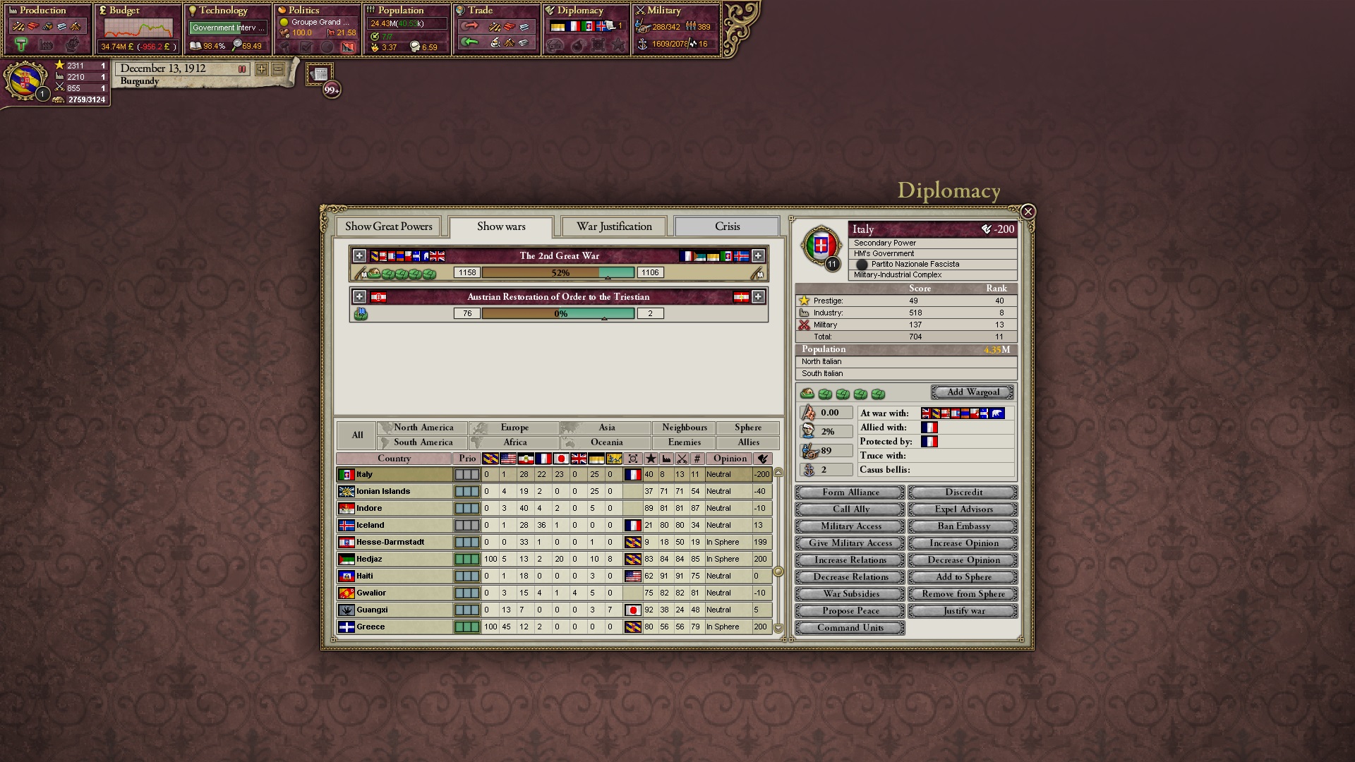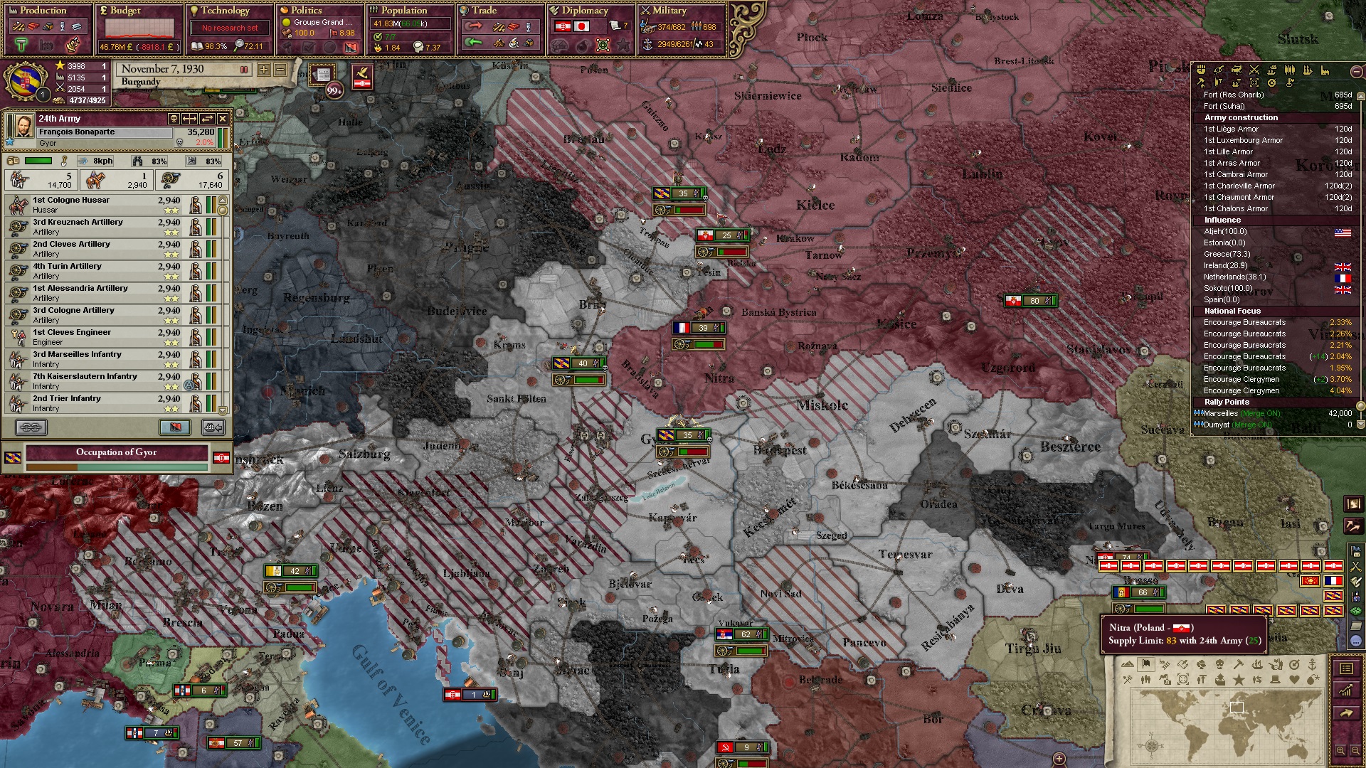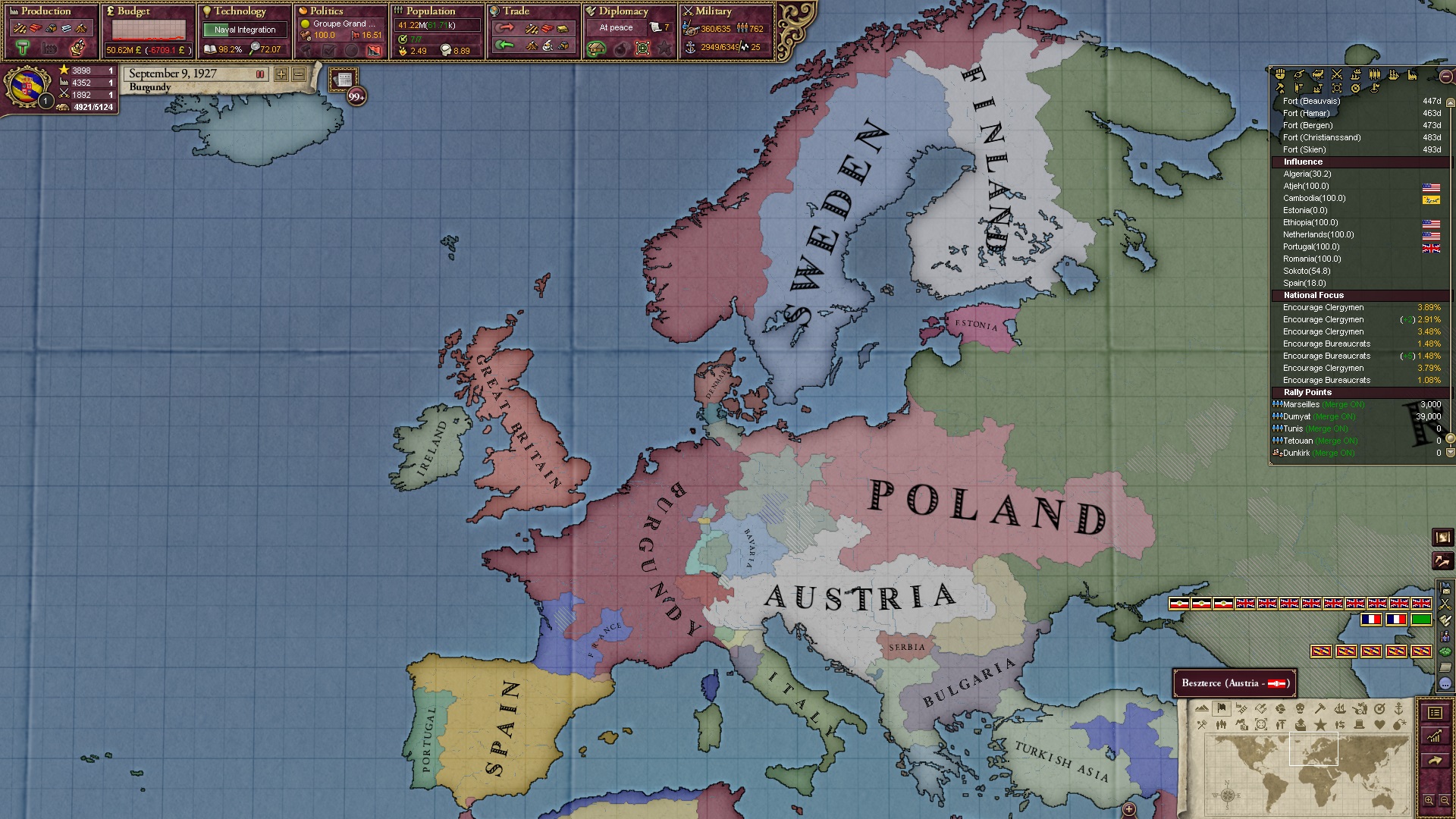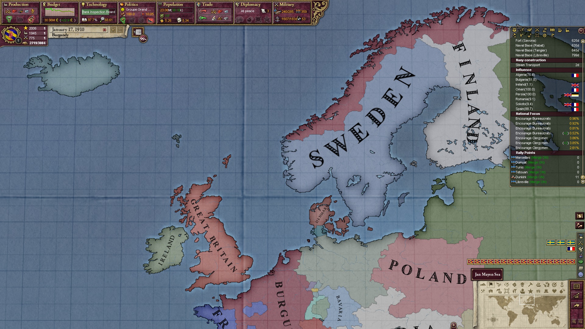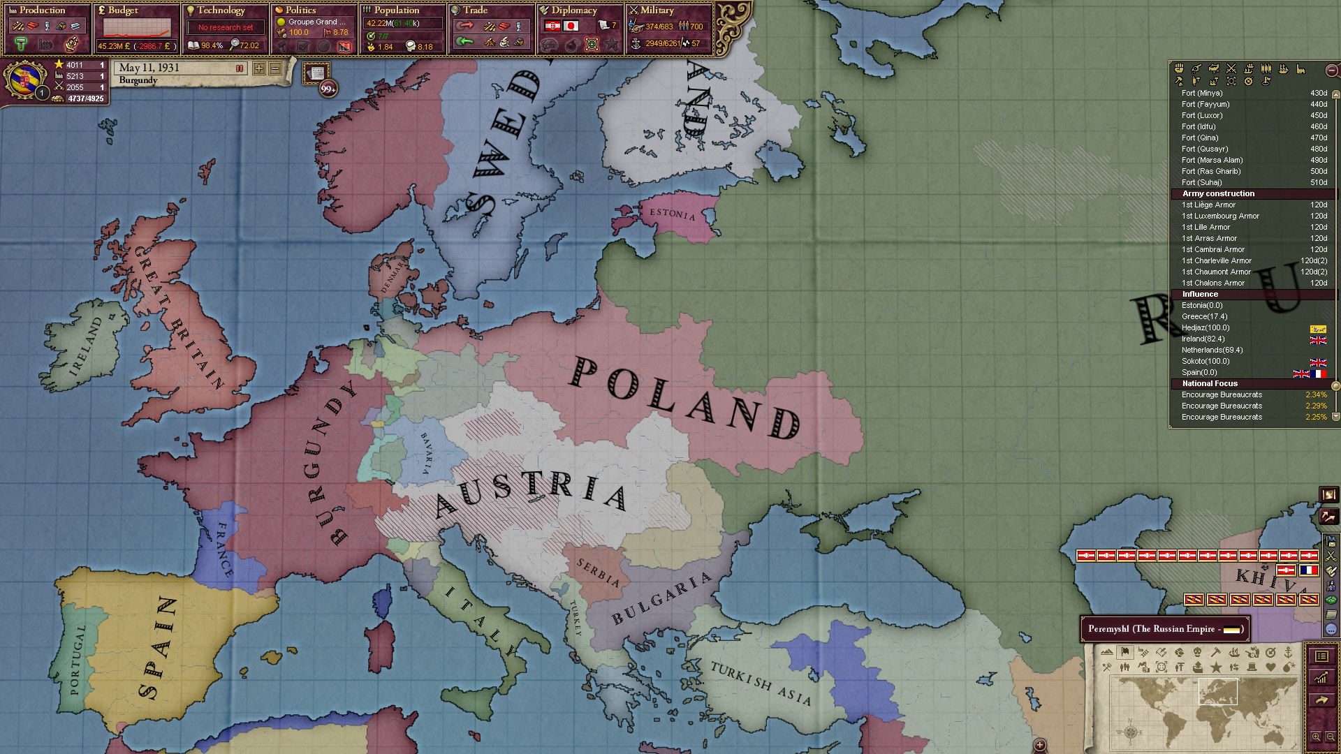 Derweil dachte ich darüber nach, ob ich nicht doch noch in letzter Minute ein Entscheidung einfügen sollte, die gegen Italien und in Richtung Kaiserkrone zielt, so a la: "Wenn Burgund ganz Italien unter seine direkte Kontrolle und/oder Sphäre bringt, dann kann es sich zum Kaiser sowie italienischen König krönen, erhält Kernprovinzen auf ganz Italien und stellt alle einheimischen Reiche vor die Wahl, sich entweder zu unterwerfen oder zu kämpfen." Diese Entscheidung würde alt-burgundische und napoleon-französische Linien aufgreifen, komplett dem Trend der italienischen nationaler Vereinigung zuwiderlaufen und faktisch die Transformation Burgunds in ein Lotharingien bedeuten...