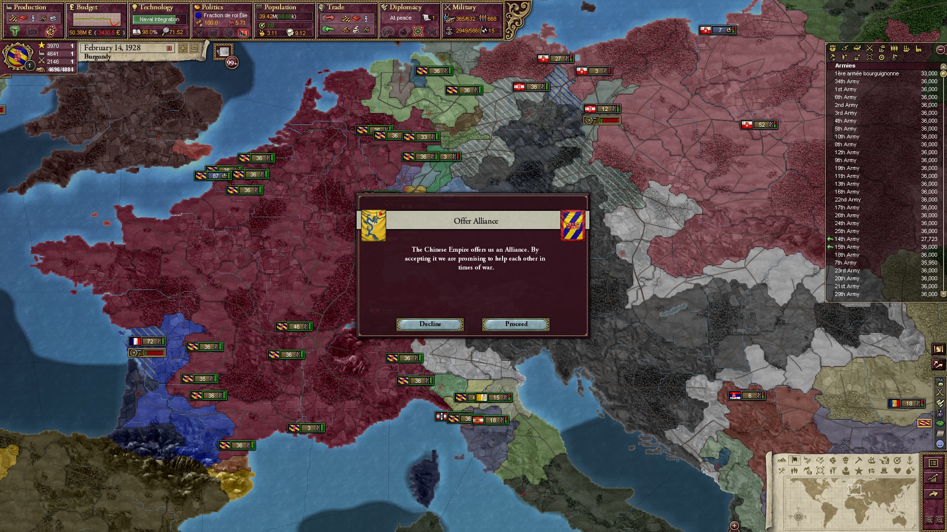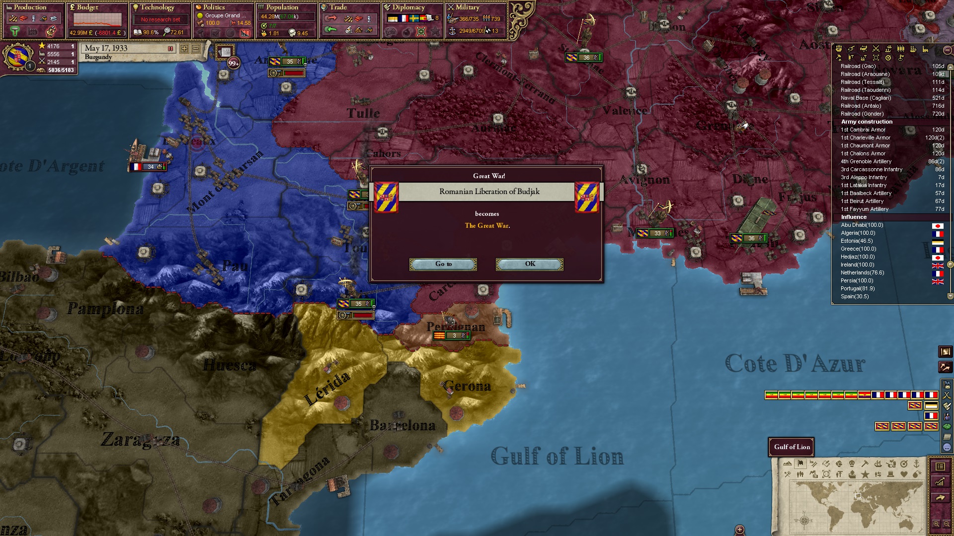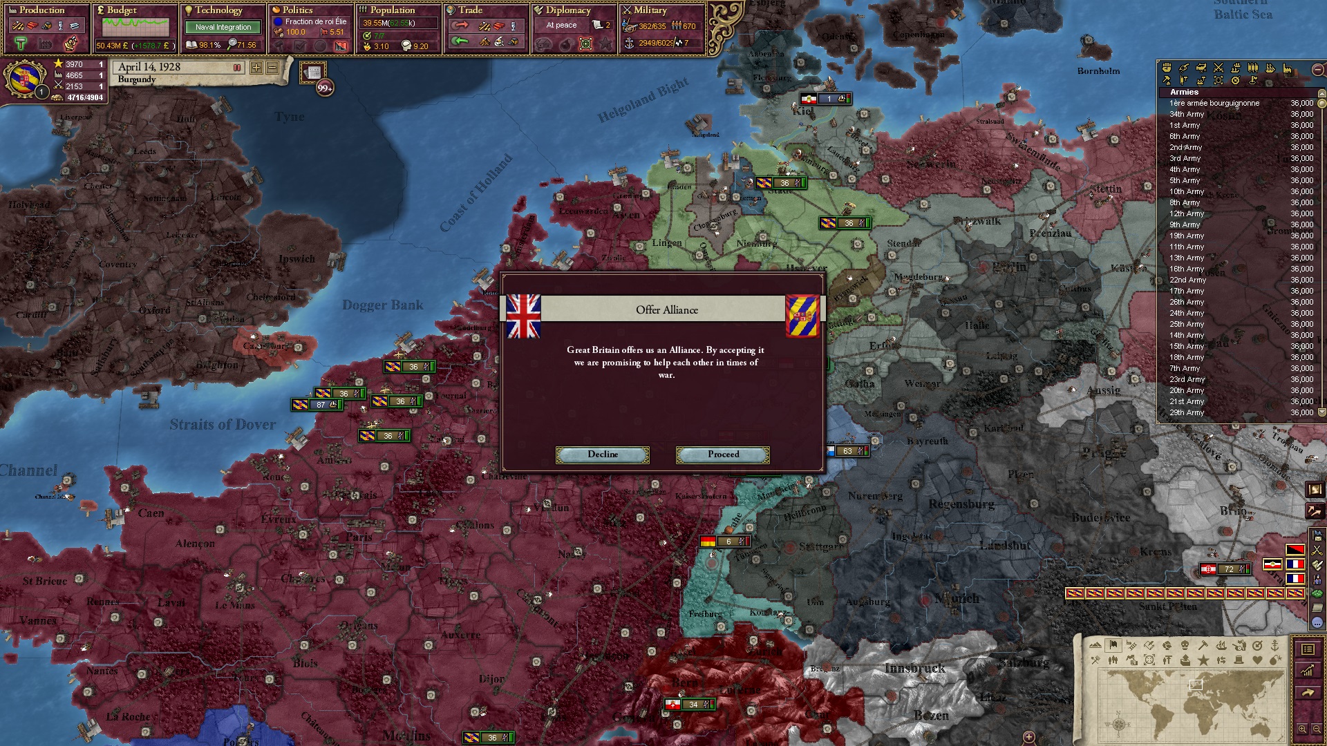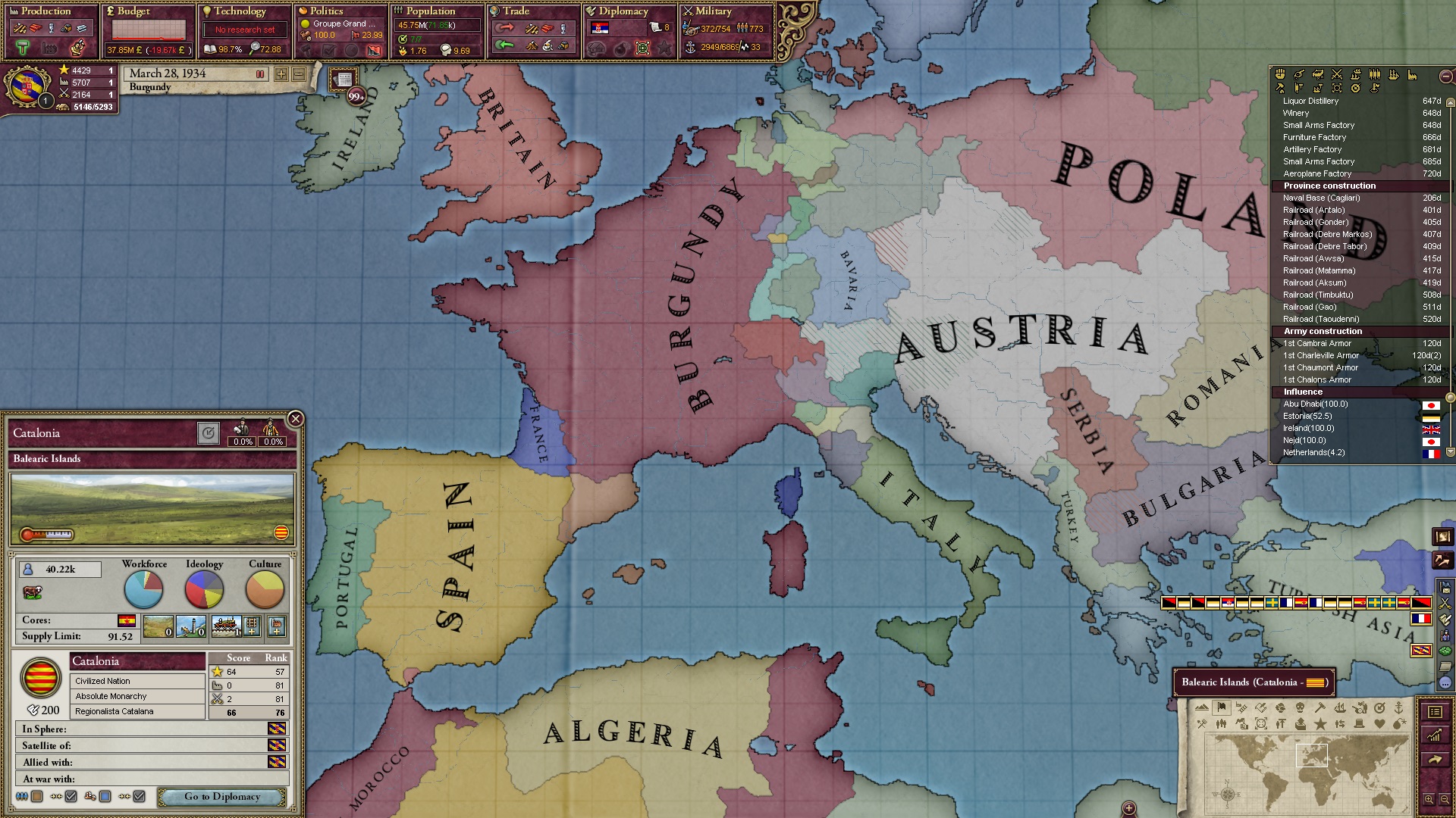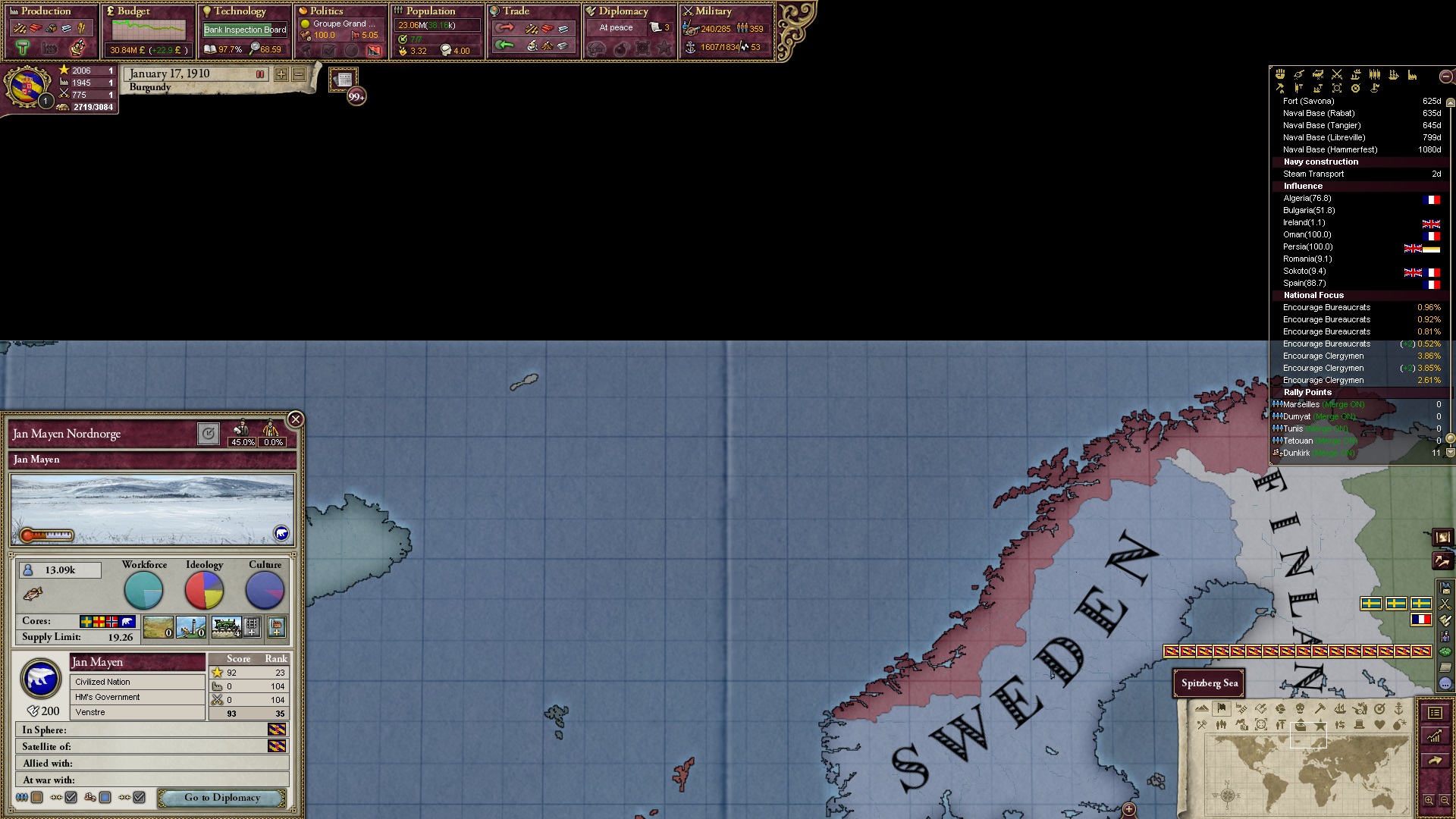 Derweil dachte ich darüber nach, ob ich nicht doch noch in letzter Minute ein Entscheidung einfügen sollte, die gegen Italien und in Richtung Kaiserkrone zielt, so a la: "Wenn Burgund ganz Italien unter seine direkte Kontrolle und/oder Sphäre bringt, dann kann es sich zum Kaiser sowie italienischen König krönen, erhält Kernprovinzen auf ganz Italien und stellt alle einheimischen Reiche vor die Wahl, sich entweder zu unterwerfen oder zu kämpfen." Diese Entscheidung würde alt-burgundische und napoleon-französische Linien aufgreifen, komplett dem Trend der italienischen nationaler Vereinigung zuwiderlaufen und faktisch die Transformation Burgunds in ein Lotharingien bedeuten...