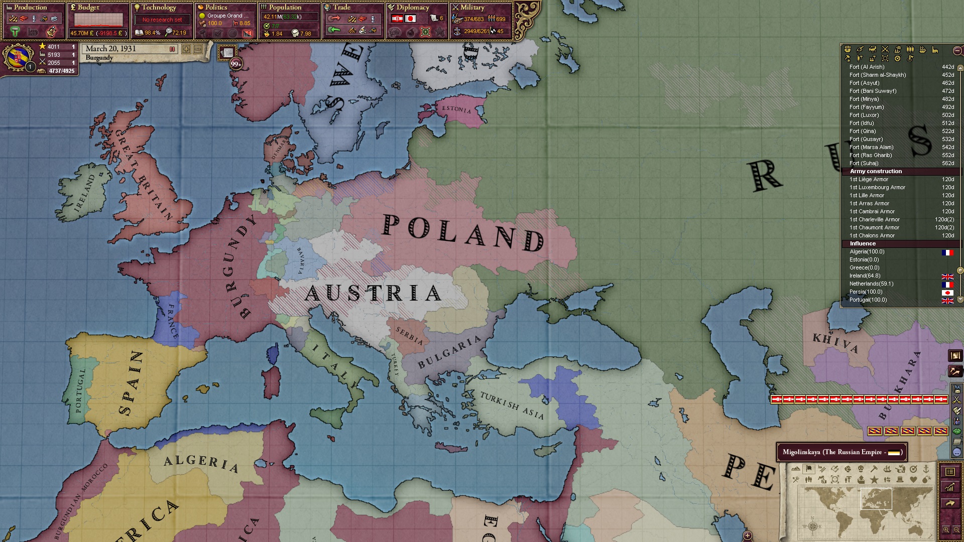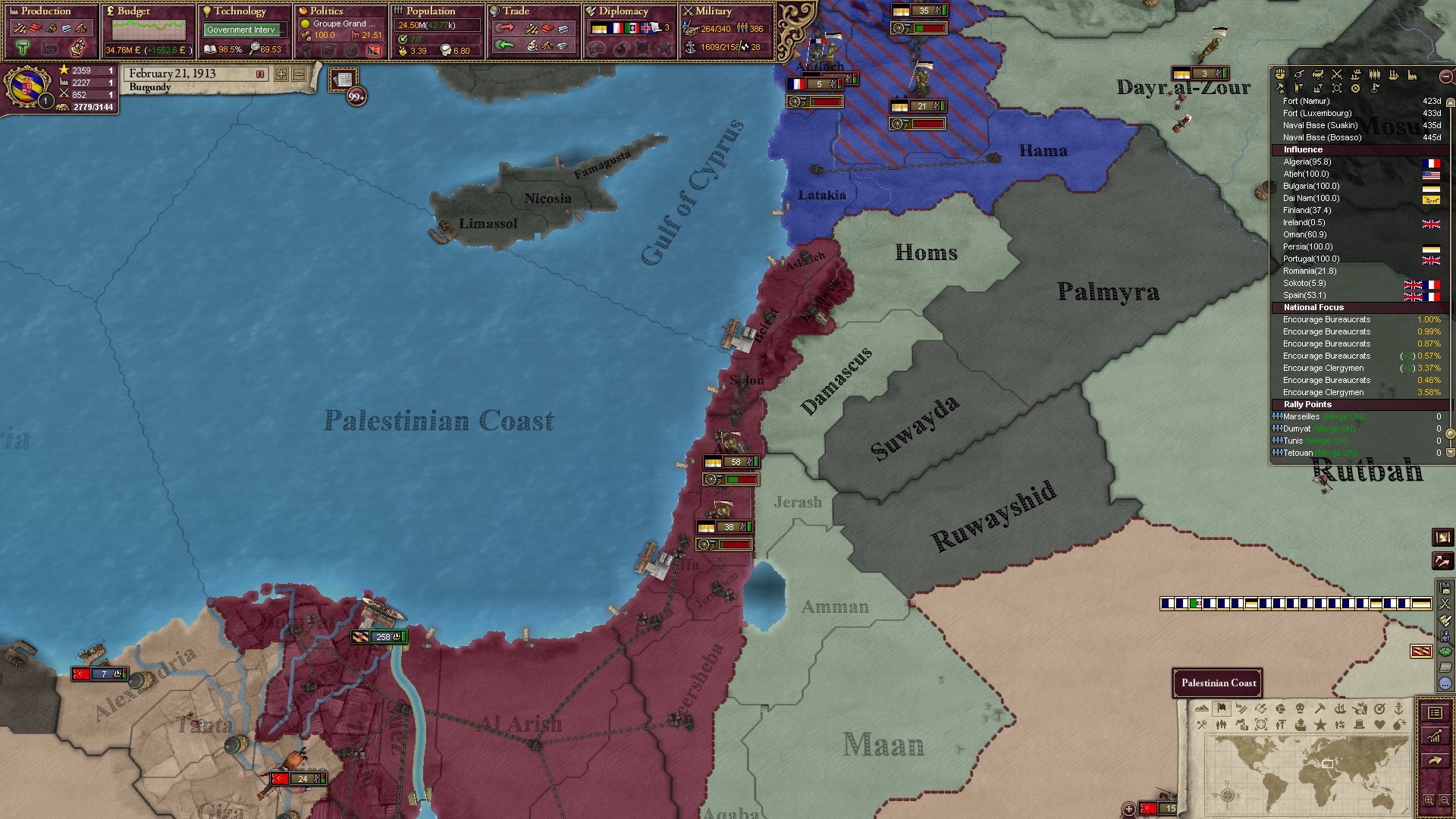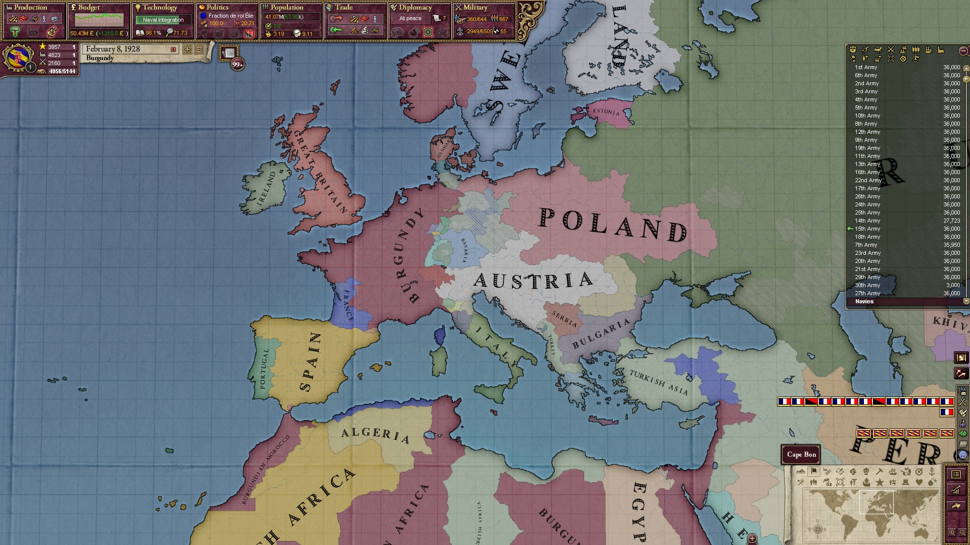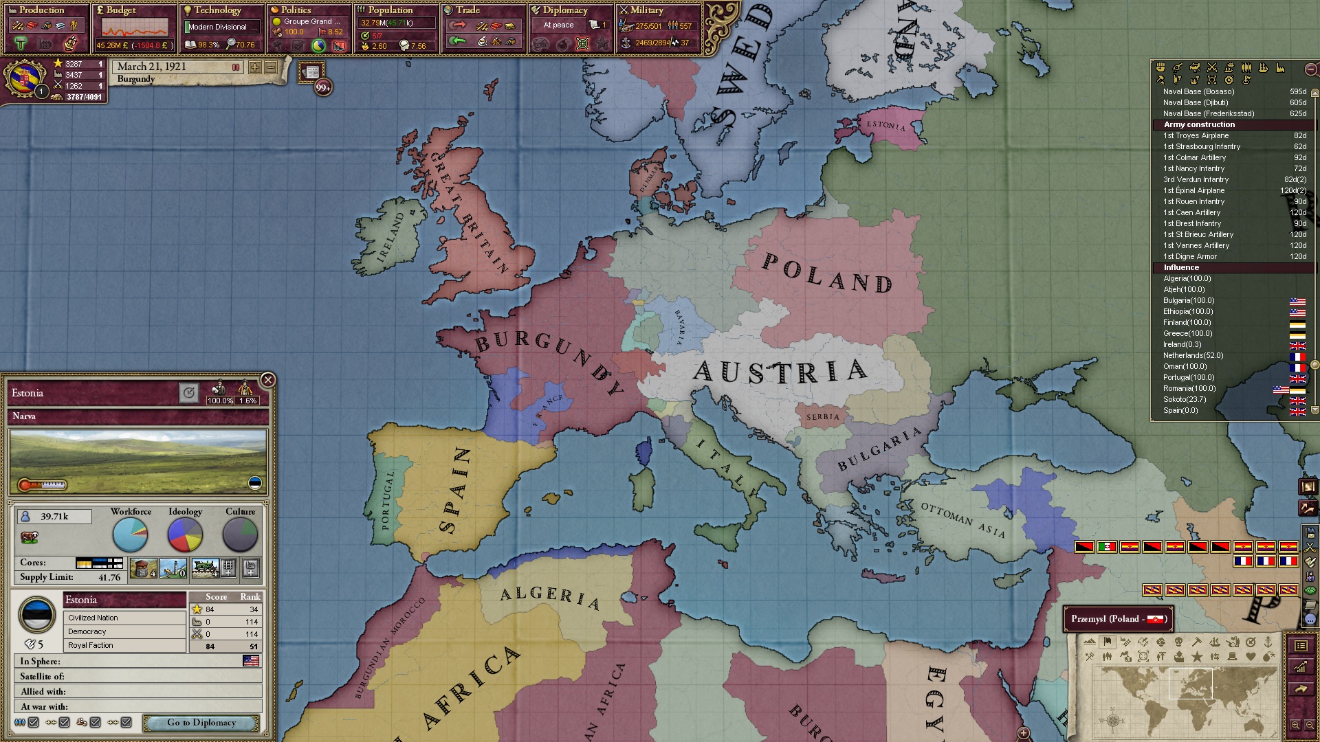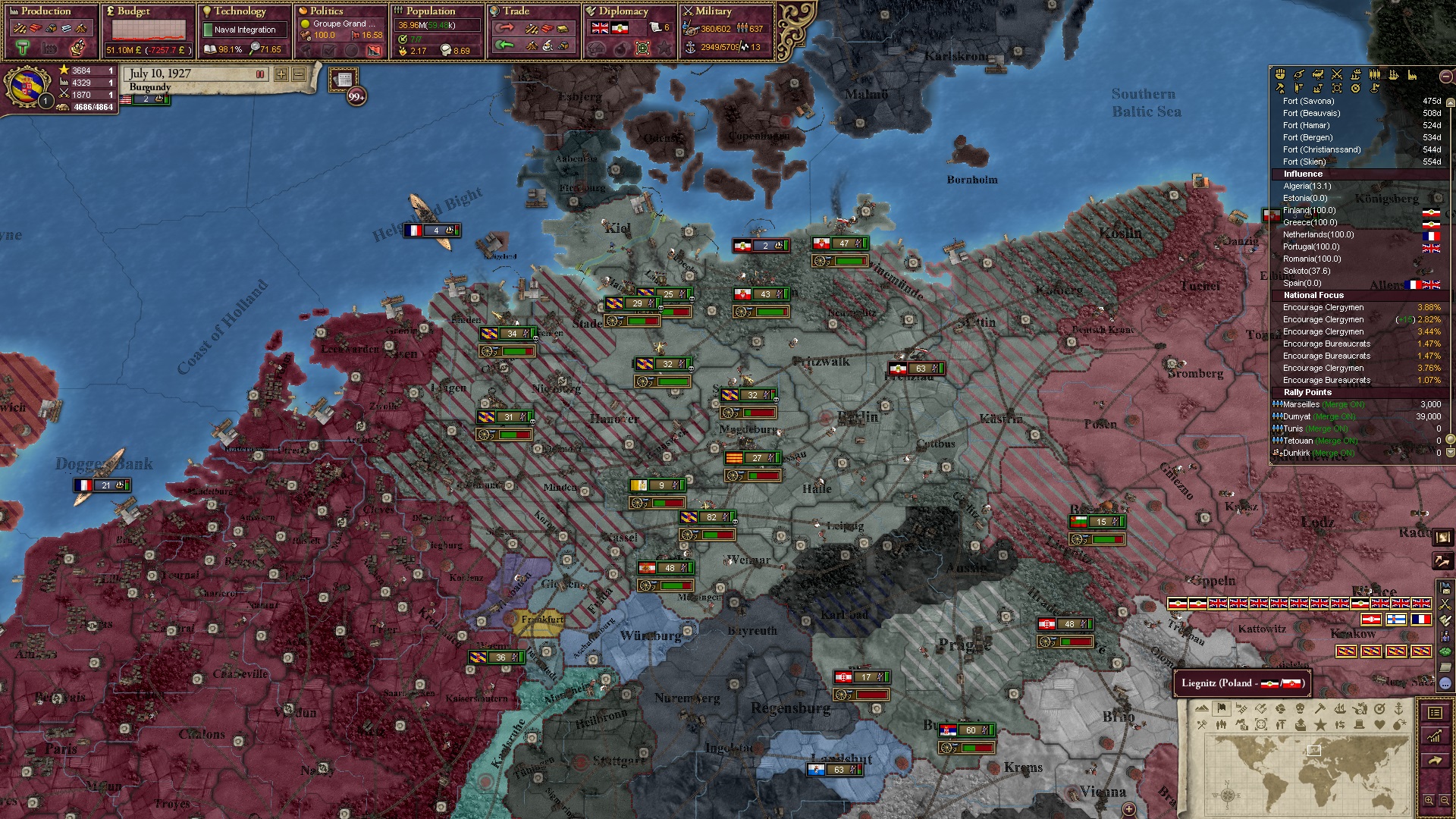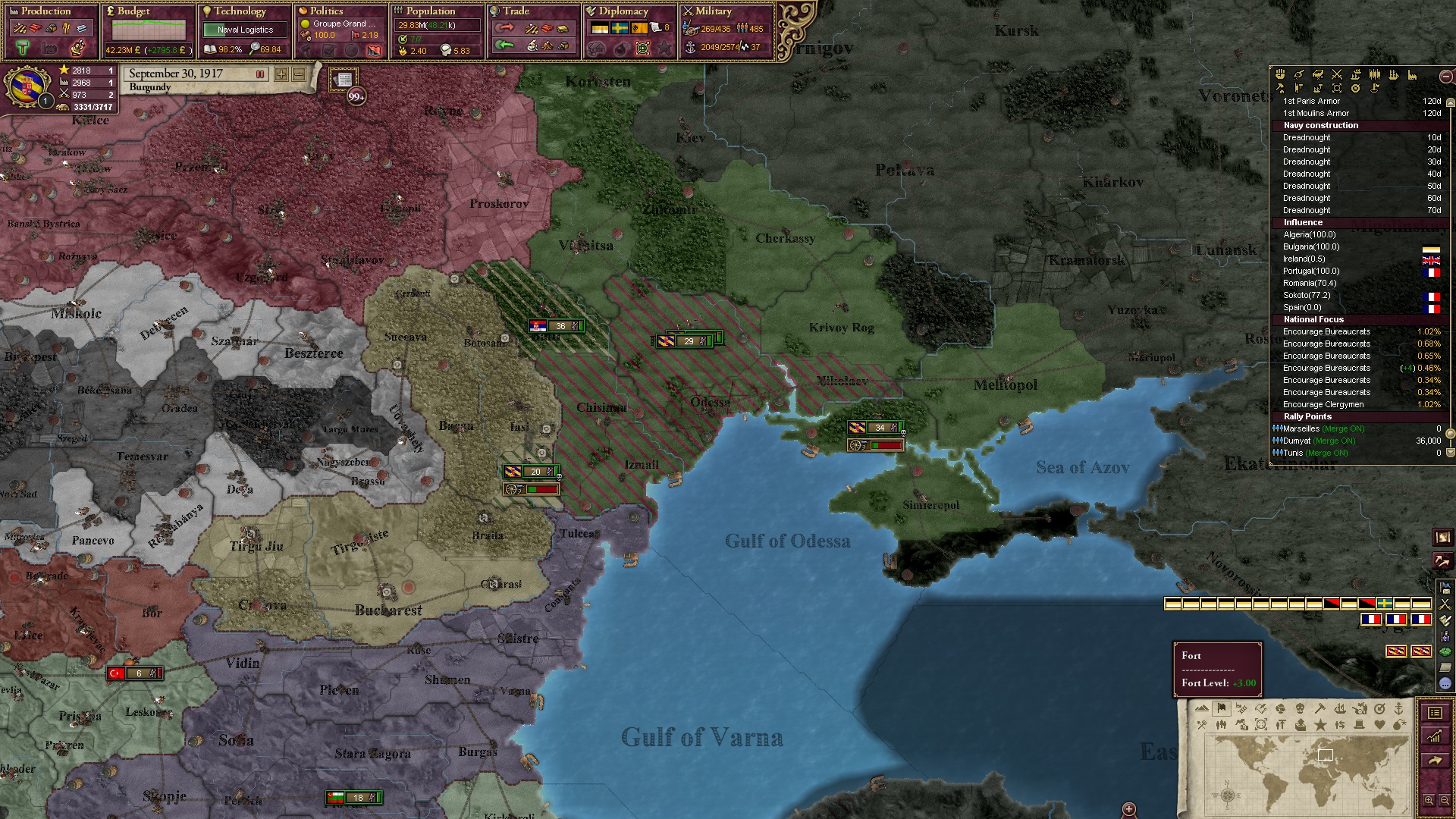 Derweil dachte ich darüber nach, ob ich nicht doch noch in letzter Minute ein Entscheidung einfügen sollte, die gegen Italien und in Richtung Kaiserkrone zielt, so a la: "Wenn Burgund ganz Italien unter seine direkte Kontrolle und/oder Sphäre bringt, dann kann es sich zum Kaiser sowie italienischen König krönen, erhält Kernprovinzen auf ganz Italien und stellt alle einheimischen Reiche vor die Wahl, sich entweder zu unterwerfen oder zu kämpfen." Diese Entscheidung würde alt-burgundische und napoleon-französische Linien aufgreifen, komplett dem Trend der italienischen nationaler Vereinigung zuwiderlaufen und faktisch die Transformation Burgunds in ein Lotharingien bedeuten...