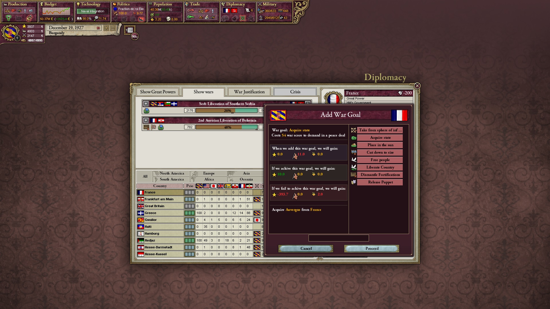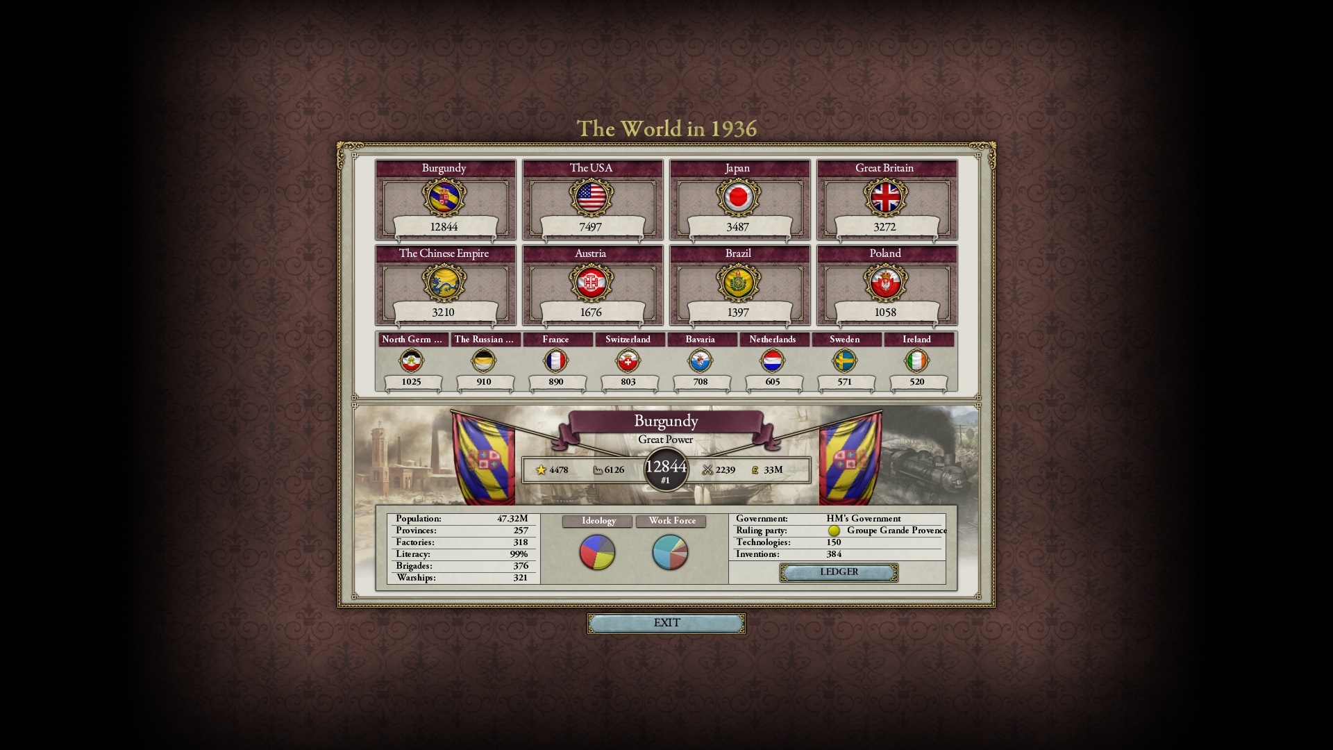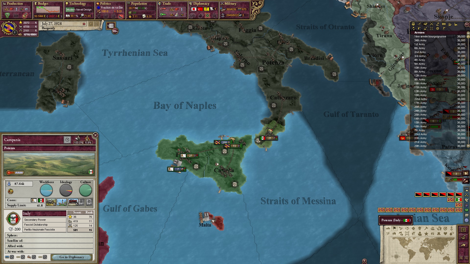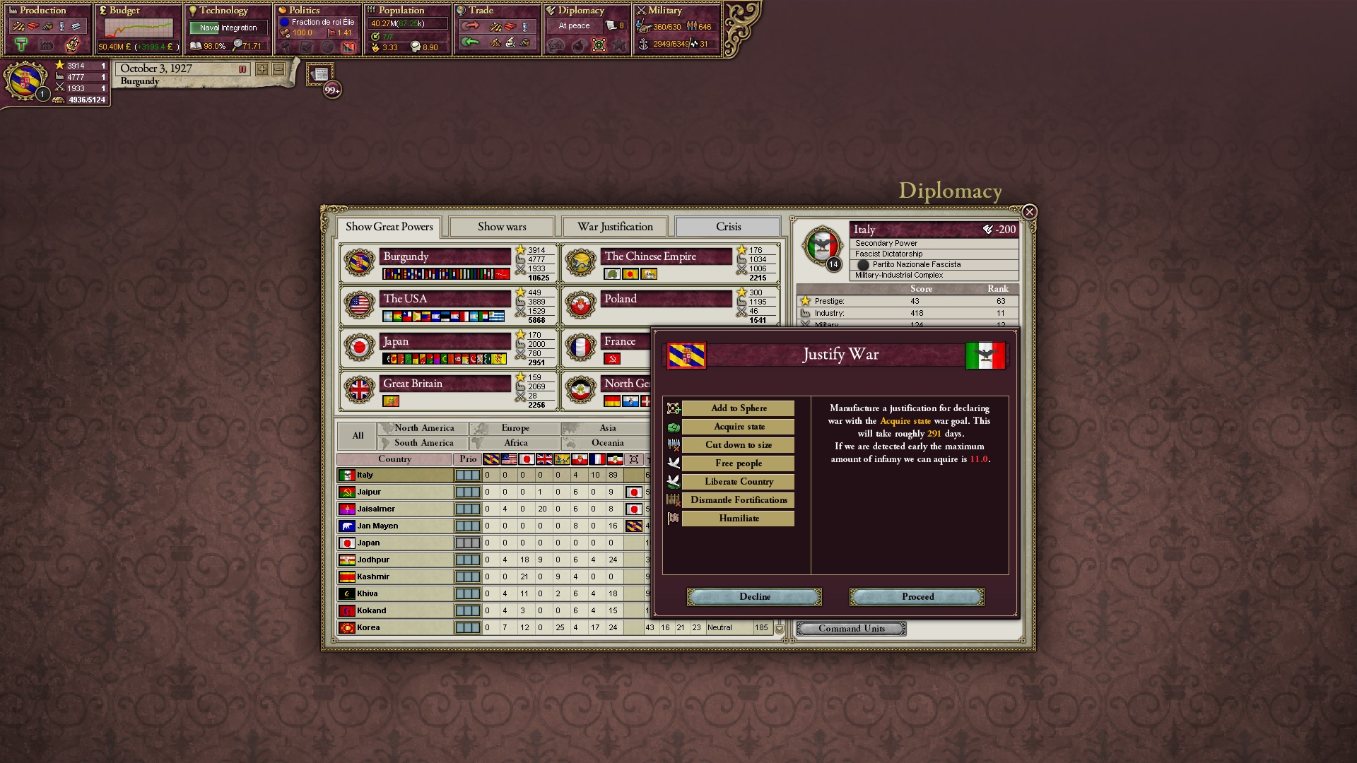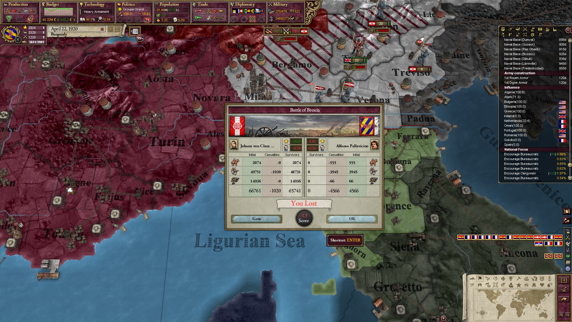 Derweil dachte ich darüber nach, ob ich nicht doch noch in letzter Minute ein Entscheidung einfügen sollte, die gegen Italien und in Richtung Kaiserkrone zielt, so a la: "Wenn Burgund ganz Italien unter seine direkte Kontrolle und/oder Sphäre bringt, dann kann es sich zum Kaiser sowie italienischen König krönen, erhält Kernprovinzen auf ganz Italien und stellt alle einheimischen Reiche vor die Wahl, sich entweder zu unterwerfen oder zu kämpfen." Diese Entscheidung würde alt-burgundische und napoleon-französische Linien aufgreifen, komplett dem Trend der italienischen nationaler Vereinigung zuwiderlaufen und faktisch die Transformation Burgunds in ein Lotharingien bedeuten...