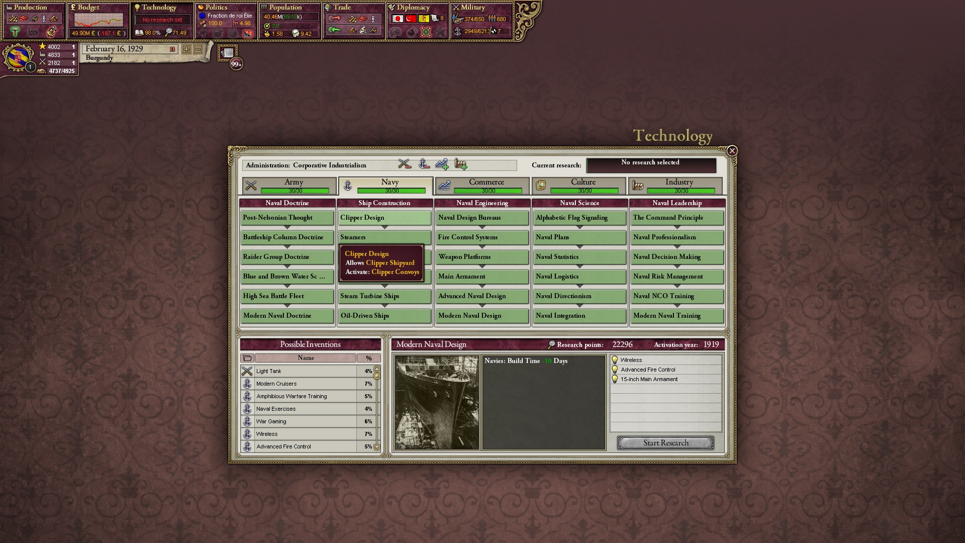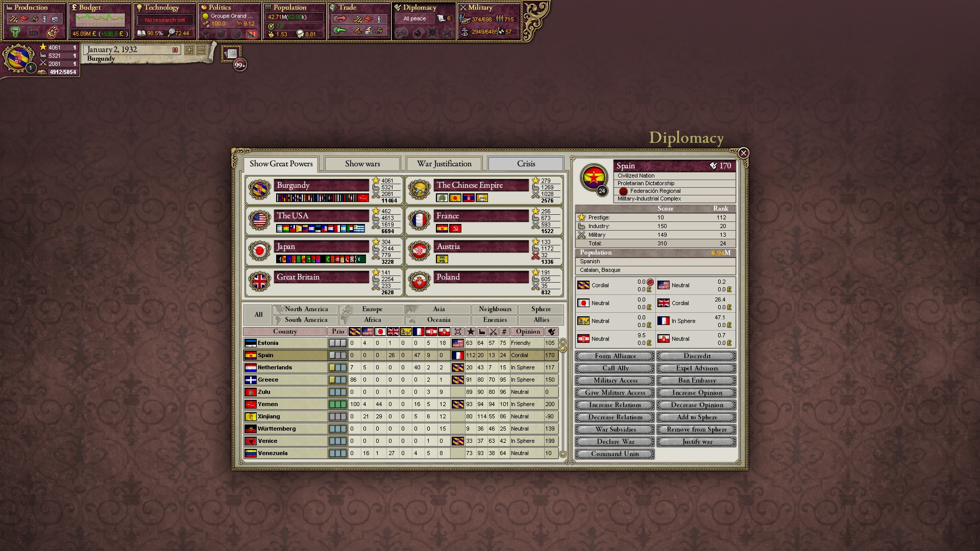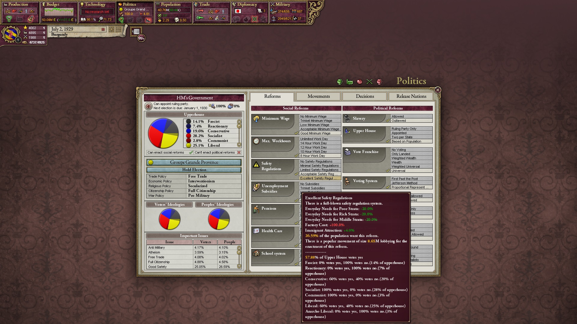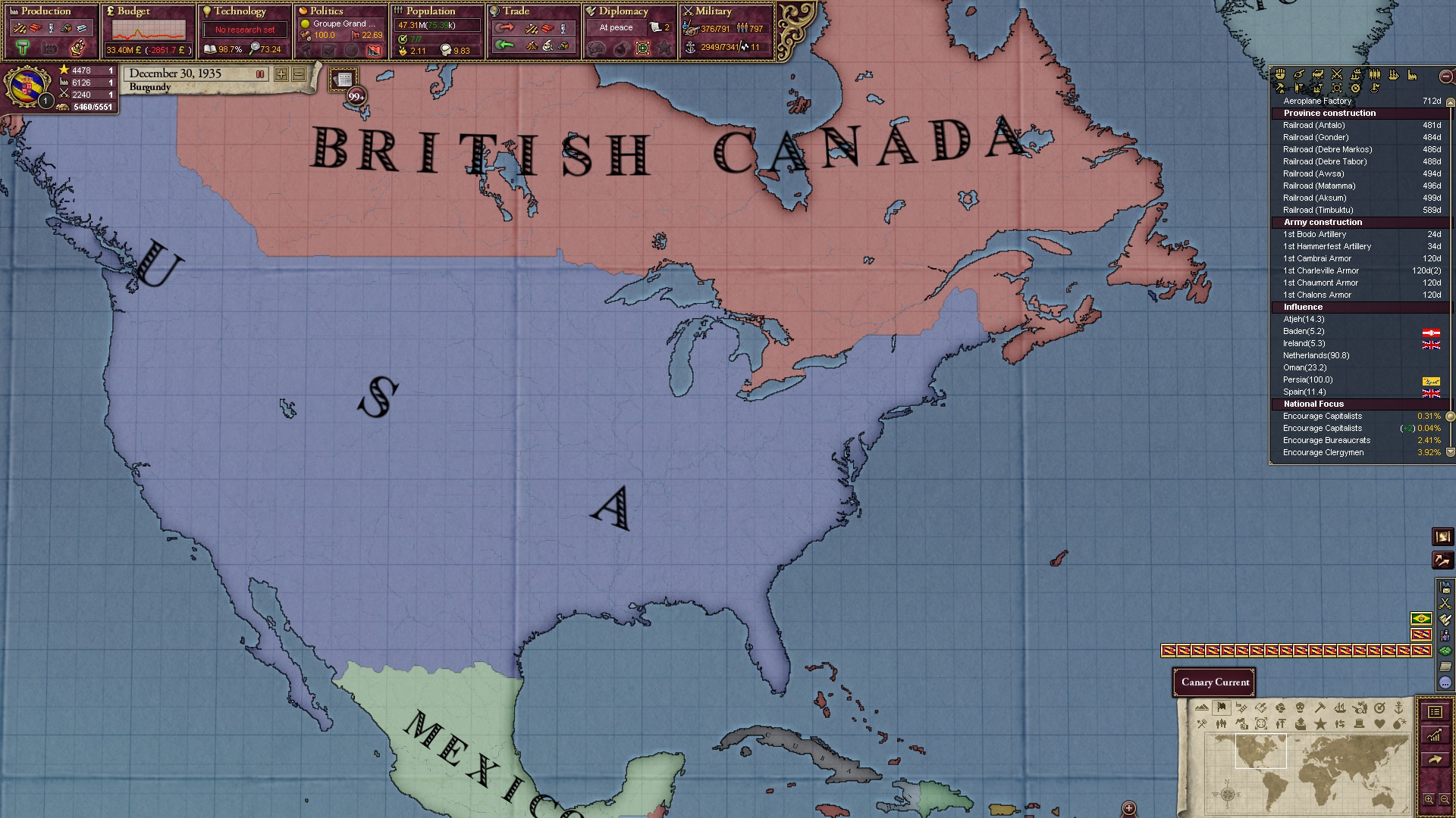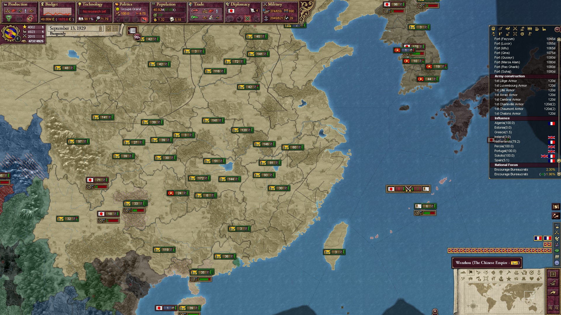 Derweil dachte ich darüber nach, ob ich nicht doch noch in letzter Minute ein Entscheidung einfügen sollte, die gegen Italien und in Richtung Kaiserkrone zielt, so a la: "Wenn Burgund ganz Italien unter seine direkte Kontrolle und/oder Sphäre bringt, dann kann es sich zum Kaiser sowie italienischen König krönen, erhält Kernprovinzen auf ganz Italien und stellt alle einheimischen Reiche vor die Wahl, sich entweder zu unterwerfen oder zu kämpfen." Diese Entscheidung würde alt-burgundische und napoleon-französische Linien aufgreifen, komplett dem Trend der italienischen nationaler Vereinigung zuwiderlaufen und faktisch die Transformation Burgunds in ein Lotharingien bedeuten...
