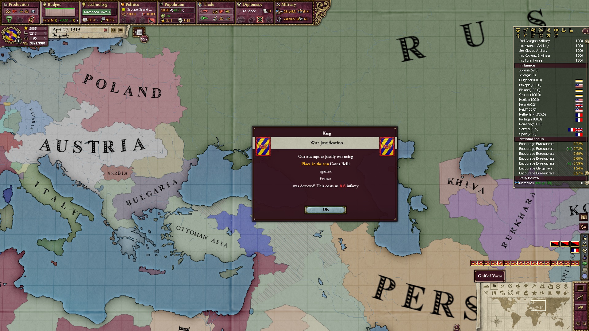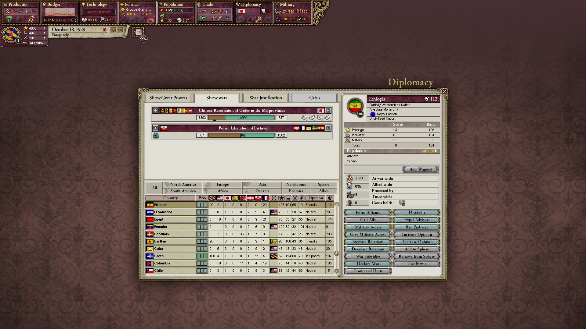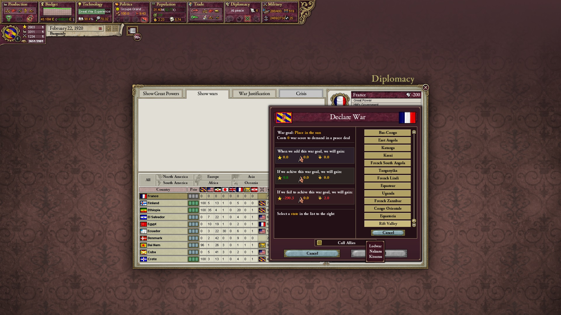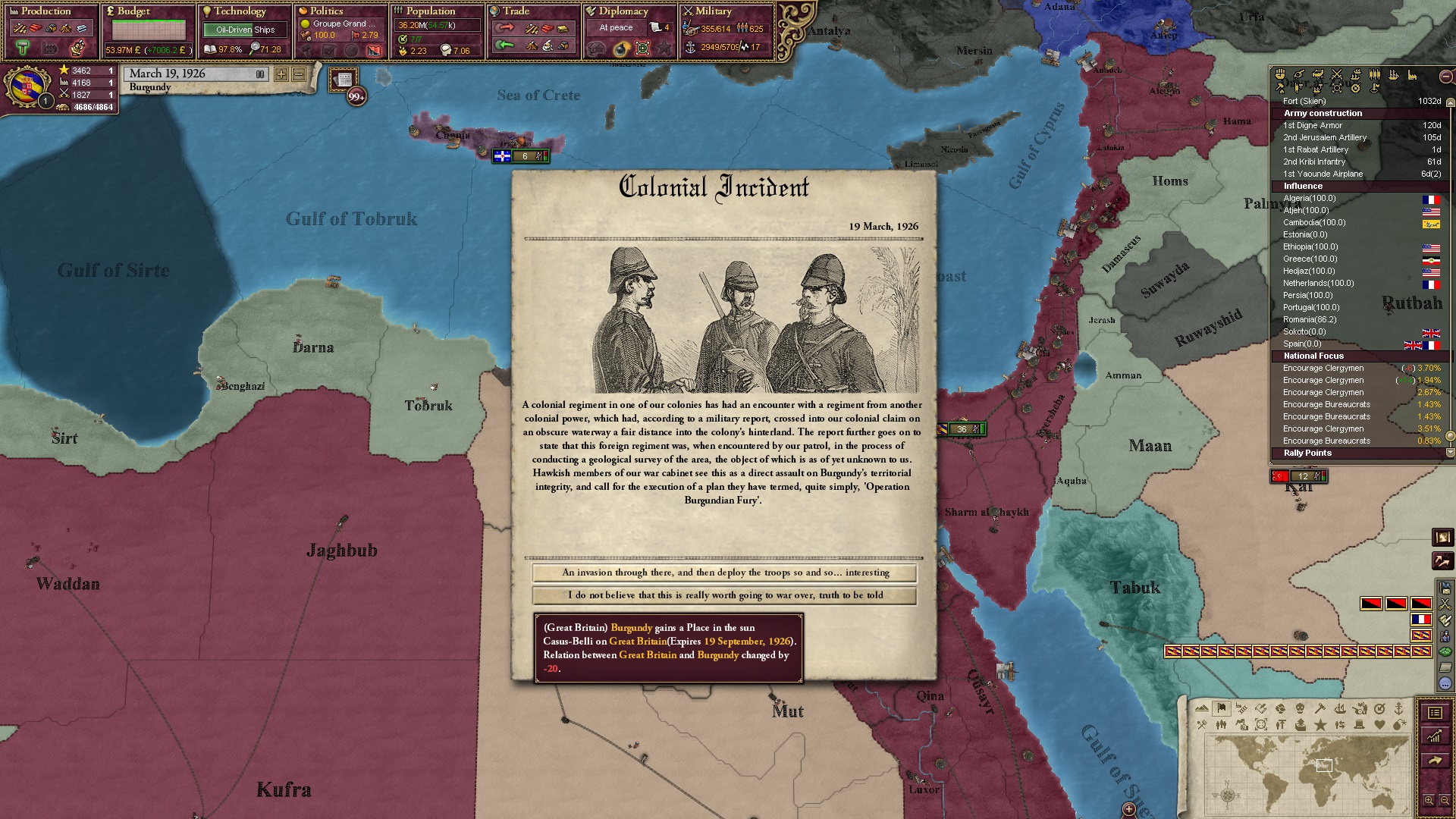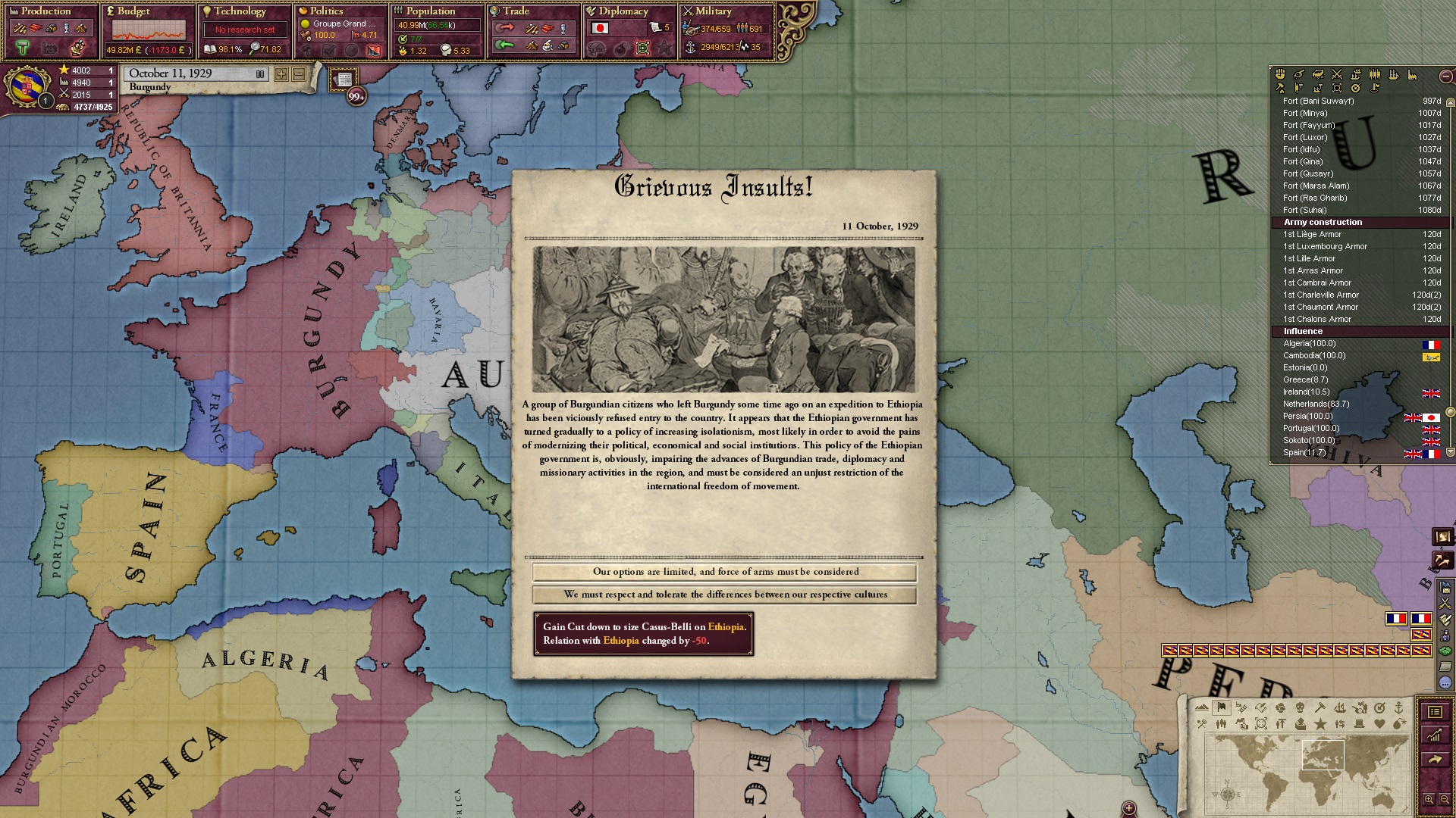 Ich beginne derweil damit, einen Kriegsgrund gegen Äthiopien zu fingieren, da diese immer noch als unzivilisiert zählen, und nehme zwei Drittel der maximal möglichen Infamie hin.