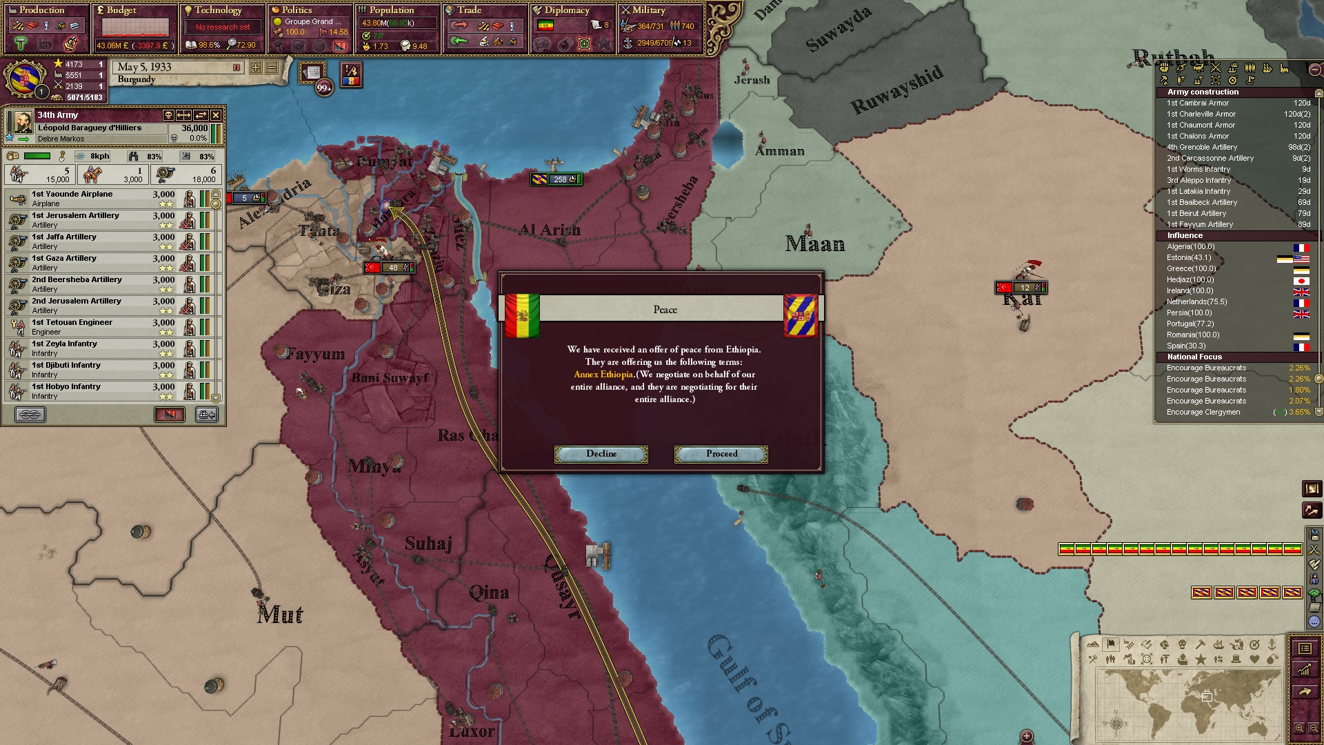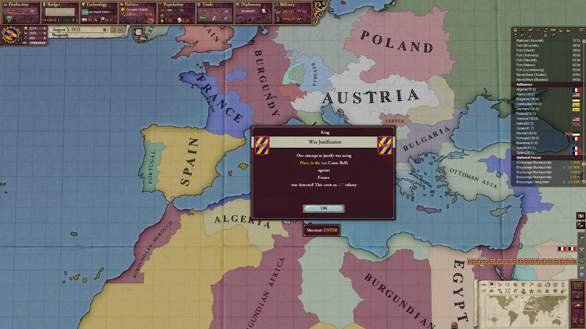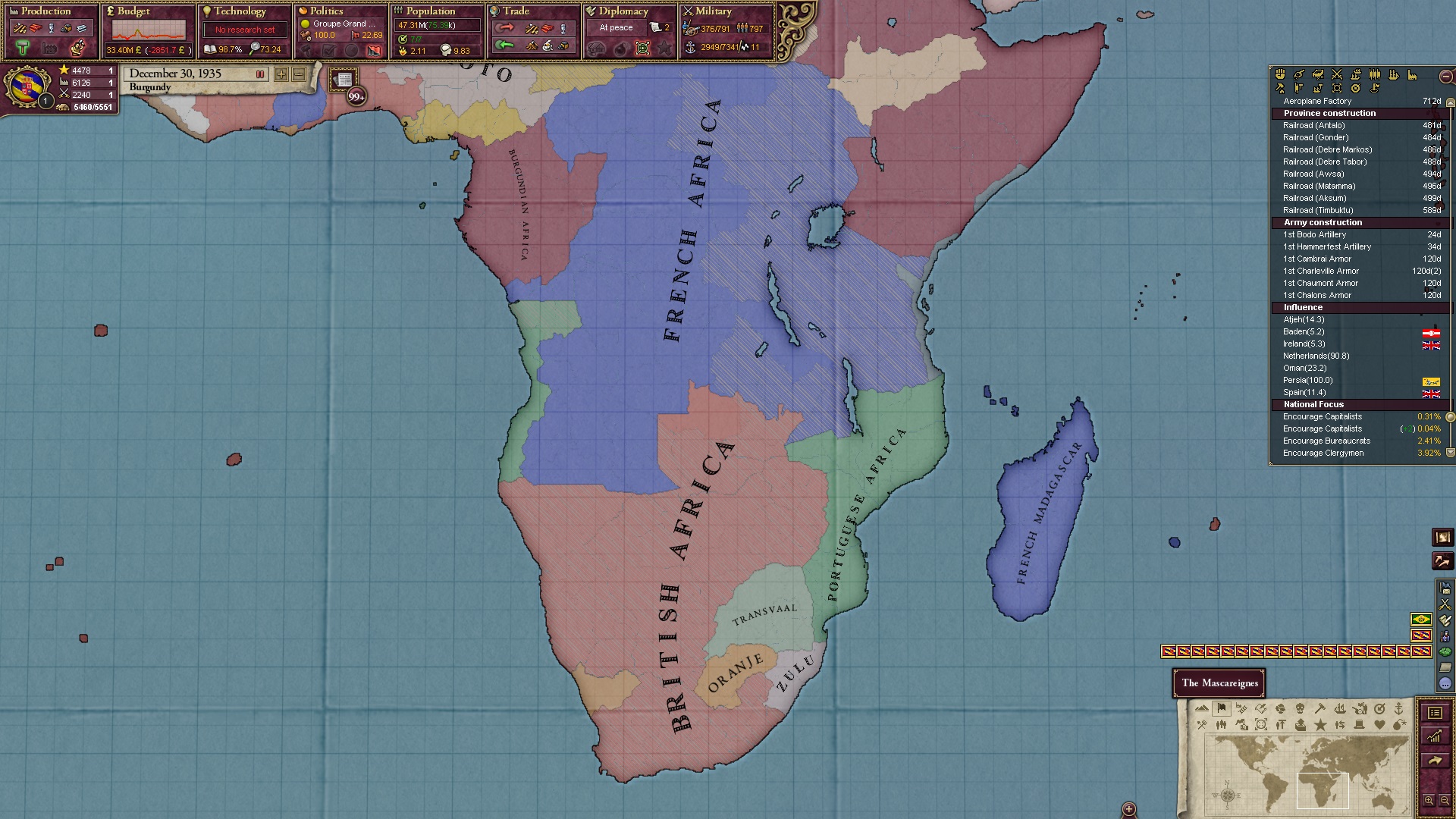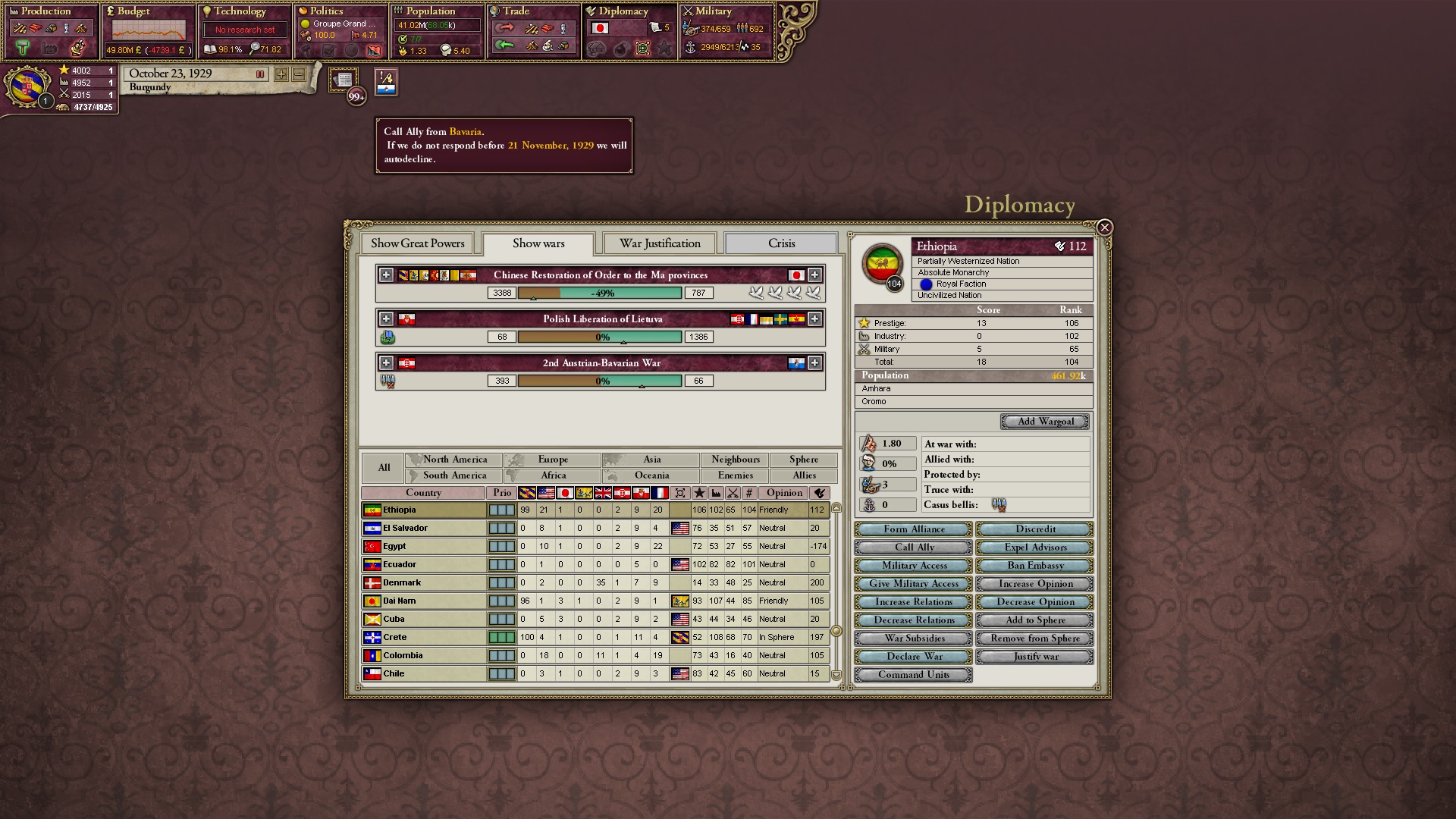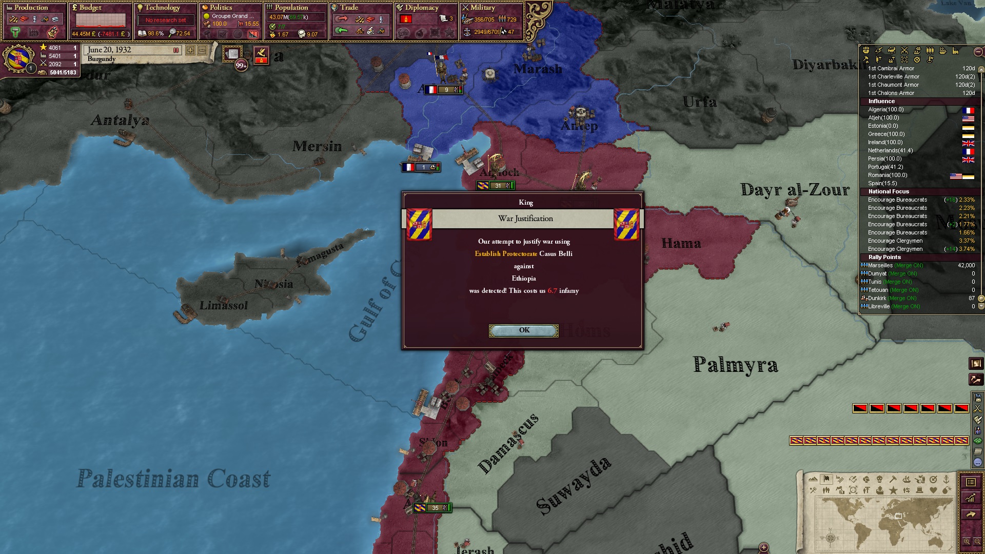 Ich beginne derweil damit, einen Kriegsgrund gegen Äthiopien zu fingieren, da diese immer noch als unzivilisiert zählen, und nehme zwei Drittel der maximal möglichen Infamie hin.