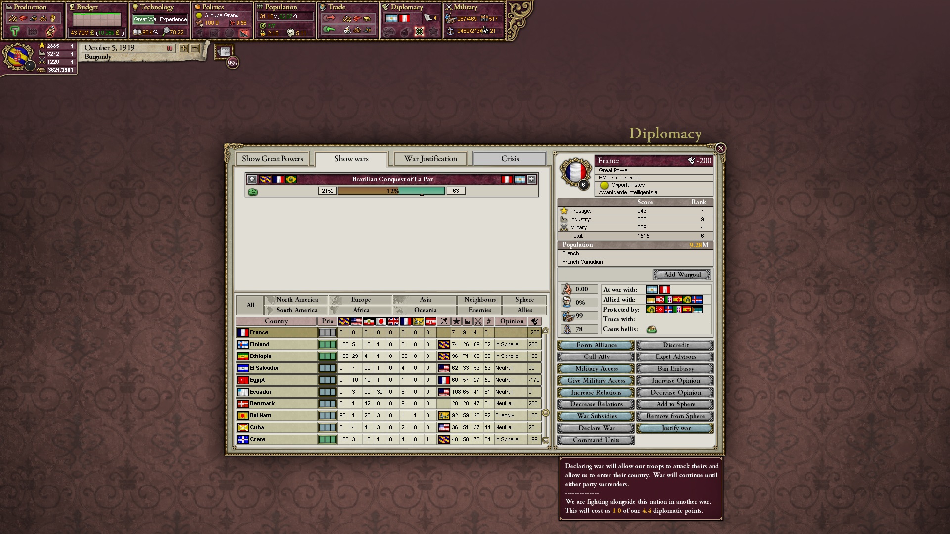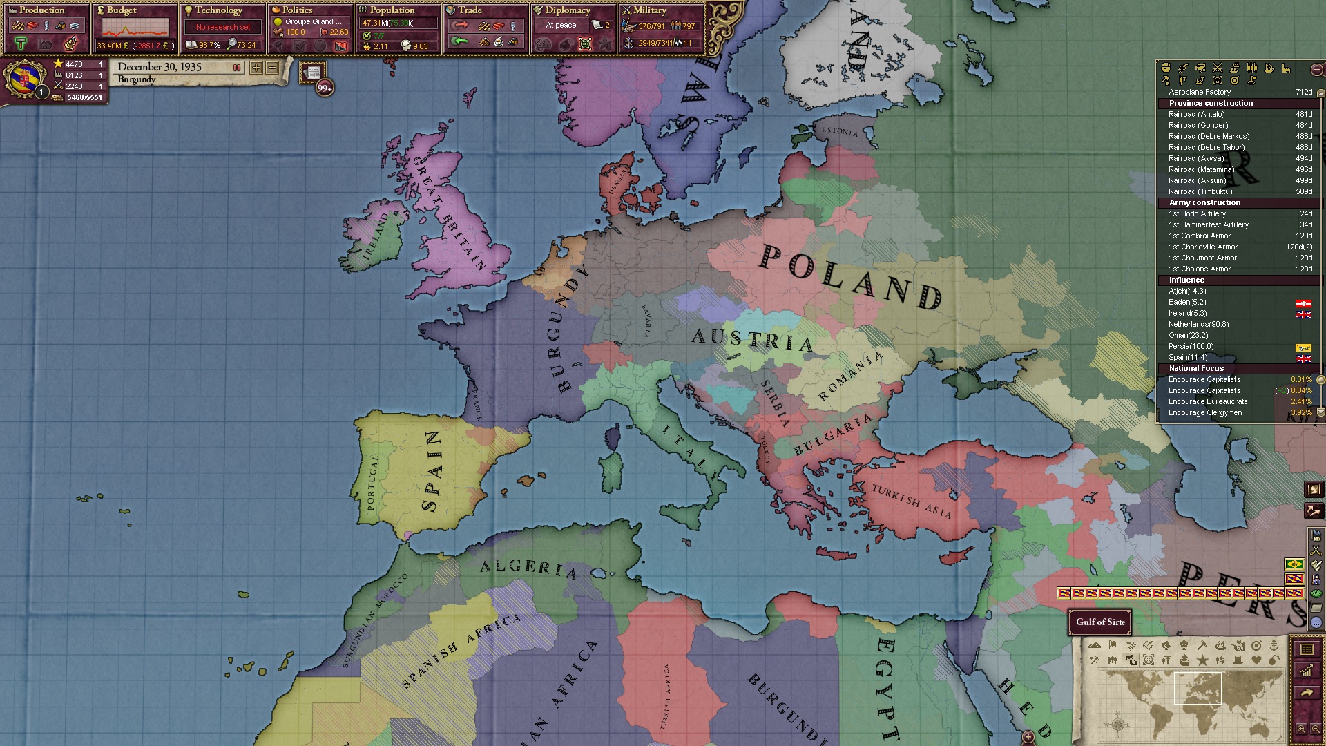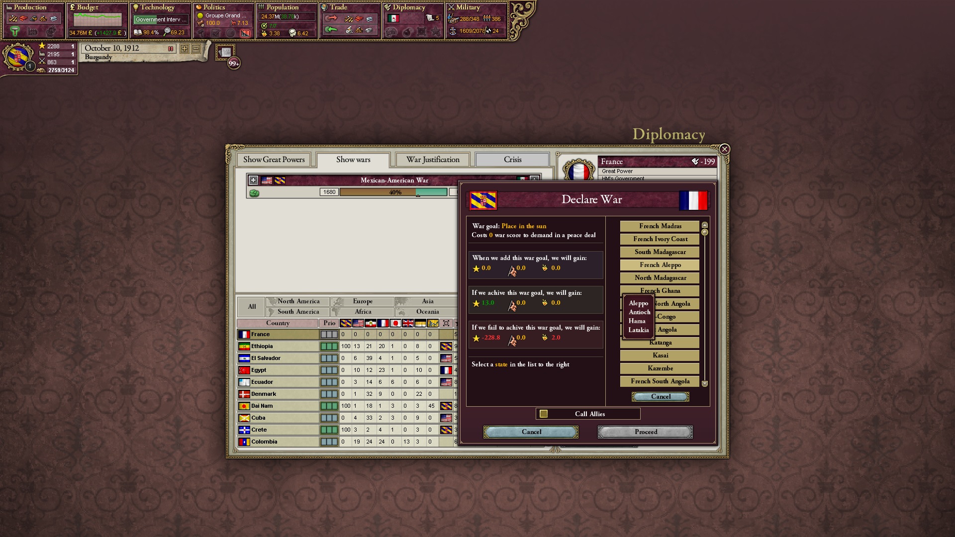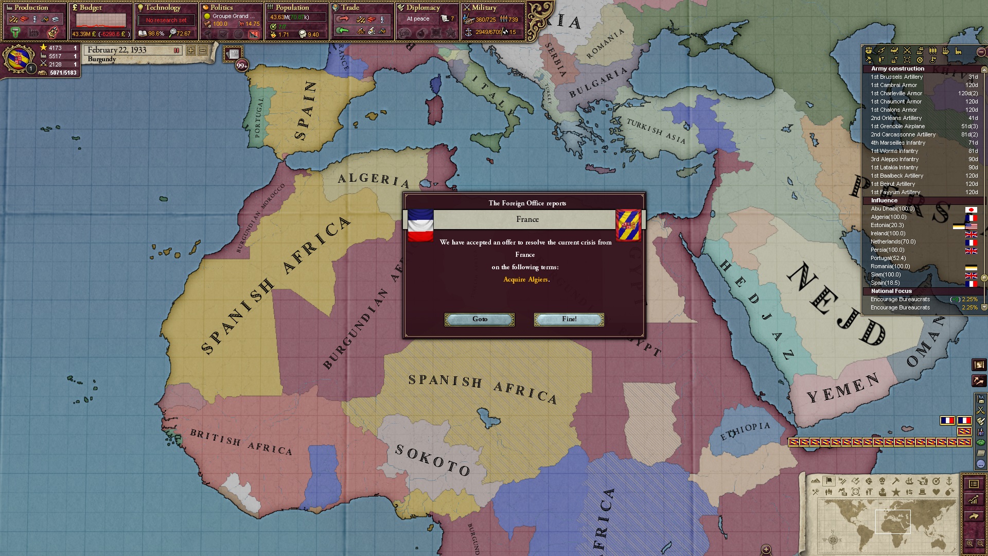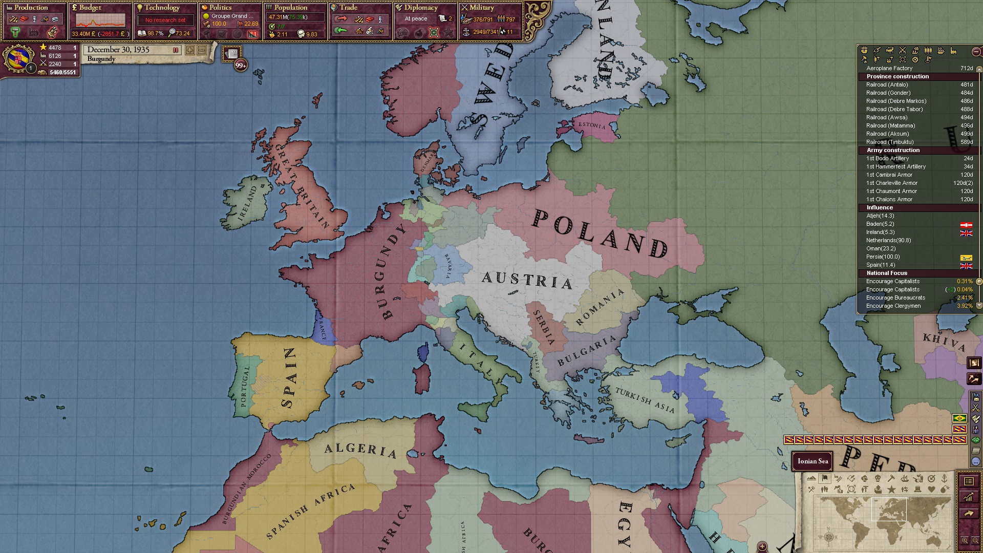 Ich beginne derweil damit, einen Kriegsgrund gegen Äthiopien zu fingieren, da diese immer noch als unzivilisiert zählen, und nehme zwei Drittel der maximal möglichen Infamie hin.
