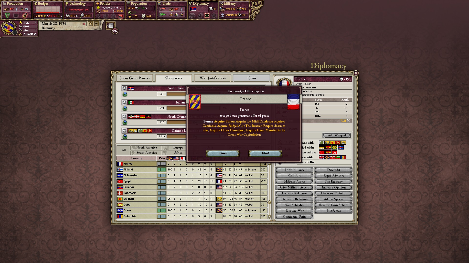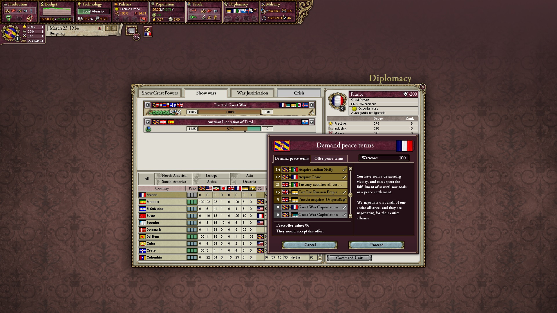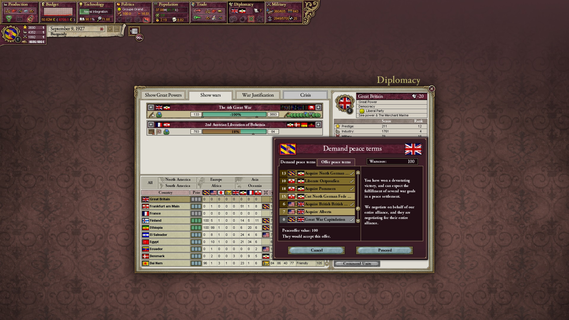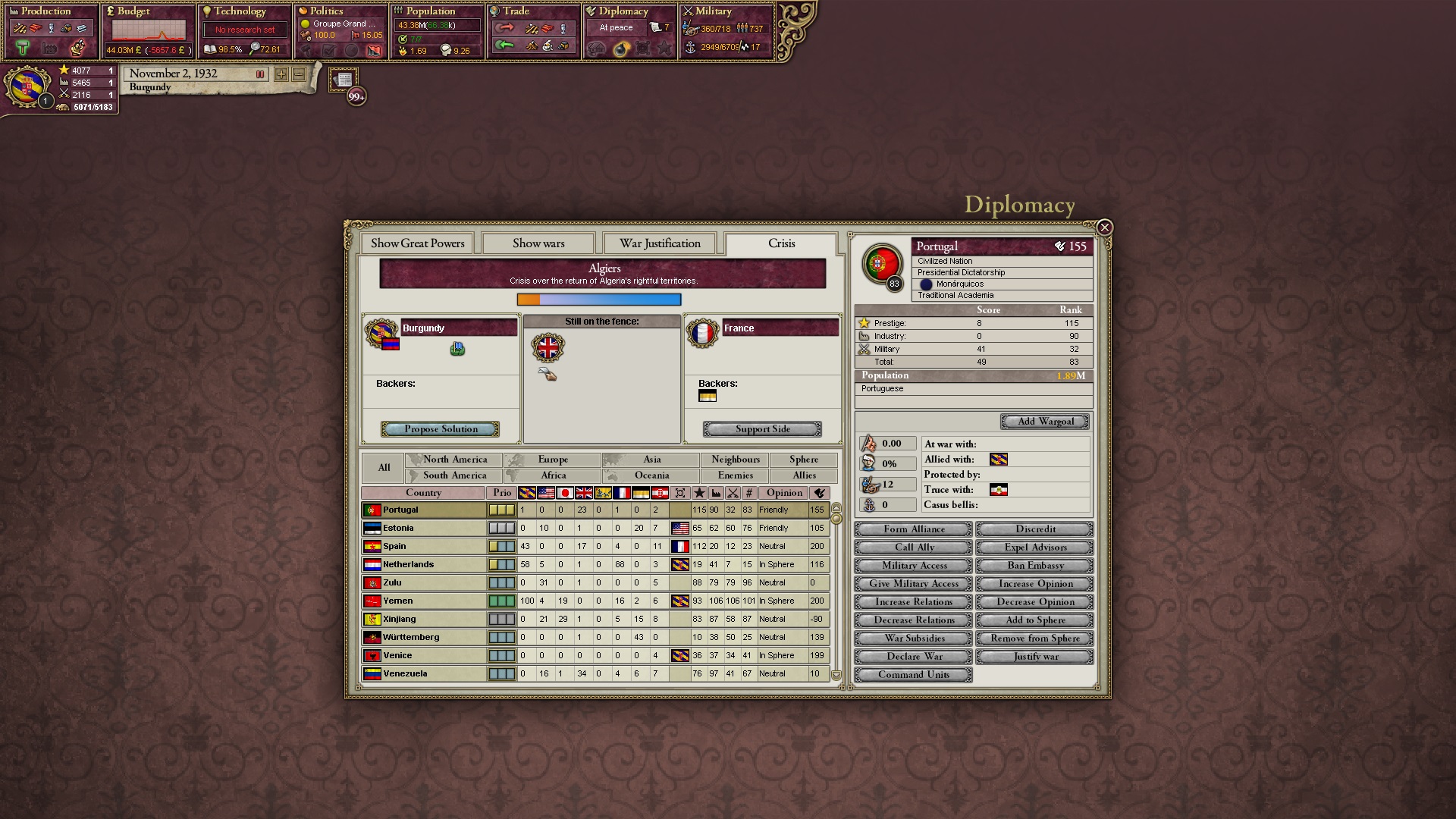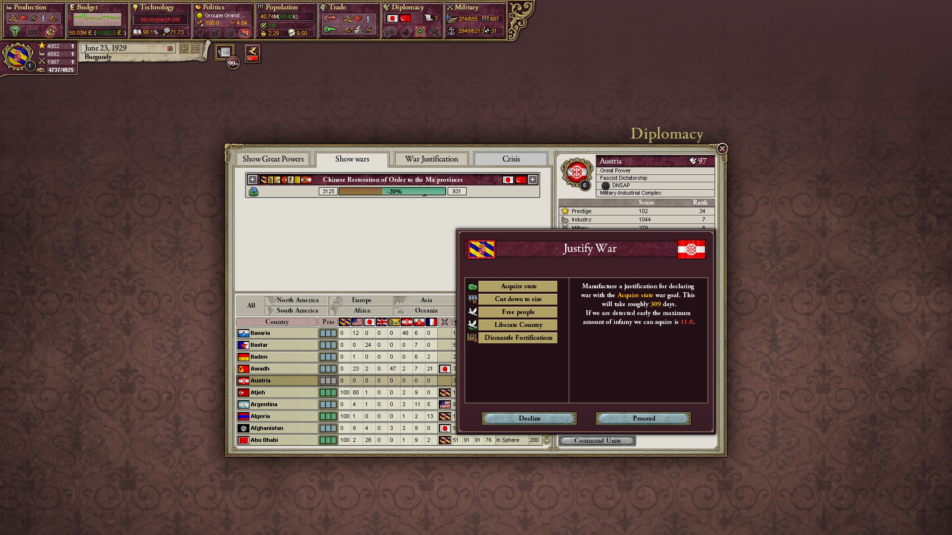 Ich beginne derweil damit, einen Kriegsgrund gegen Äthiopien zu fingieren, da diese immer noch als unzivilisiert zählen, und nehme zwei Drittel der maximal möglichen Infamie hin.