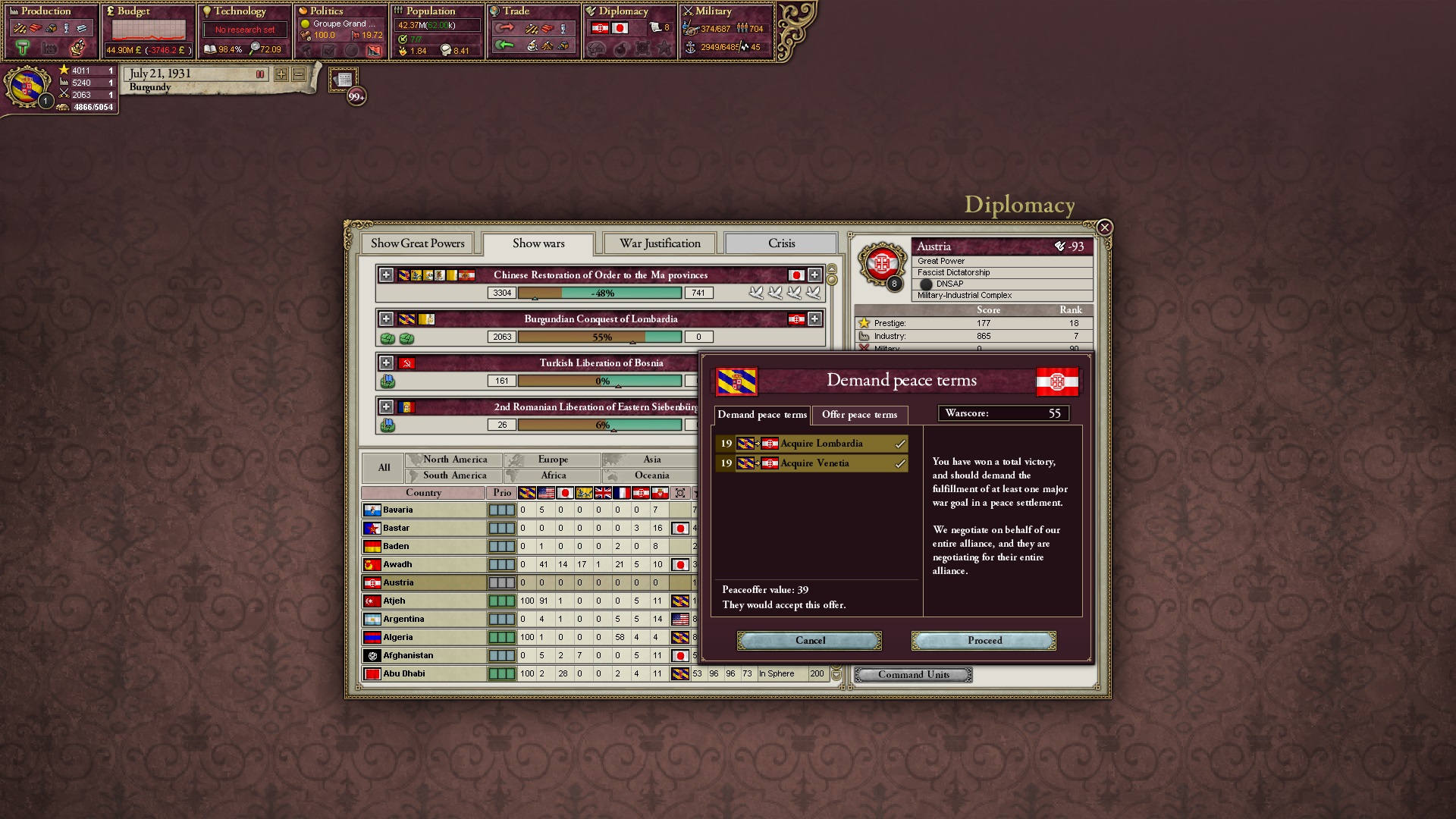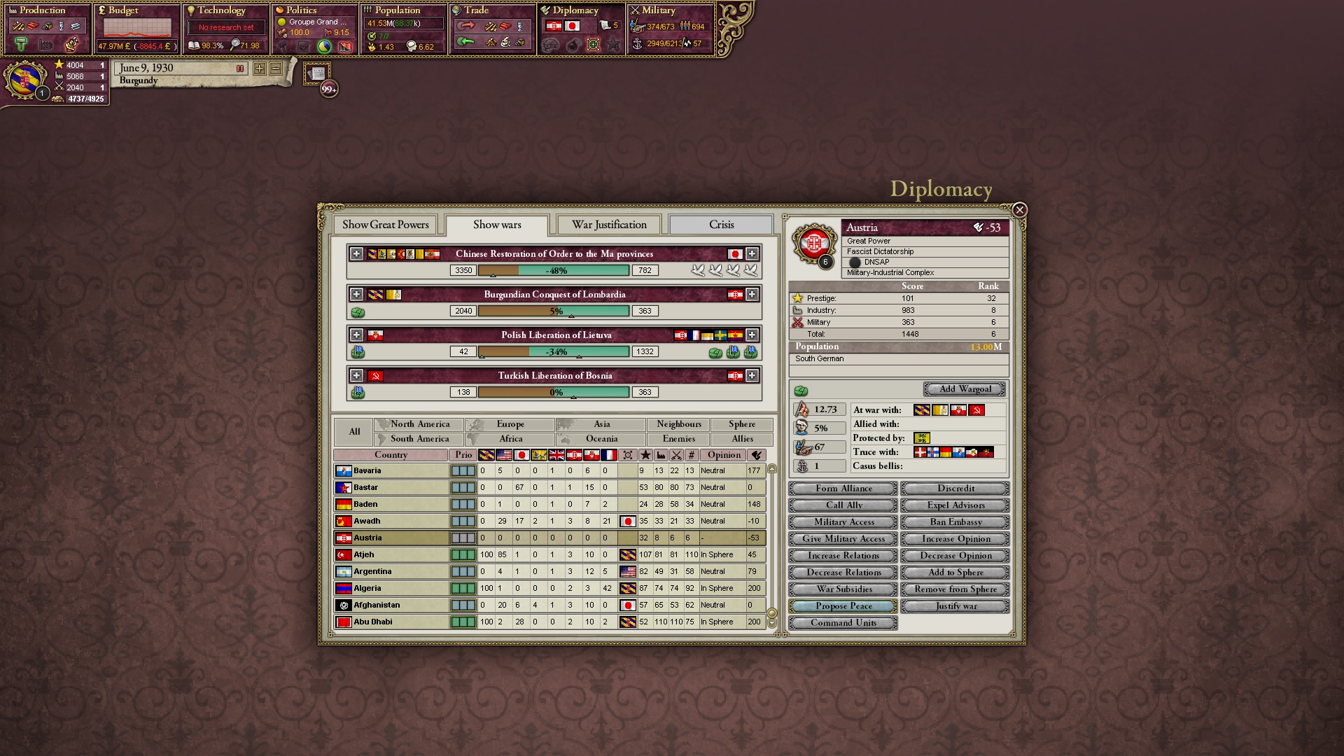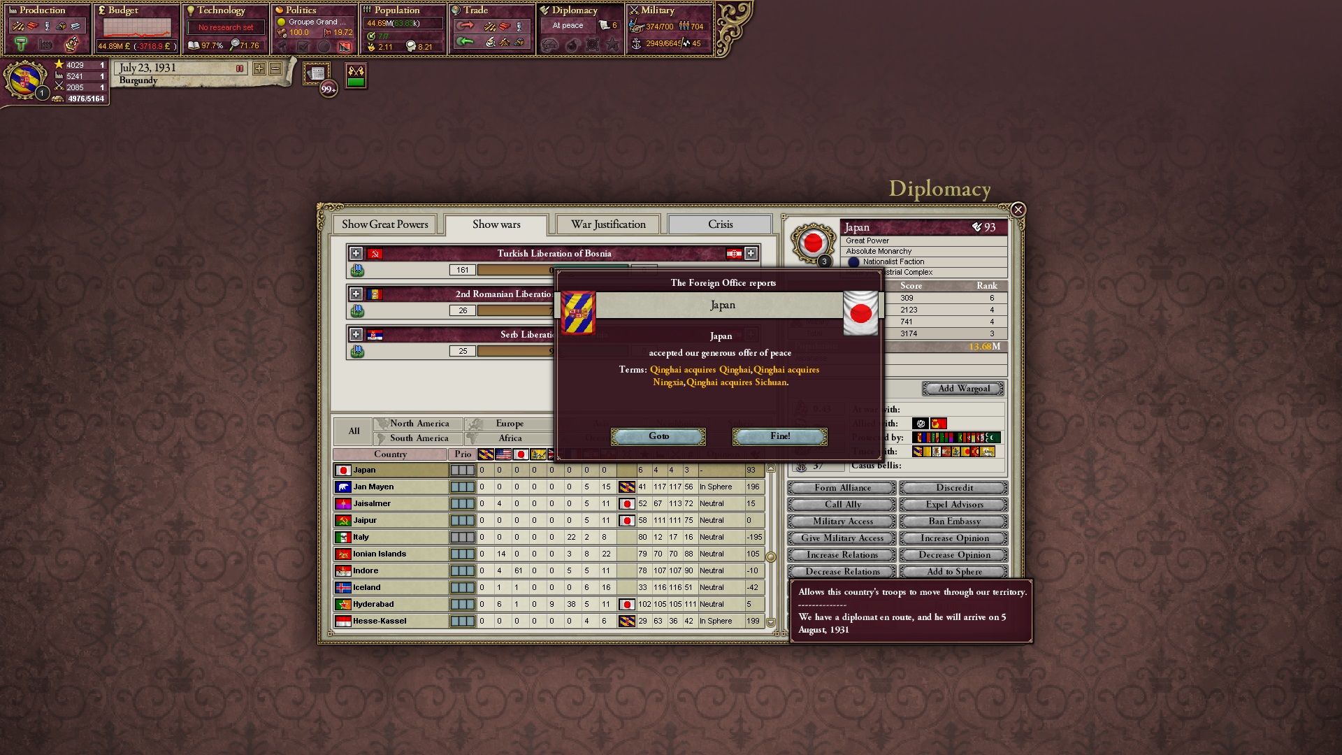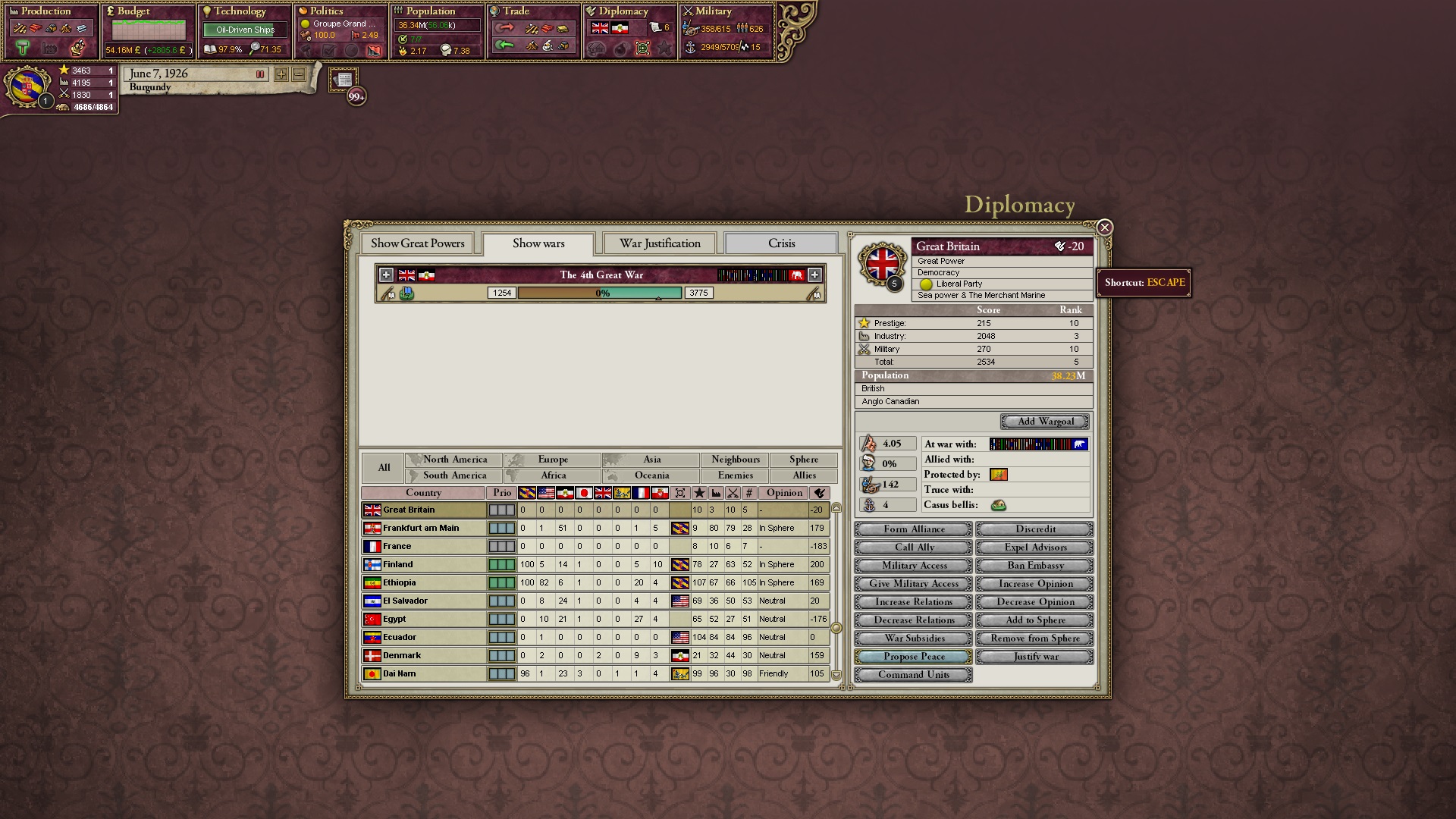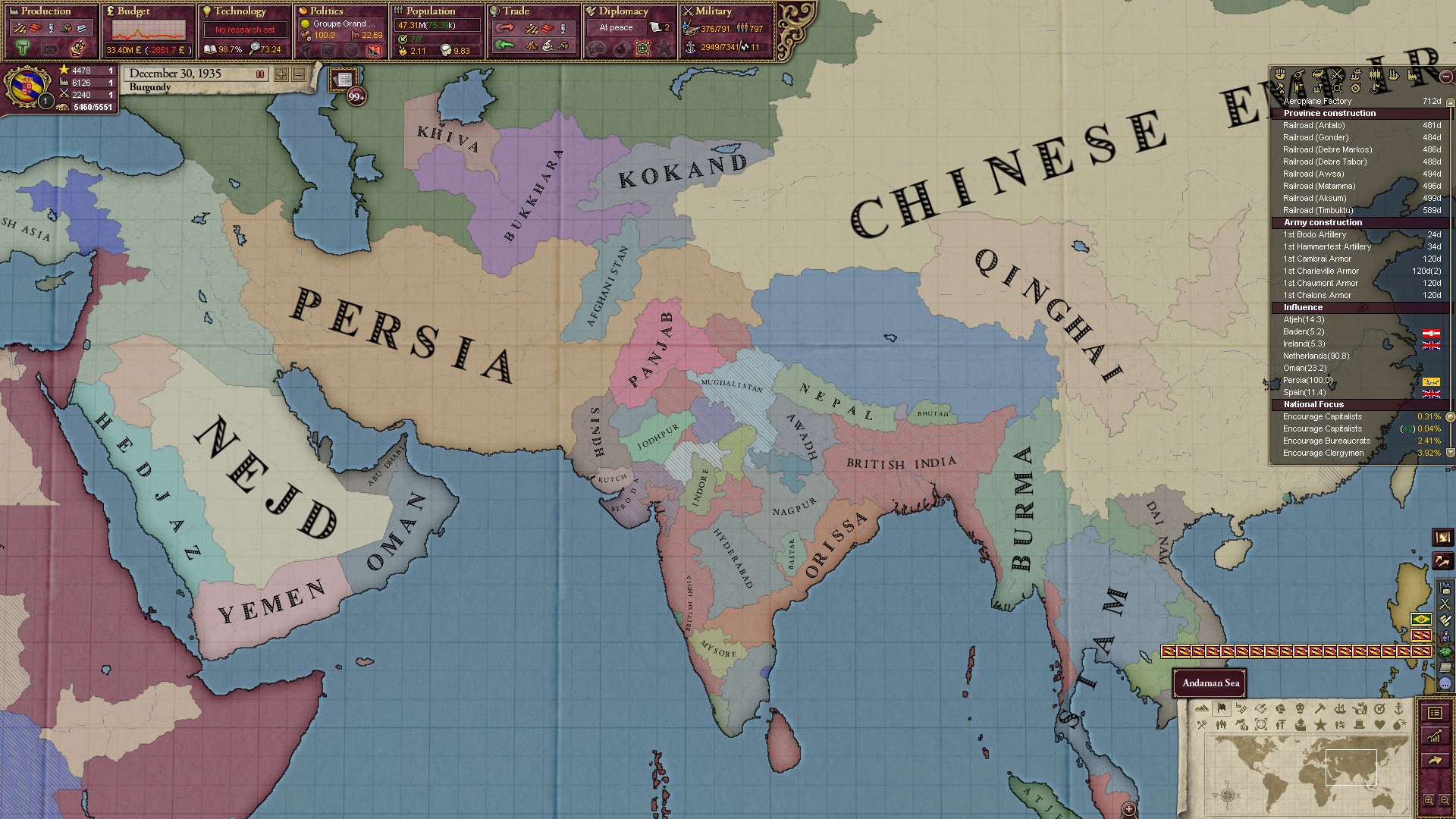 Ich beginne derweil damit, einen Kriegsgrund gegen Äthiopien zu fingieren, da diese immer noch als unzivilisiert zählen, und nehme zwei Drittel der maximal möglichen Infamie hin.