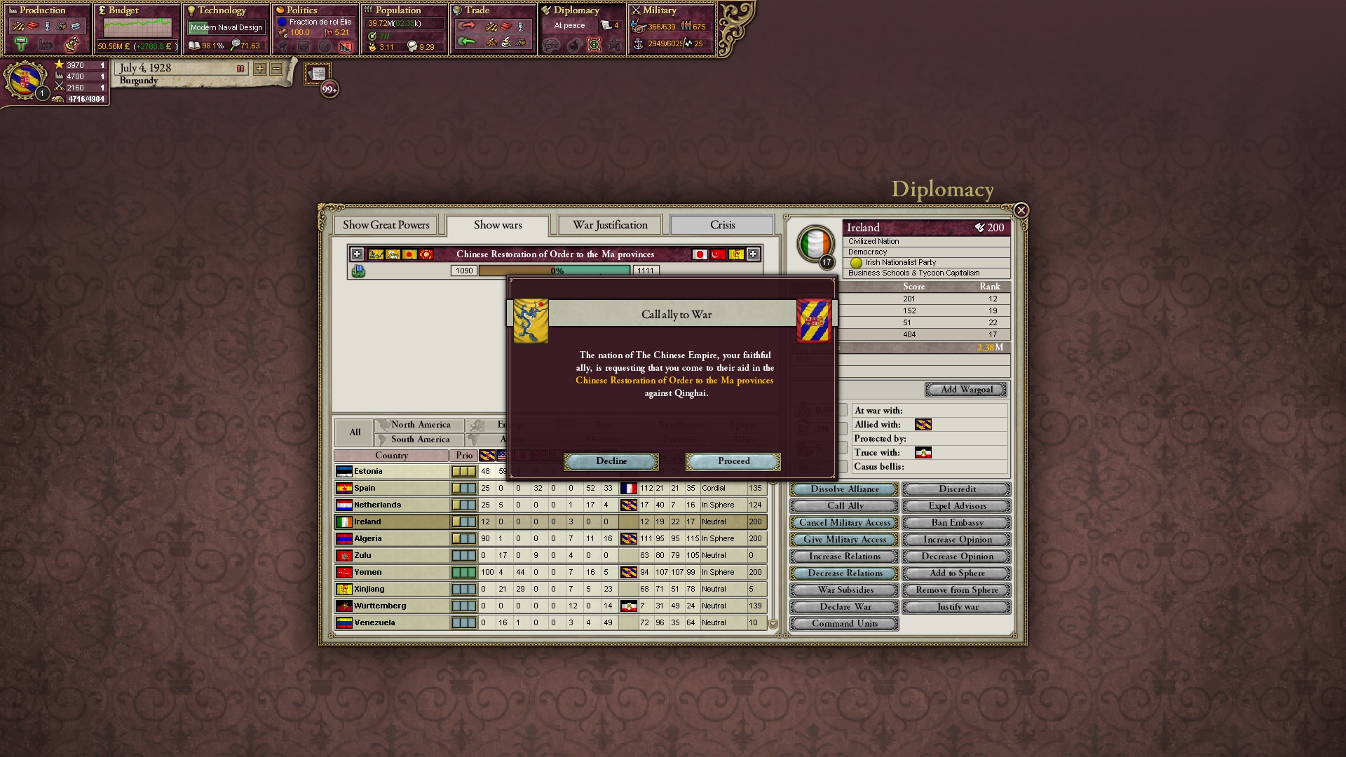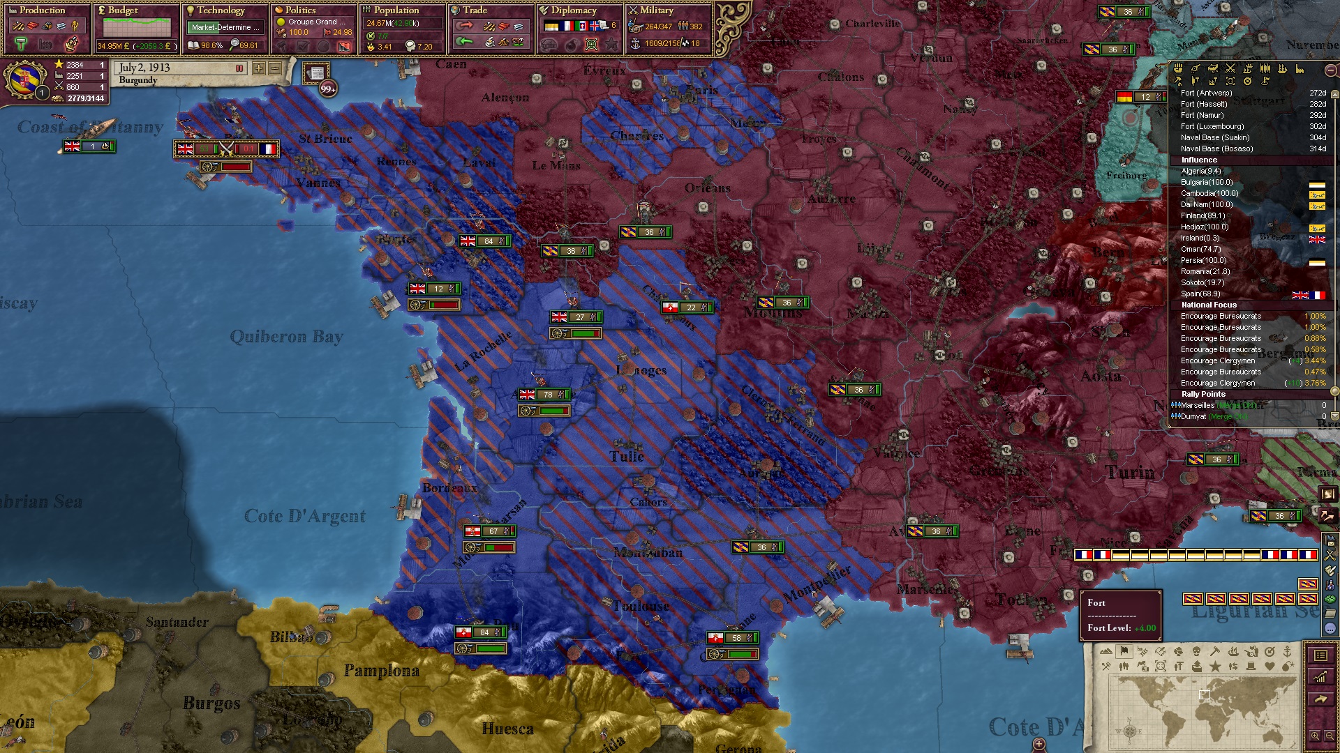 Großbritannien auf meiner Seite, Frankreich und Russland auf der anderen... ja, geht auf. Das erlaubt mir billige Kriegsziele - und Italien ist auch mit dabei.