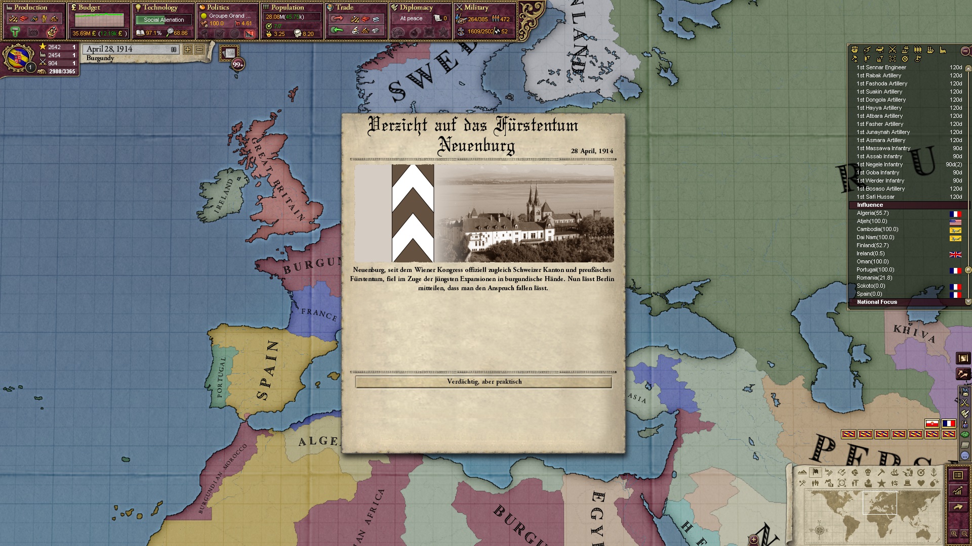 (Das Event kann einmal per Staat auftreten, der eine Kernprovinz auf Neuenburg besitzt. Unter dem Norddeutschen Bund blieb alles beim alten, Königsberg-Preußen verzichtet nun, wobei es absichtlich unklar bleibt, ob dies für Einfluss oder für Infamiesenkung geschah.)