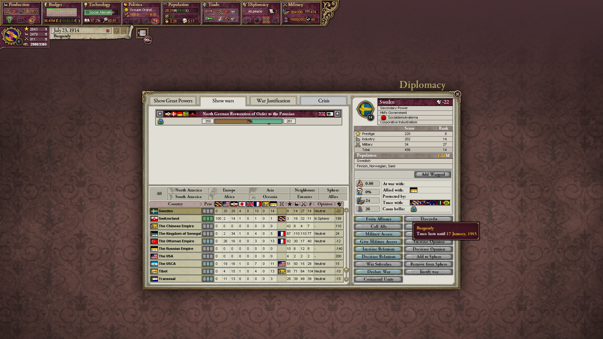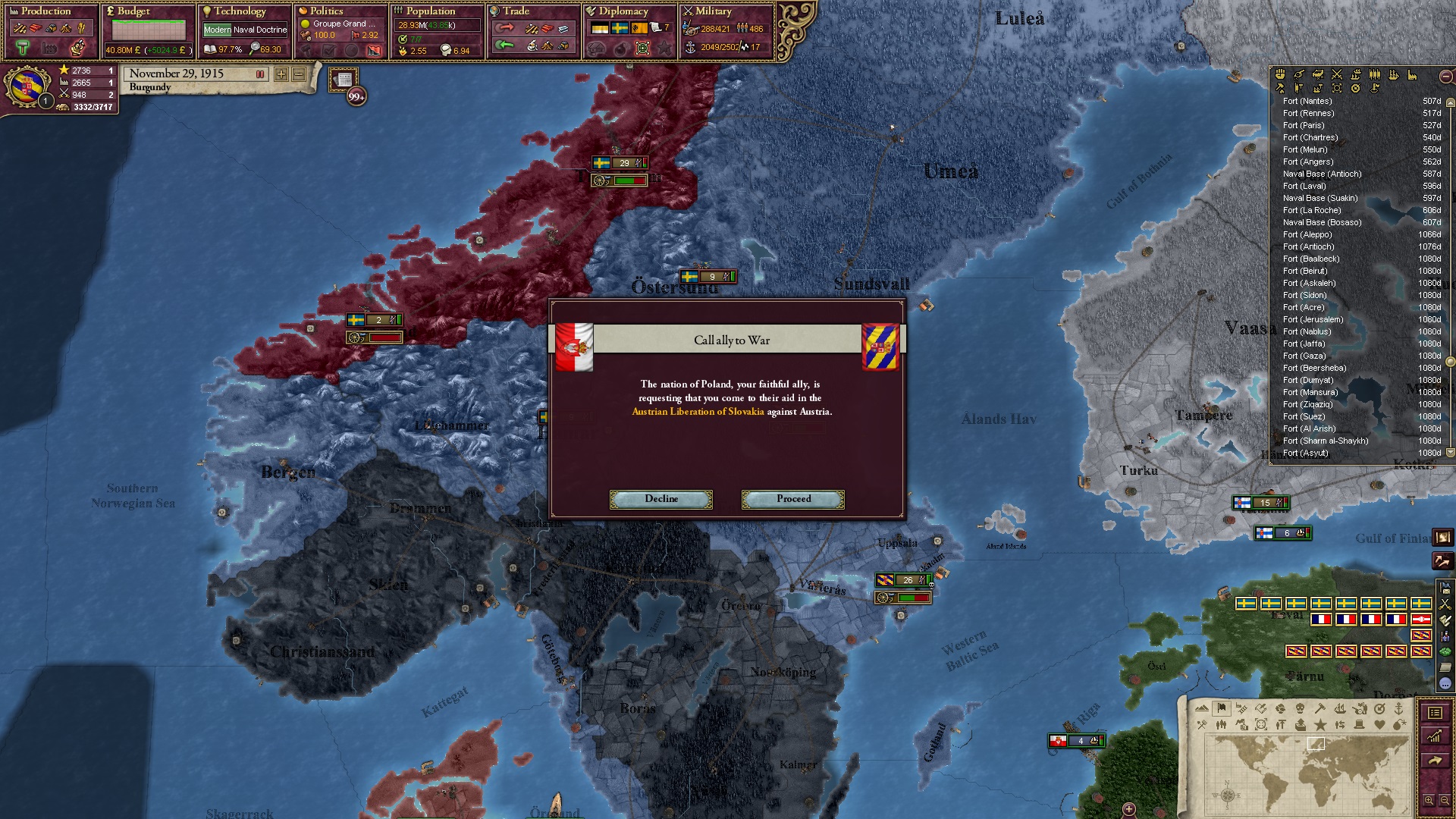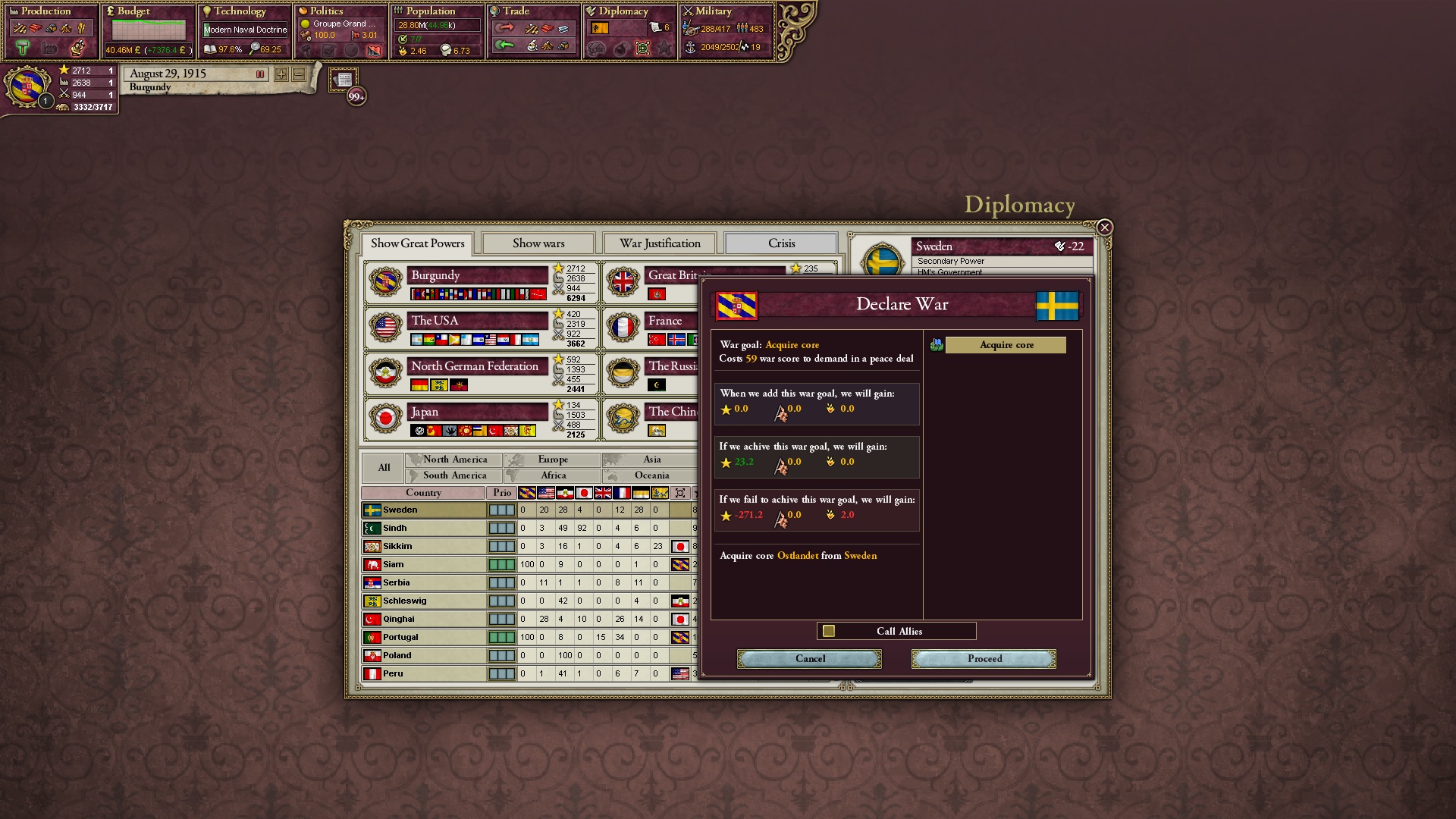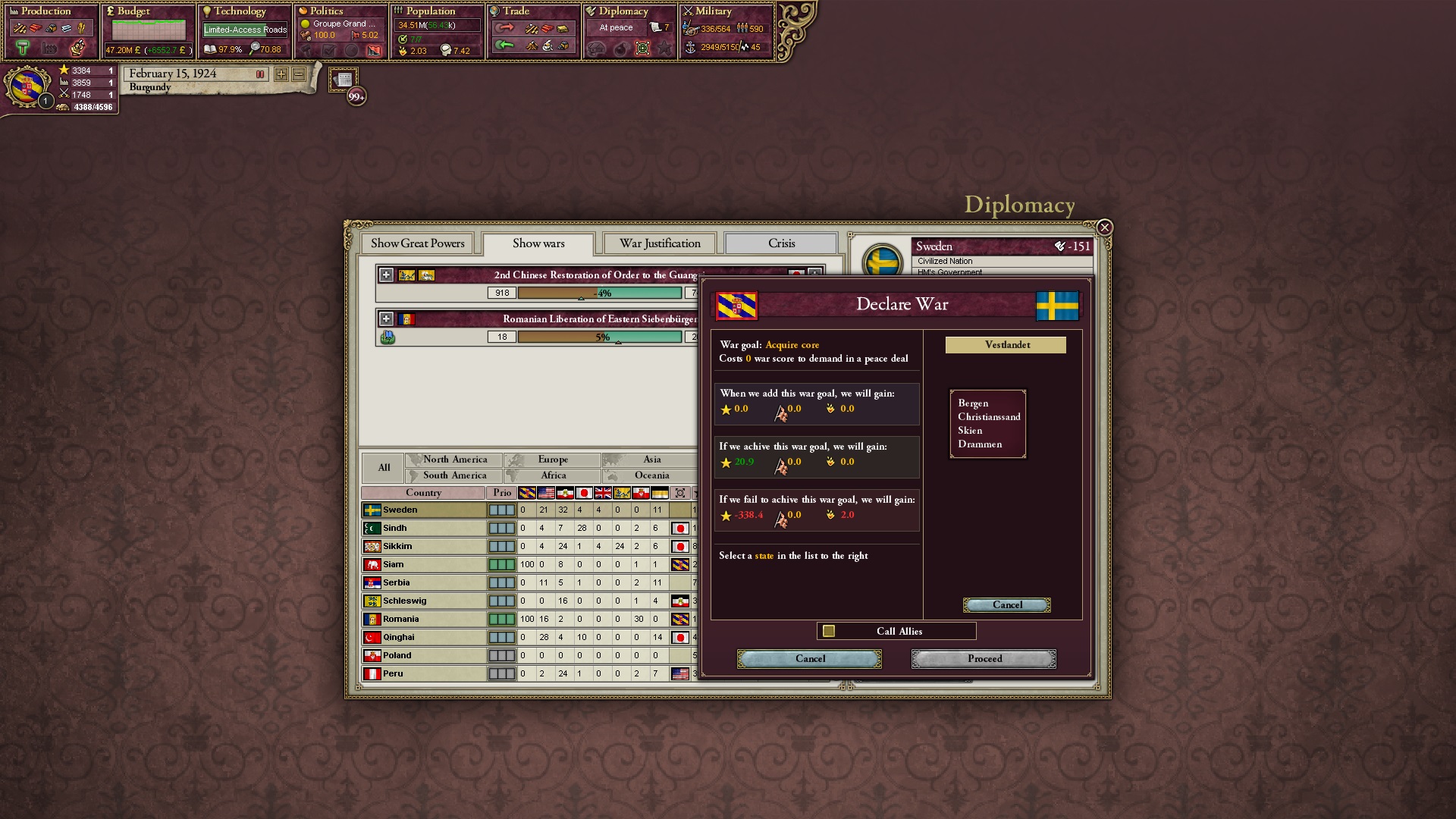 Ich erkläre direkt den Krieg gegen Schweden und hetze ihnen meine Verbündeten entgegen.