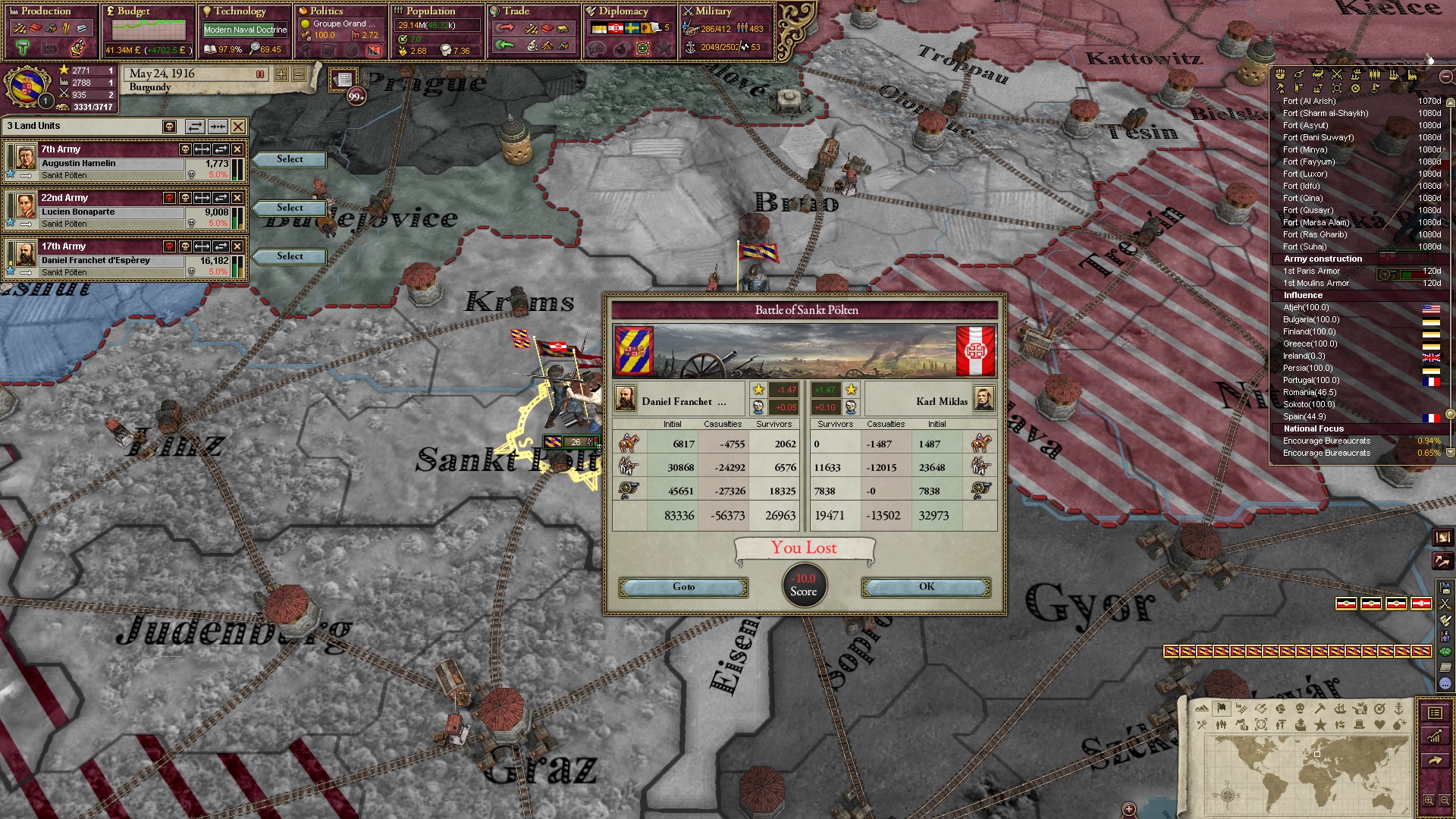 Ich verschiebe vier Armeen an die Ostgrenze, ehe mich eine blutige Niederlage zum einstweiligen Rückzug zwingt.