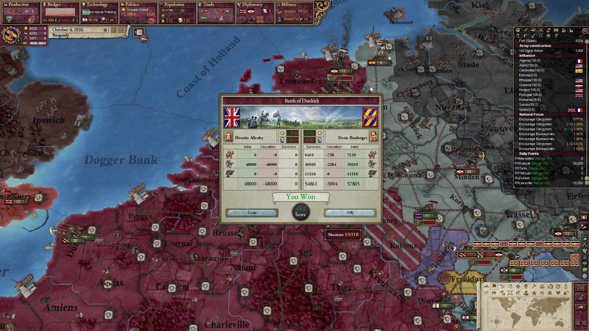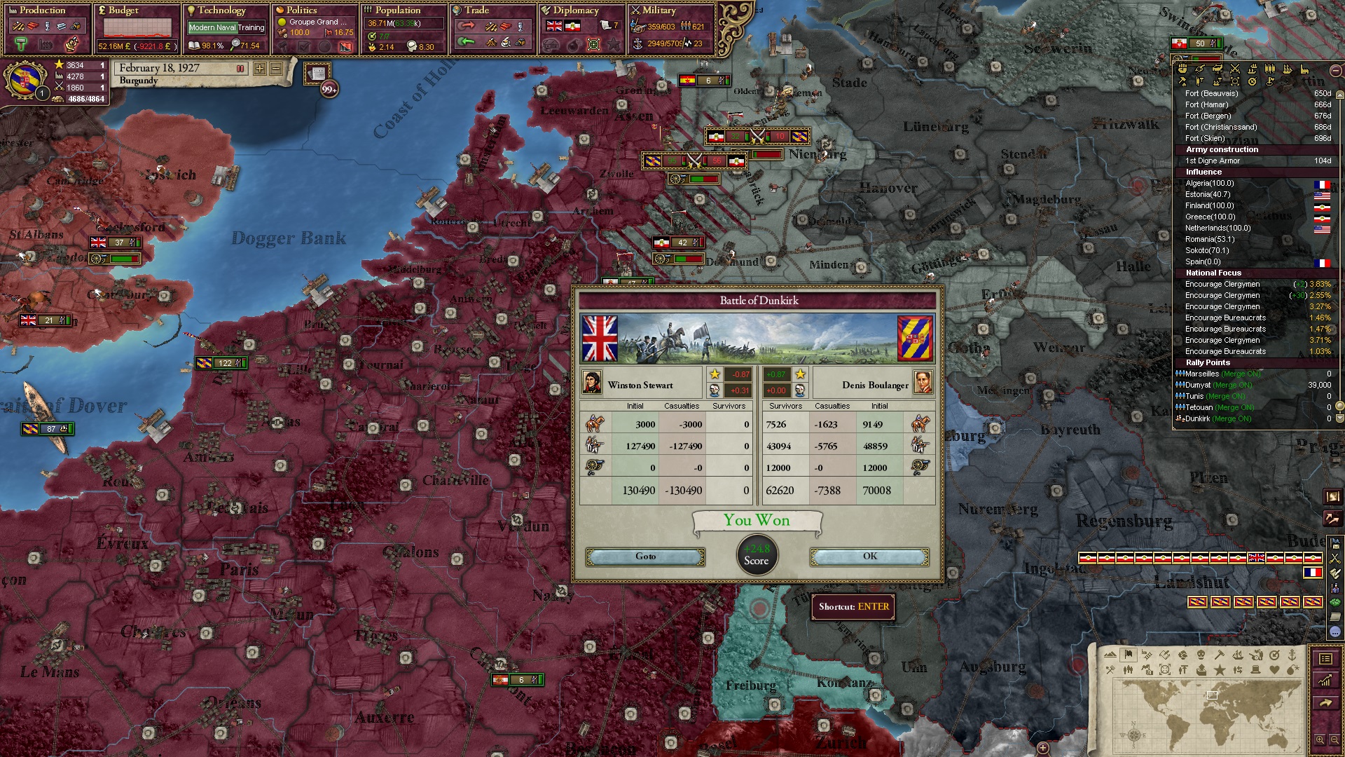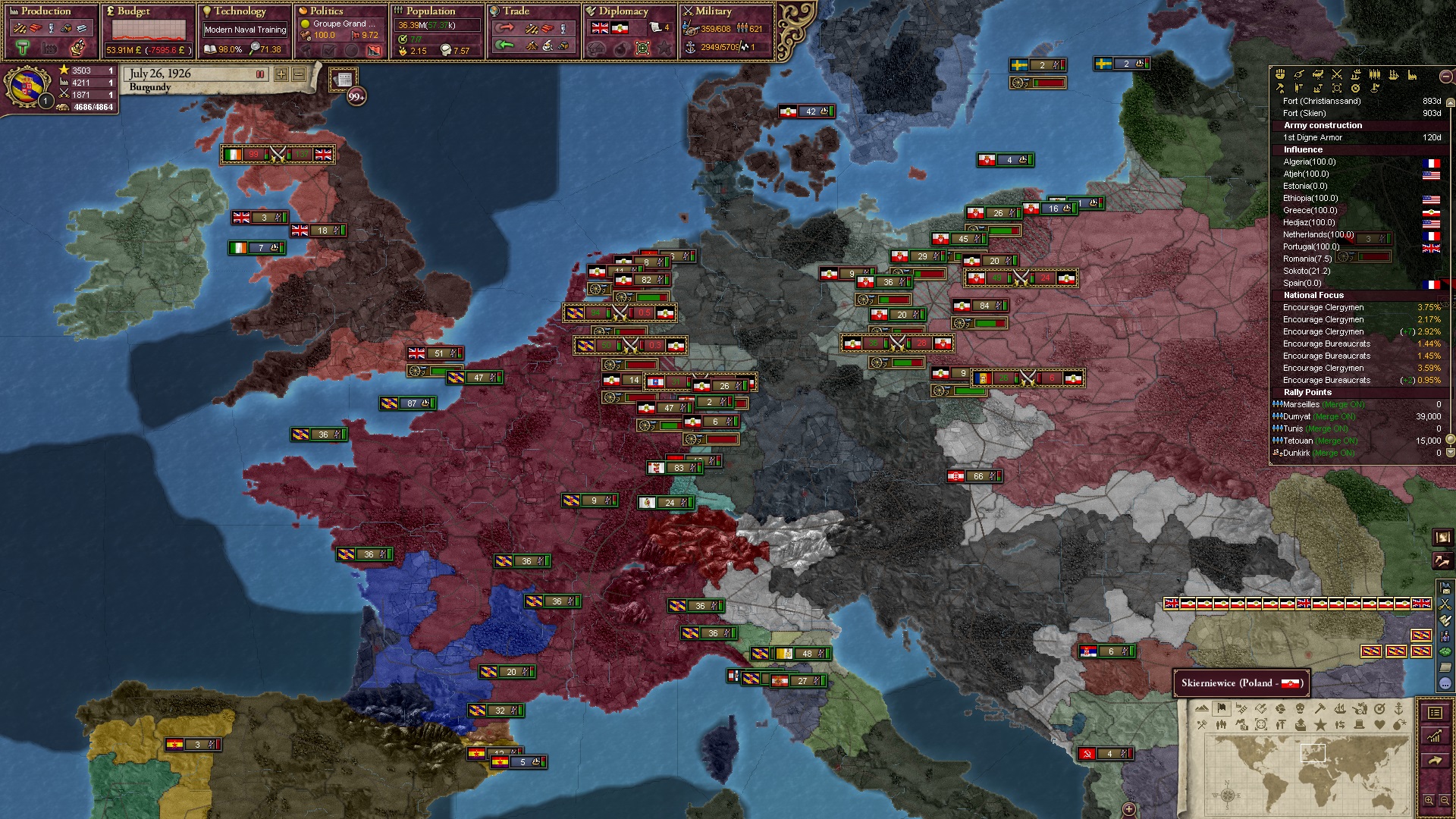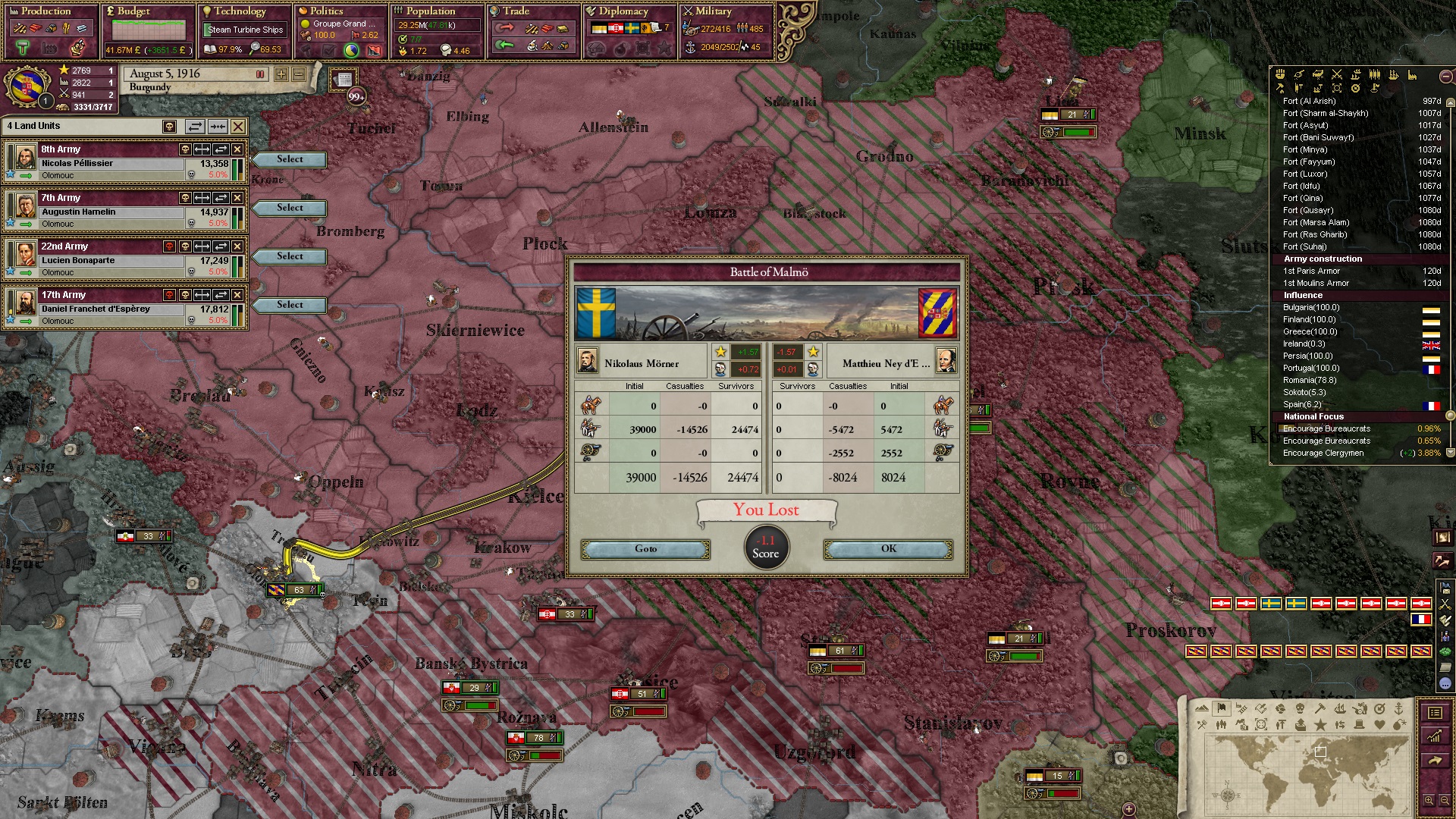 Ich muss gestehen, dass mir die rechten Abschlussworte fehlen, die das Spiel angehen - oder zumindest solche, die über ein "Japp, so war der Mod gedacht" herausgehen. Ich war gut genug, um seinen Content vollends abzugrasen, aber ich hätte mehr erreichten können, wenn ich mich in manchen Lagen geschickter angestellt hätte. Darüber hinaus war es bemerkenswert, ein Spiel zu erleben, in dem sowohl Deutschland als auch Frankreich völlig einbrechen. Hierfür kam mir aber das starke Polen entgegen, das ich als glückliche Fügung mitnahm, ohne selbst darauf zu spielen.