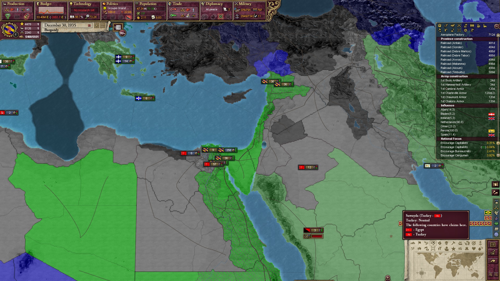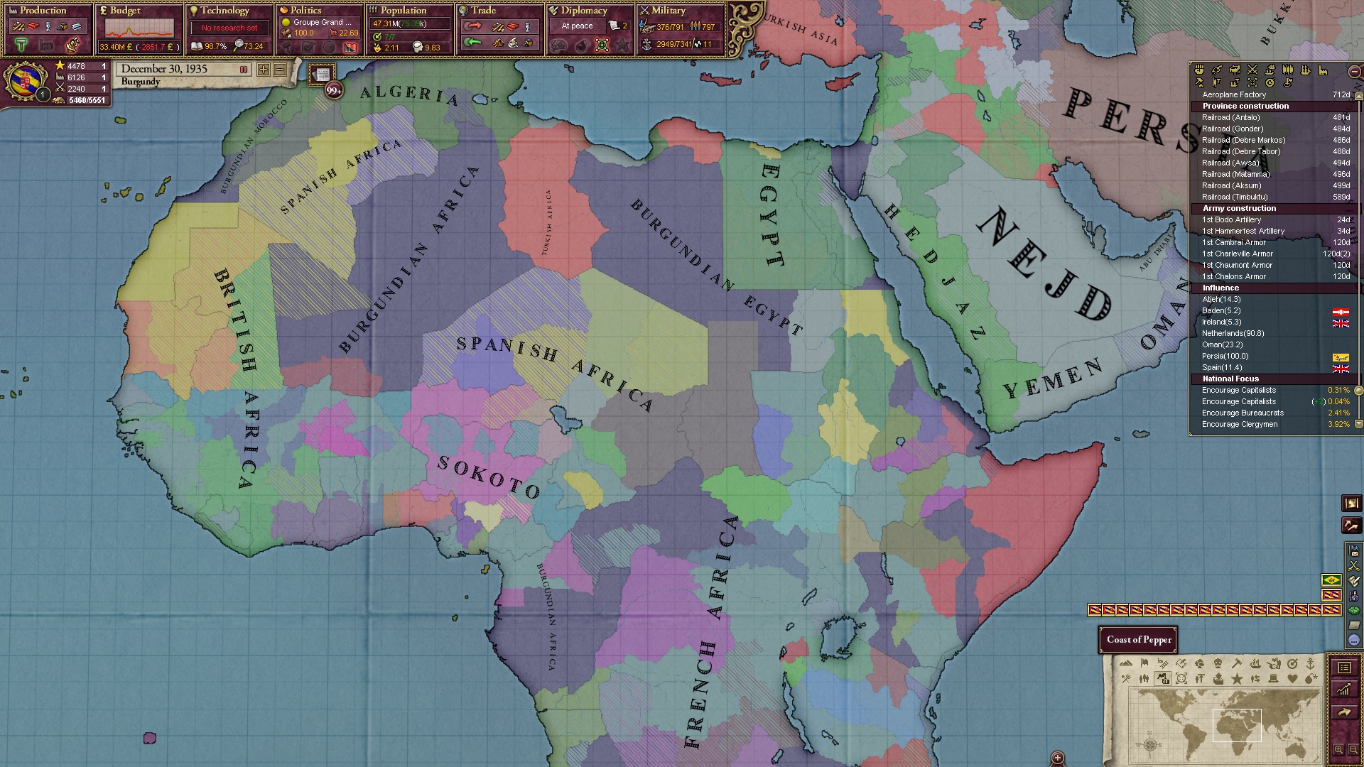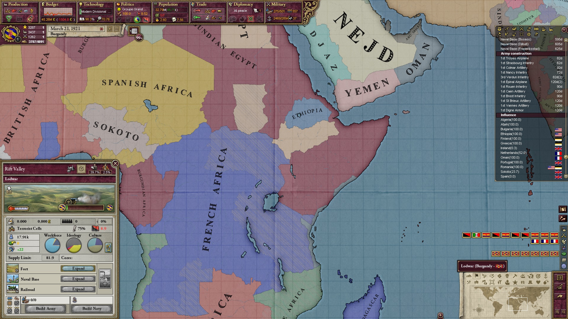 Am Ende besaß ich noch drei Kolonien, die ich verzweifelt versuchte, irgendwie doch noch umzuwandeln. Im Sudan hätte ich es fast noch geschafft, das eroberte Äthiopien befand sich noch ganz am Anfang.