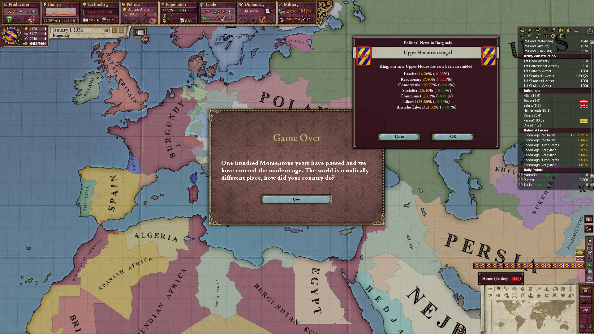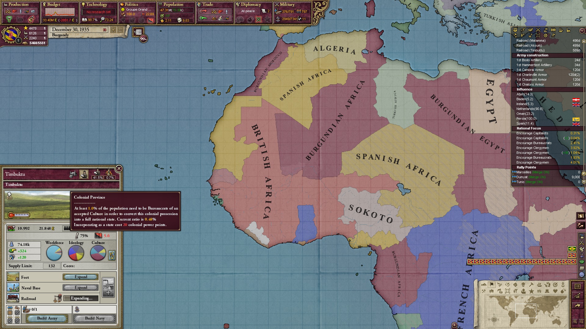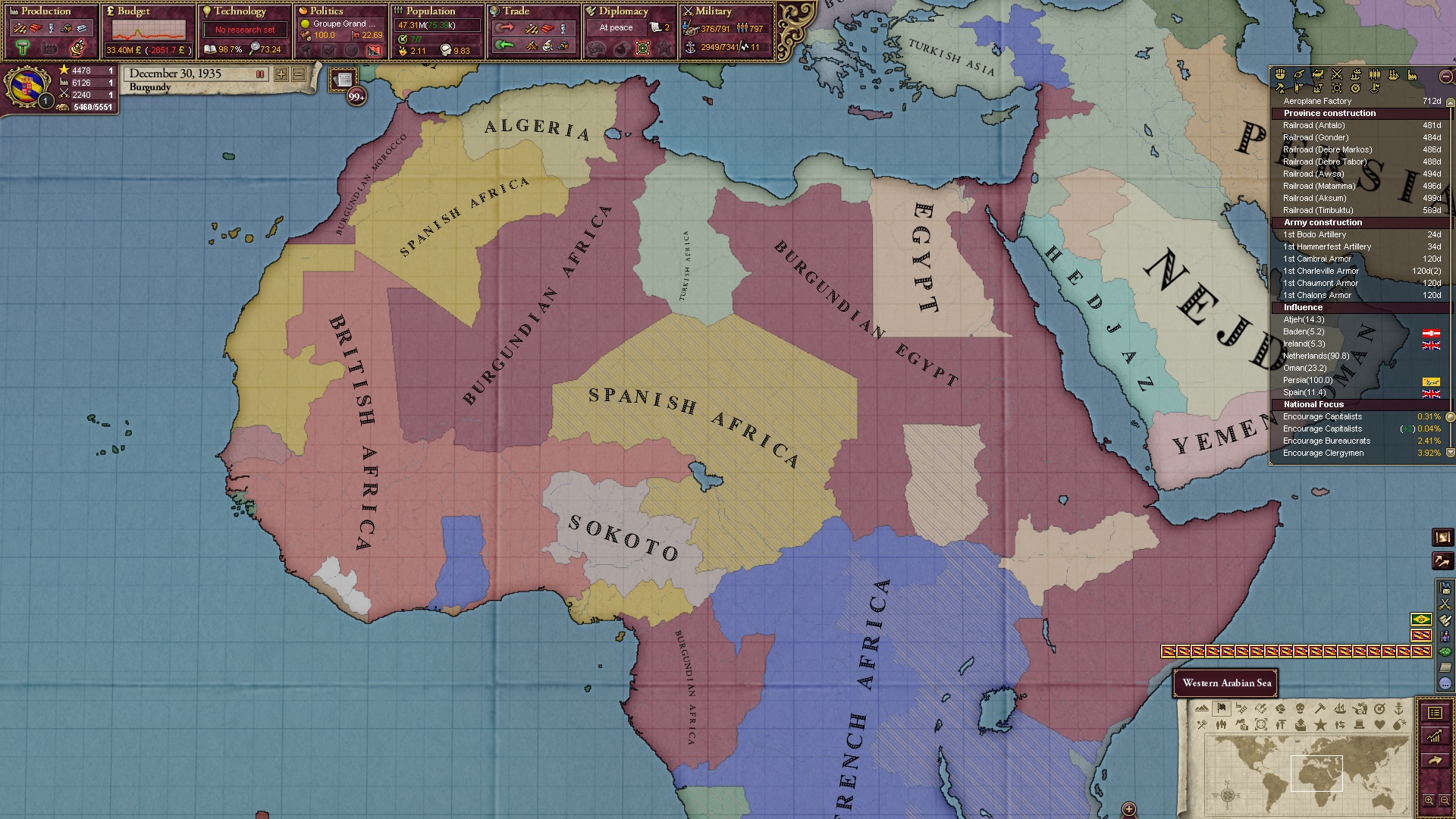 Am Ende besaß ich noch drei Kolonien, die ich verzweifelt versuchte, irgendwie doch noch umzuwandeln. Im Sudan hätte ich es fast noch geschafft, das eroberte Äthiopien befand sich noch ganz am Anfang.