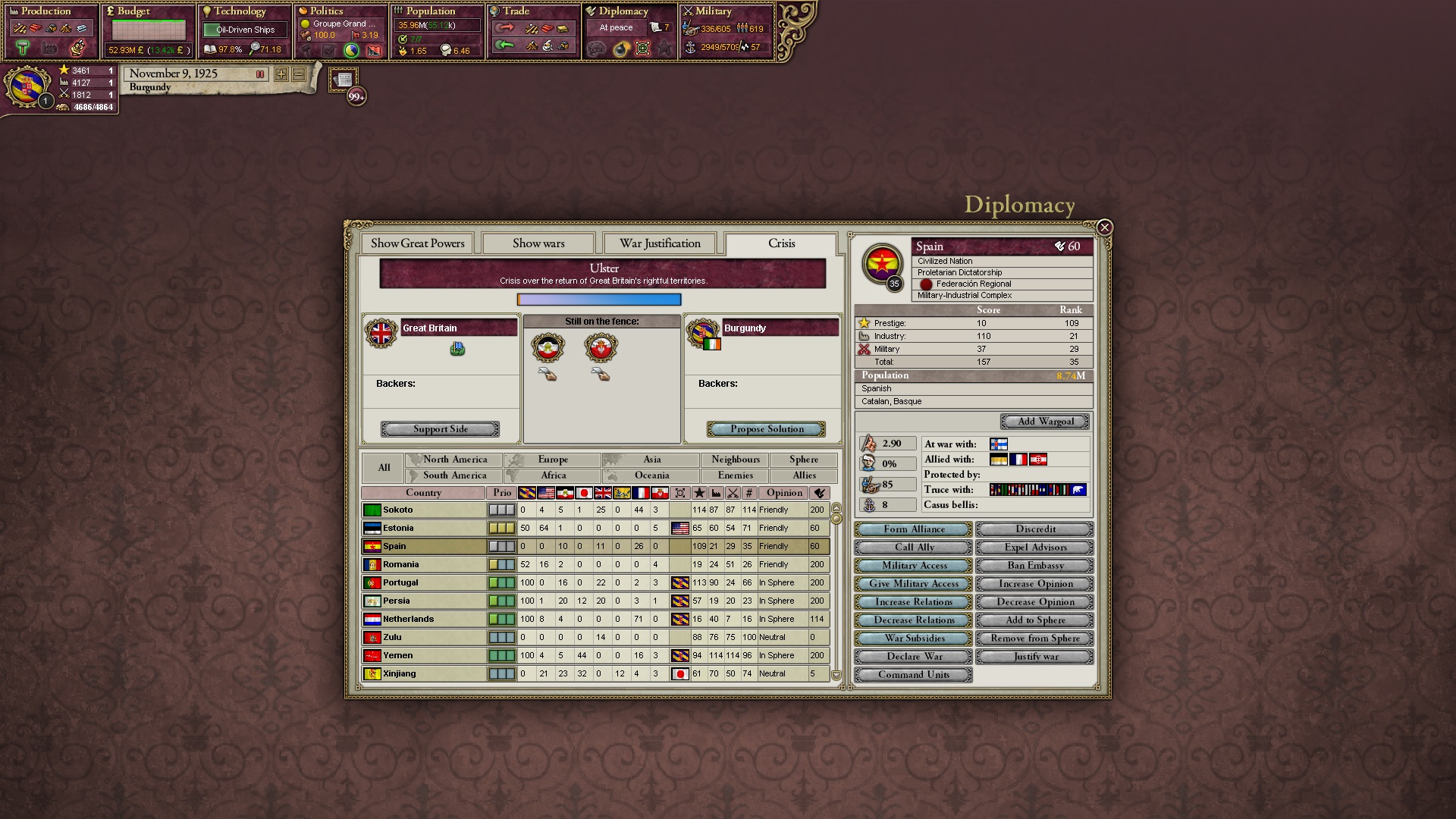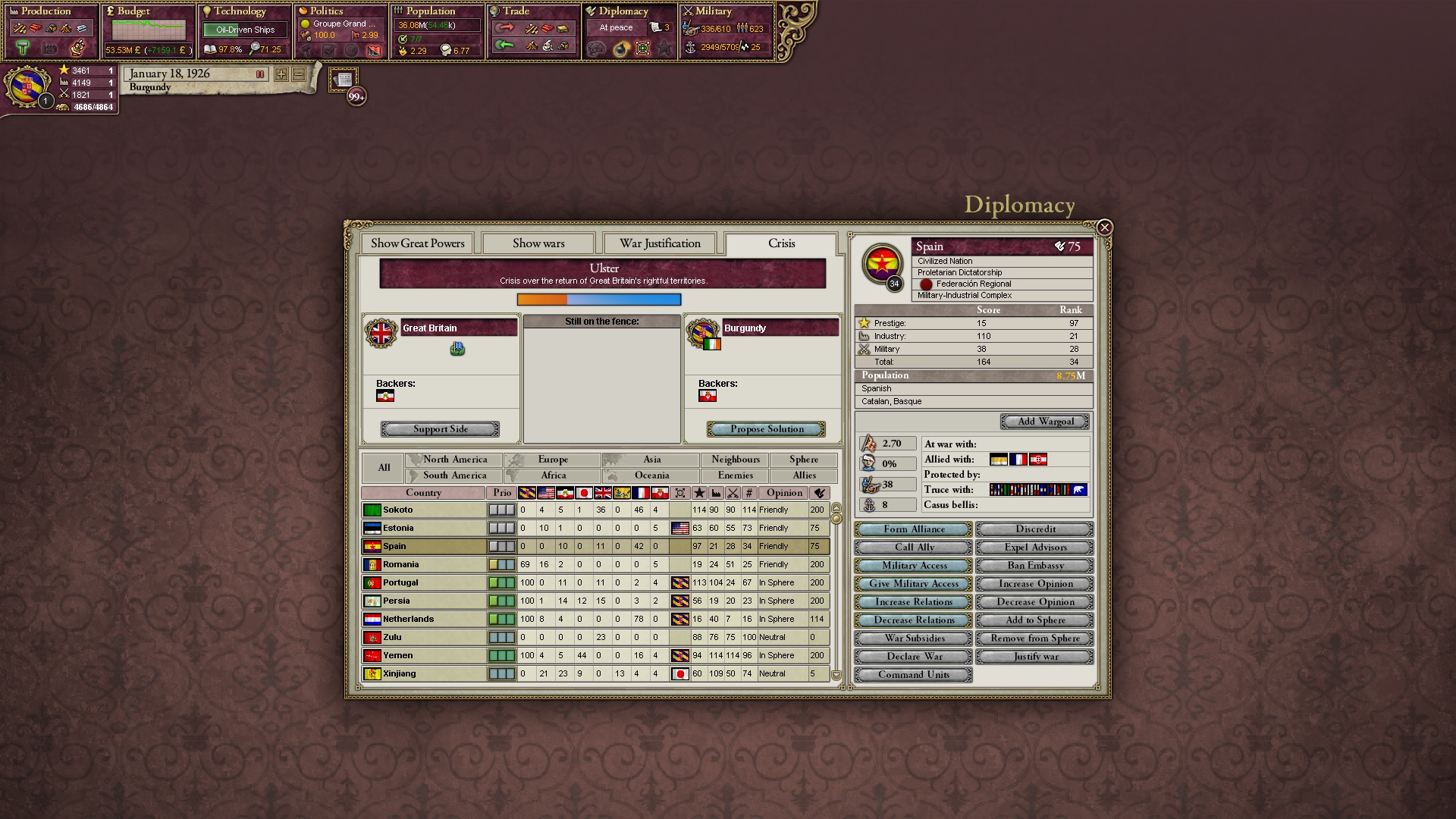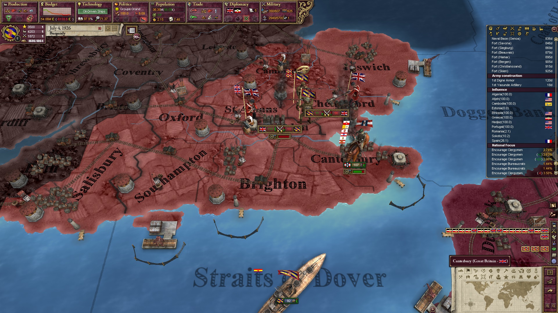 Großbritannien erhält zwei innerafrikanische Gebiete von Spanien, ich expandierte Katalonien und beschränkte Frankreich auf Bordeaux.