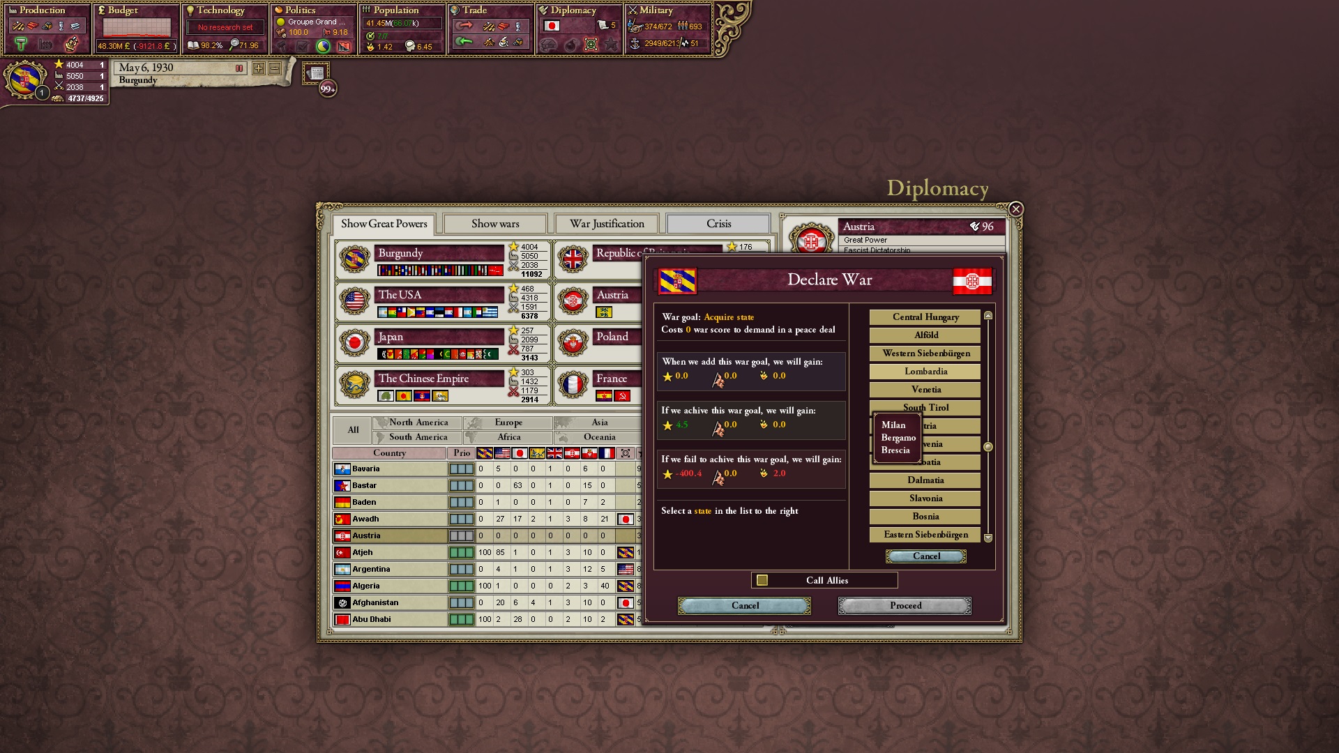 Ich sorge für eine Menge Kriegsziele. Derweil beginnt Österreich einen Feldzug gegen Triest, in den es mich auch hereinruft.
