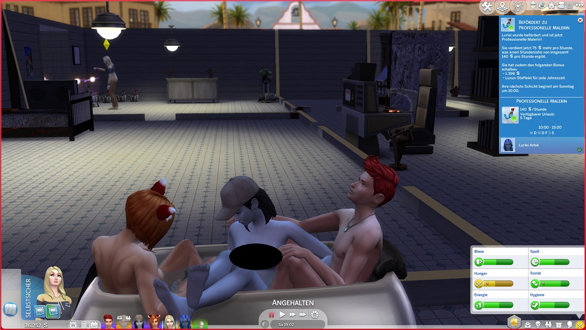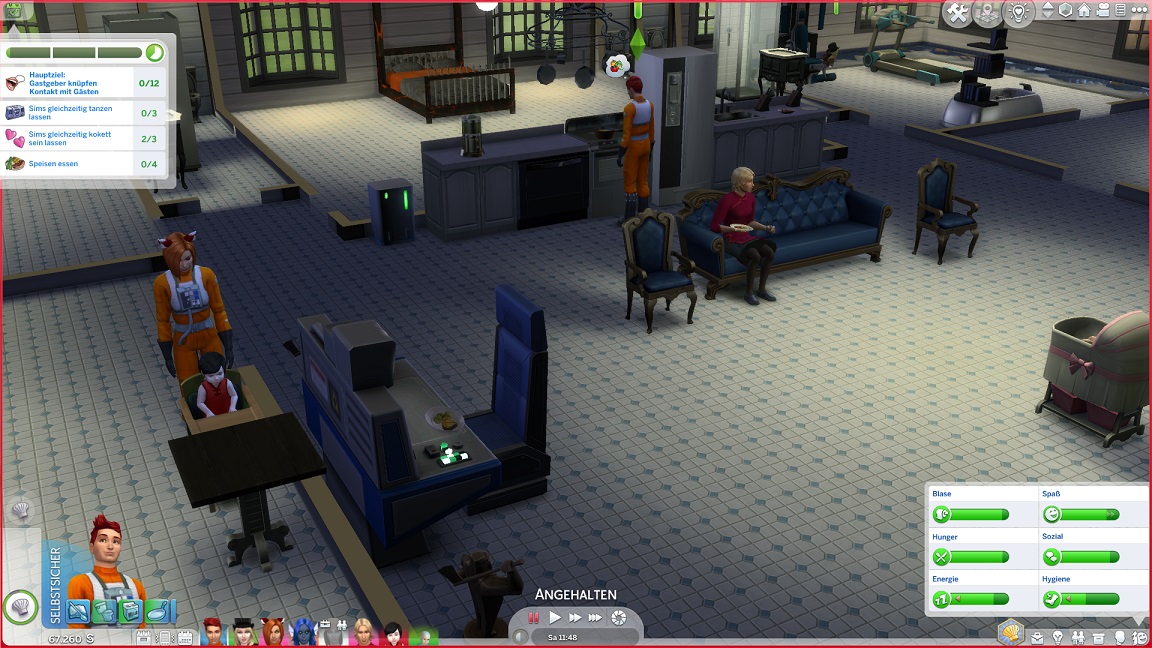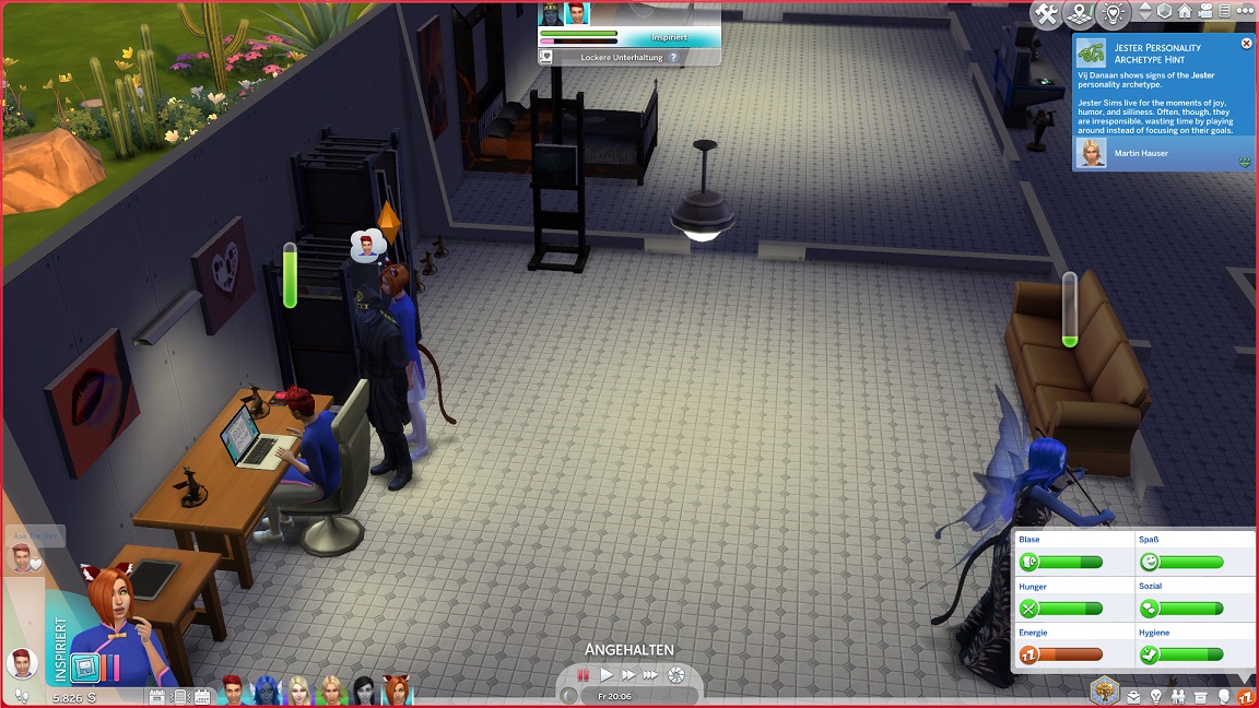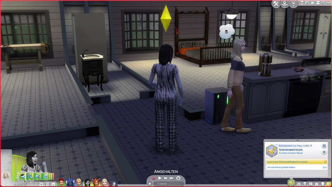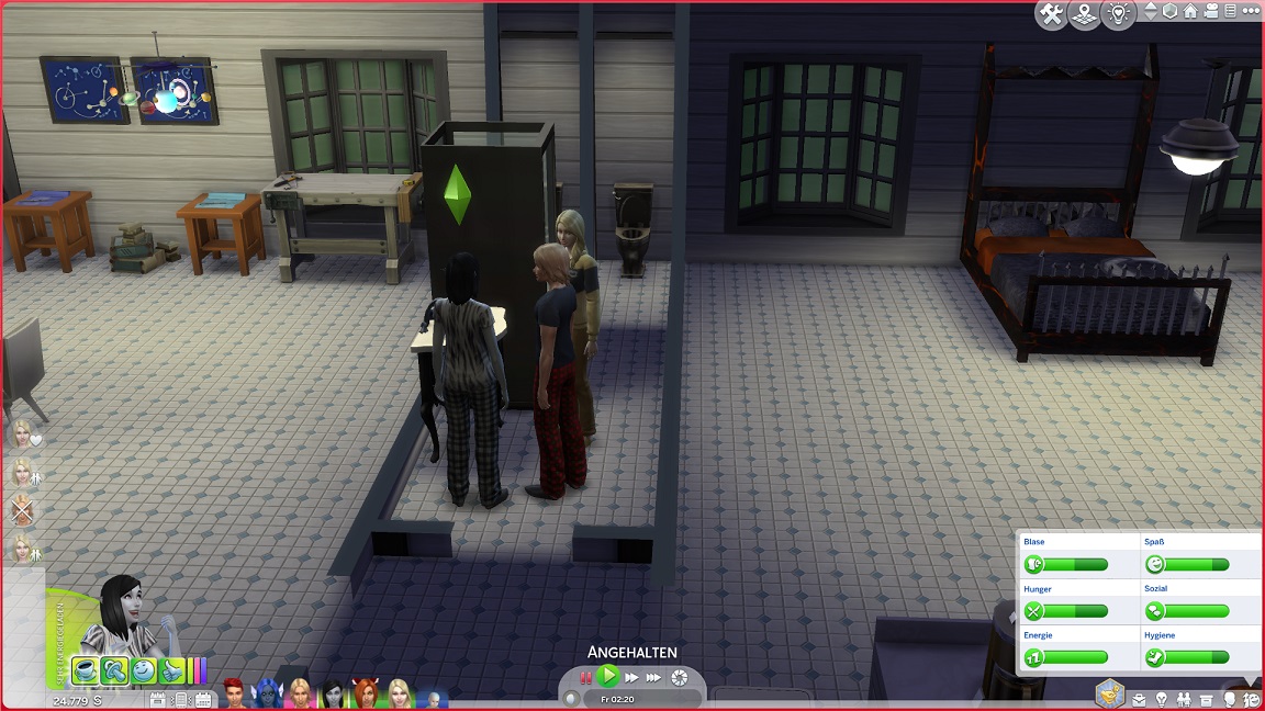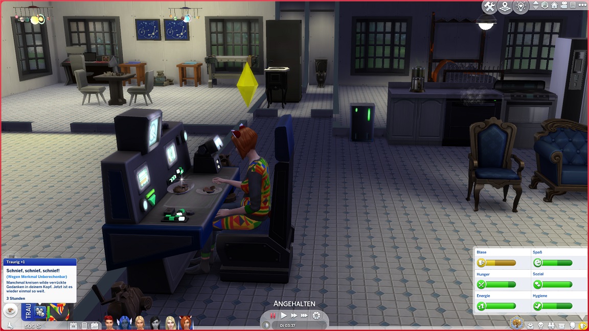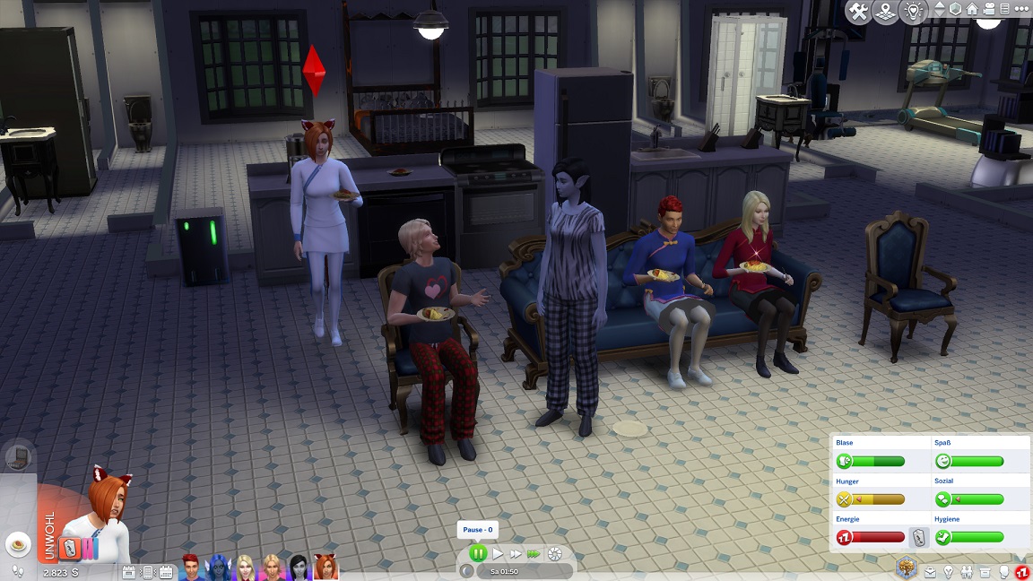 Montags, beim Frühstück, als die Reste des Mitternachtssnacks nicht mehr für alle reichten. Aktuell herrscht eine markante Zweiteilung in der Mannschaft vor: die einen arbeiten hart daran, für ihre Bestrebungen Dinge herzustellen und Fähigkeiten zu leveln (Lisa, Lurlei und Jack), während die andere Hälfte vor allem vor sozialen Herausforderungen steht (Andromeda, Telys und Martin), bis bisweilen Auszeiten erlauben.