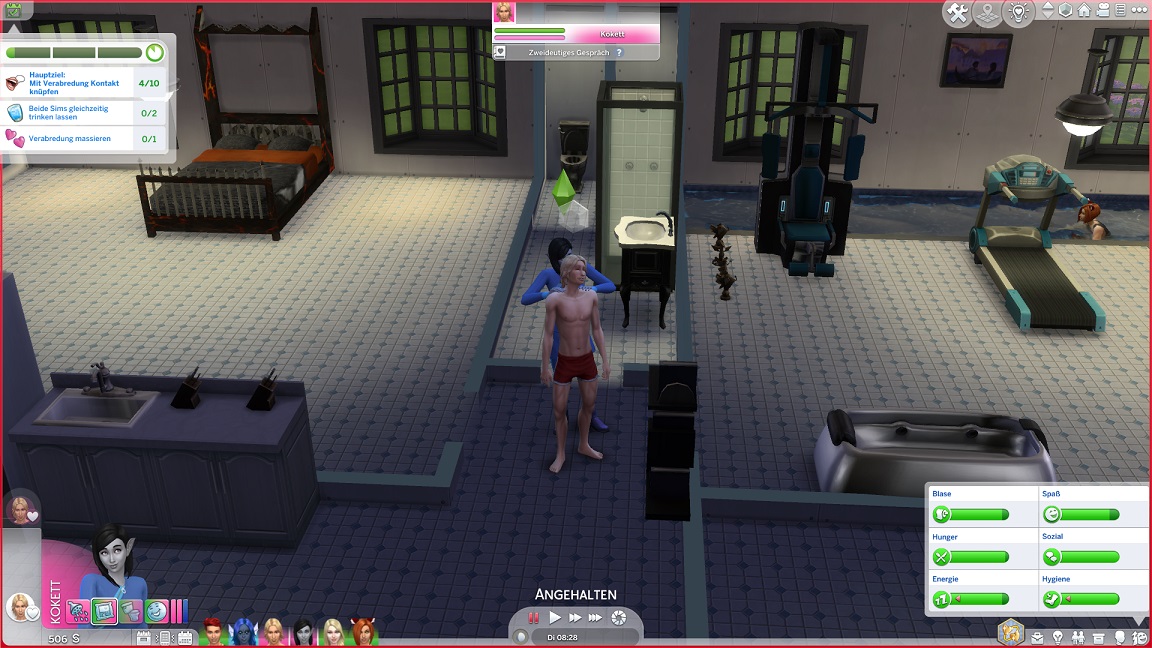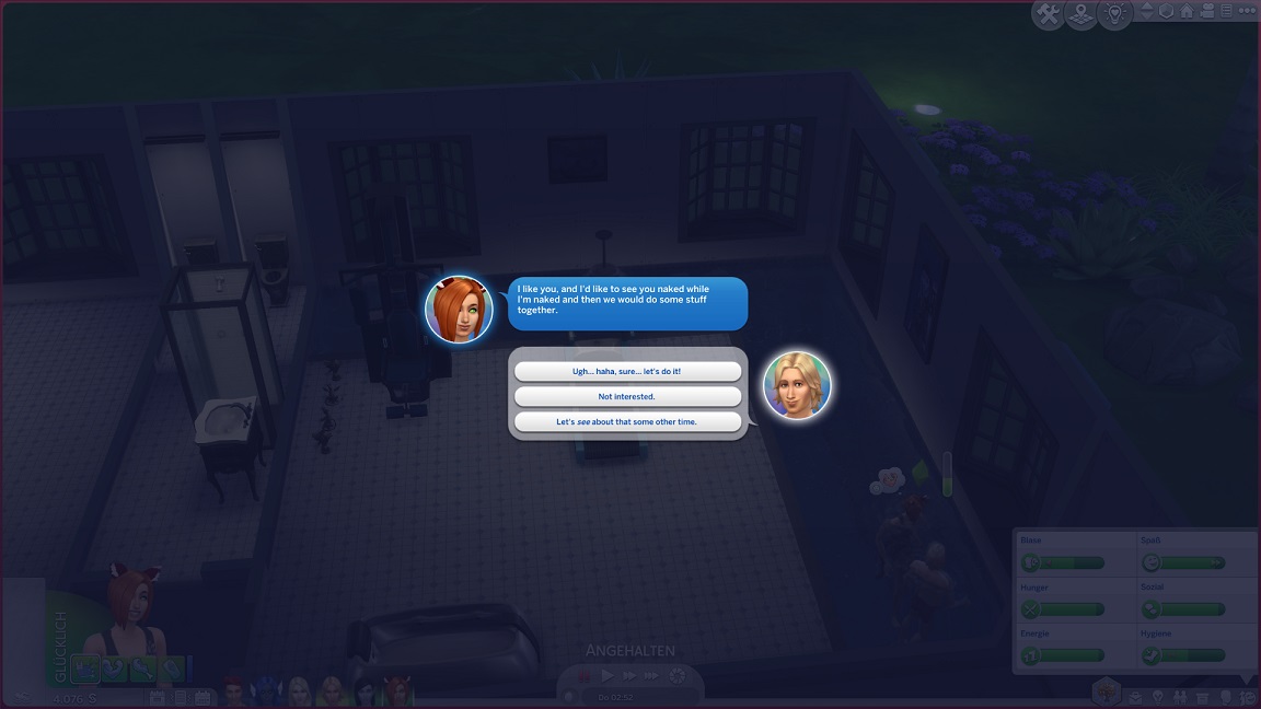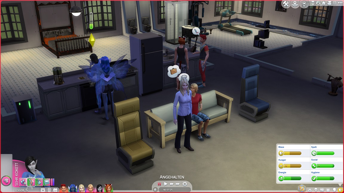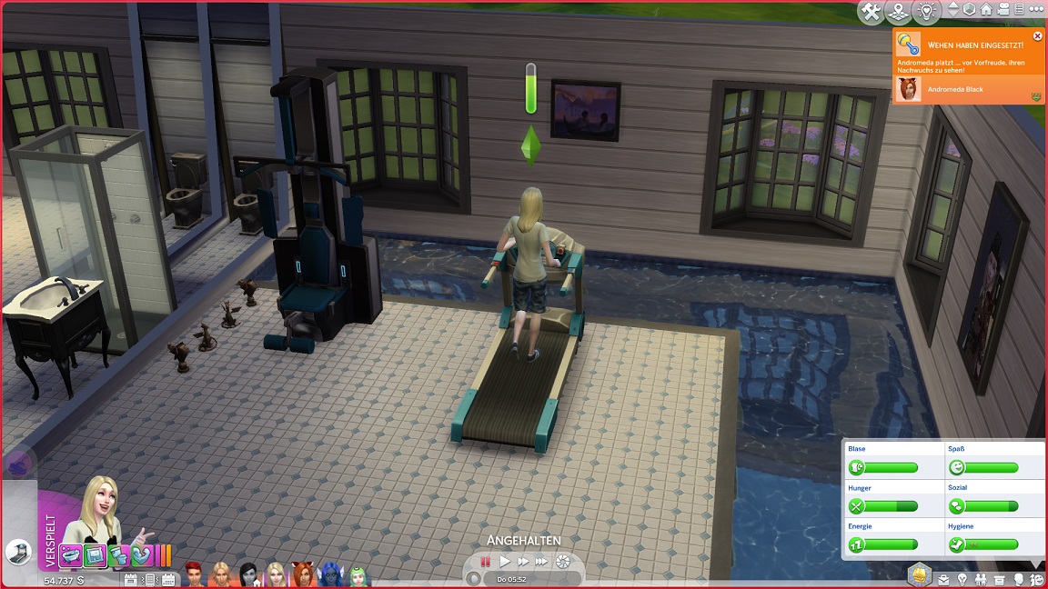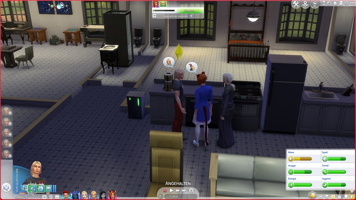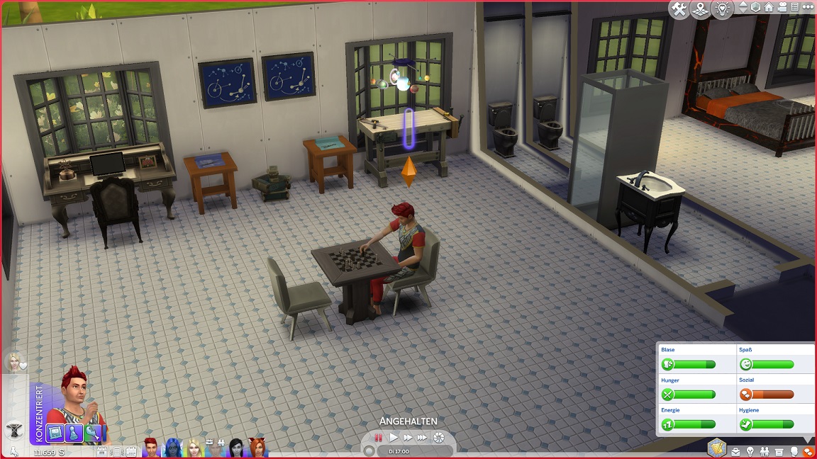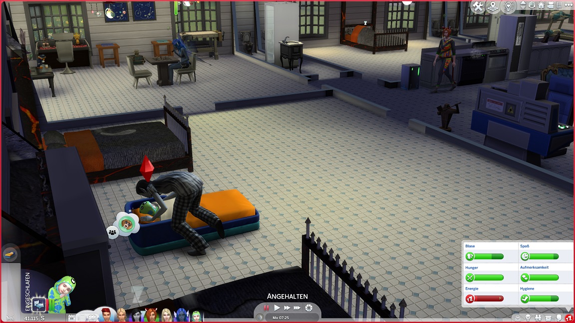 Montags, beim Frühstück, als die Reste des Mitternachtssnacks nicht mehr für alle reichten. Aktuell herrscht eine markante Zweiteilung in der Mannschaft vor: die einen arbeiten hart daran, für ihre Bestrebungen Dinge herzustellen und Fähigkeiten zu leveln (Lisa, Lurlei und Jack), während die andere Hälfte vor allem vor sozialen Herausforderungen steht (Andromeda, Telys und Martin), bis bisweilen Auszeiten erlauben.
