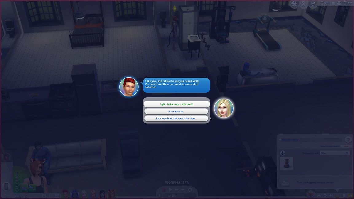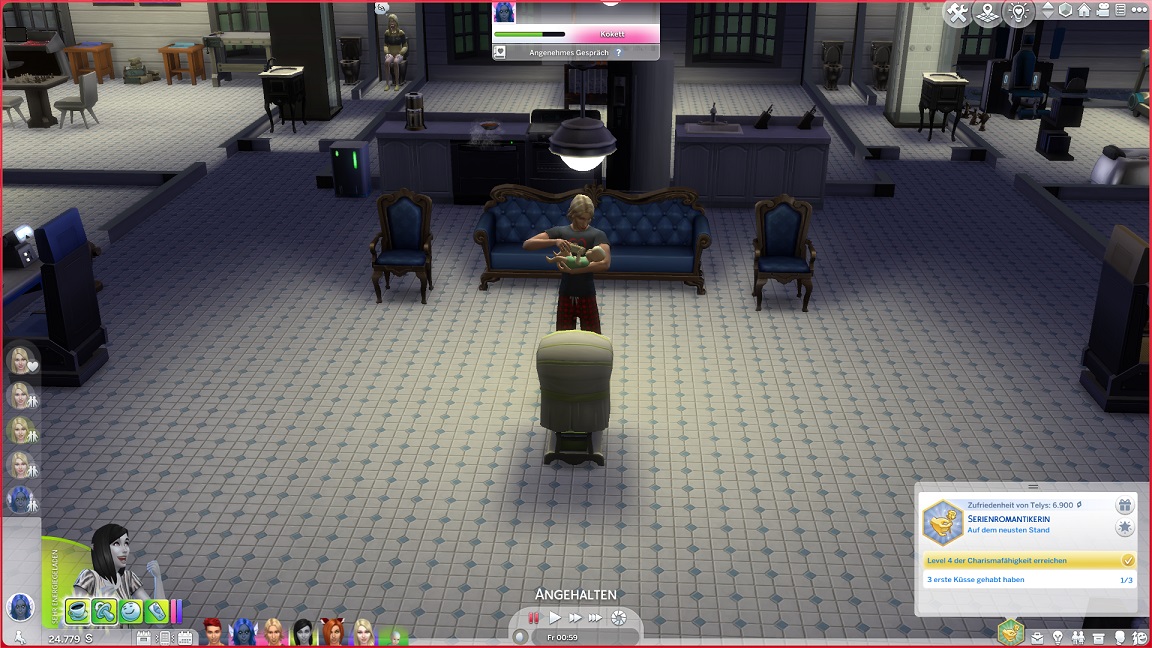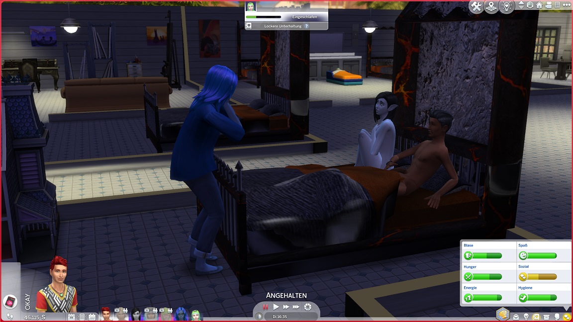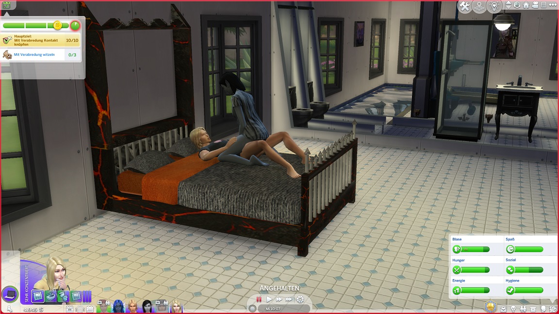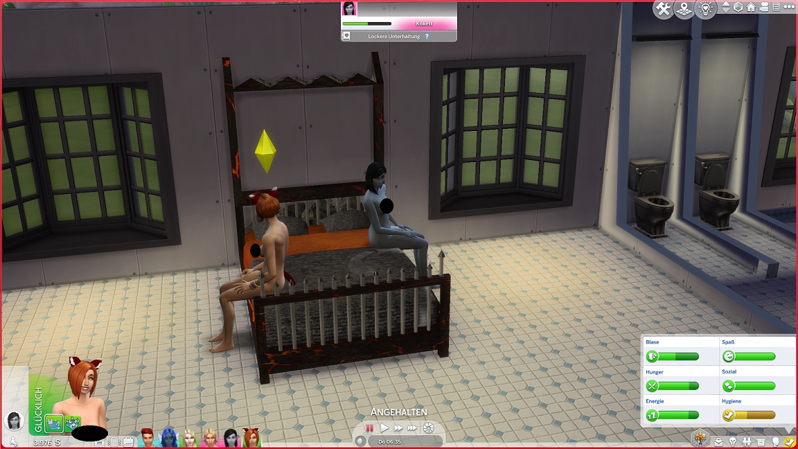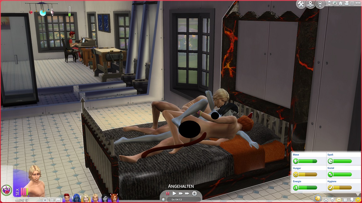 Bei ihren Küssbestrebungen landet Telys unversehens mit einem Nachbarn im Bett, wozu Lurlei hinzustößt.